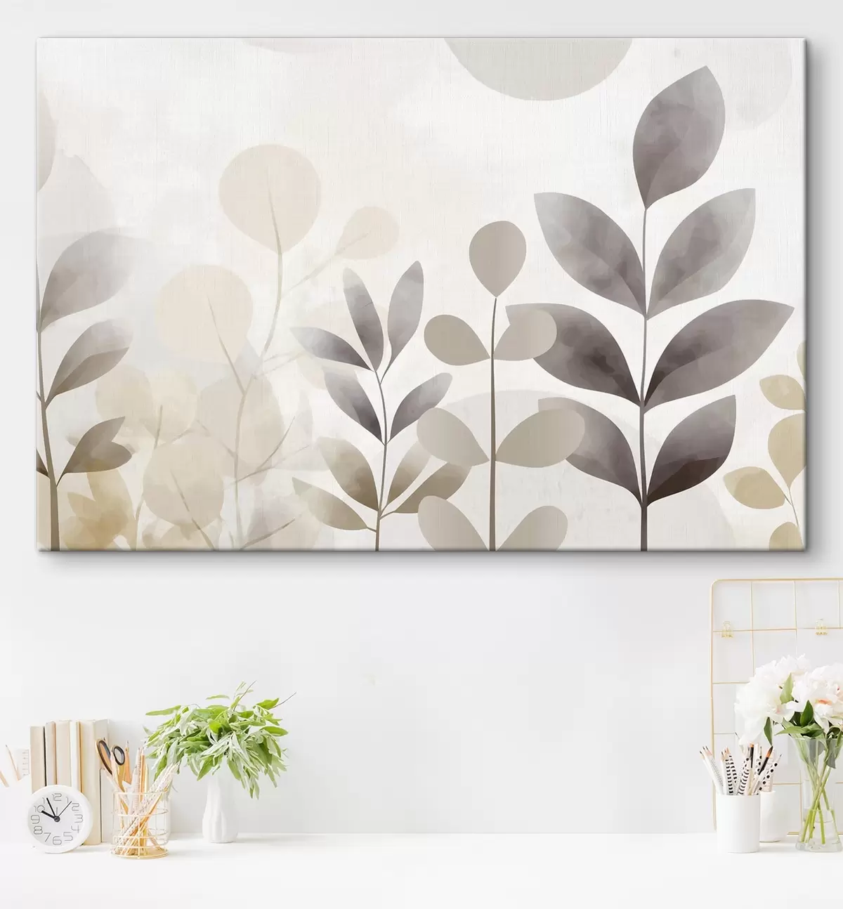 Quadri Silhouette di foglie nei toni del beige e del grigio, minimalismo Nr s48487