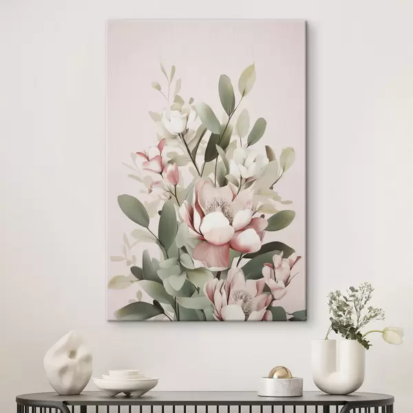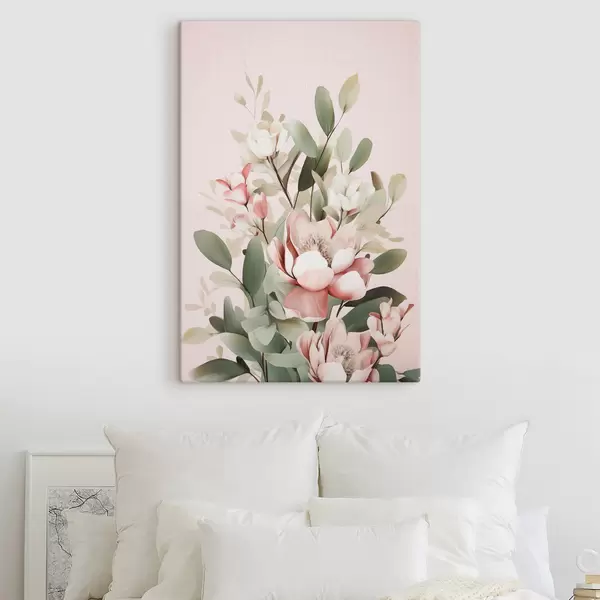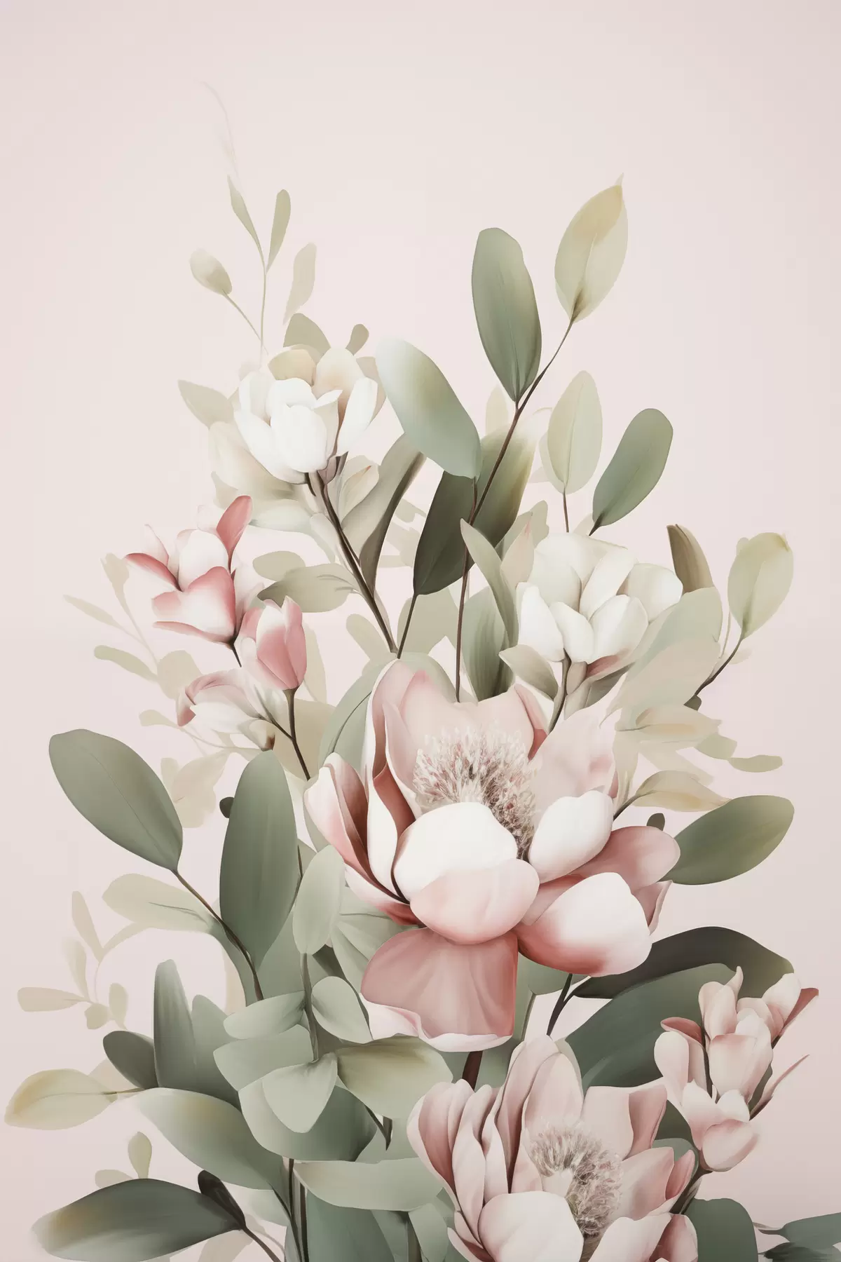 Quadri Un bouquet di fiori dai colori pastello con foglie di eucalipto, su uno sfondo rosa pallido Nr s48727
