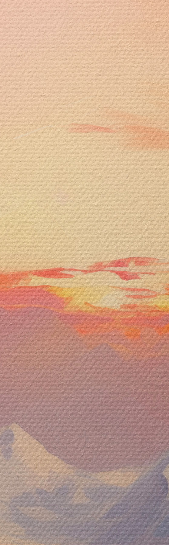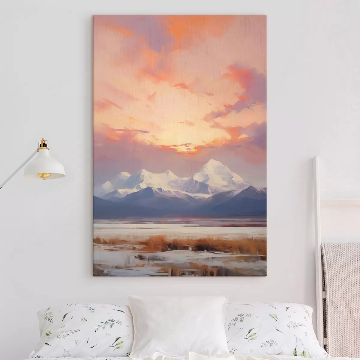 Quadri Montagne innevate sotto un cielo dai vivaci toni arancioni e rosa, punteggiato di nuvole Nr s48742