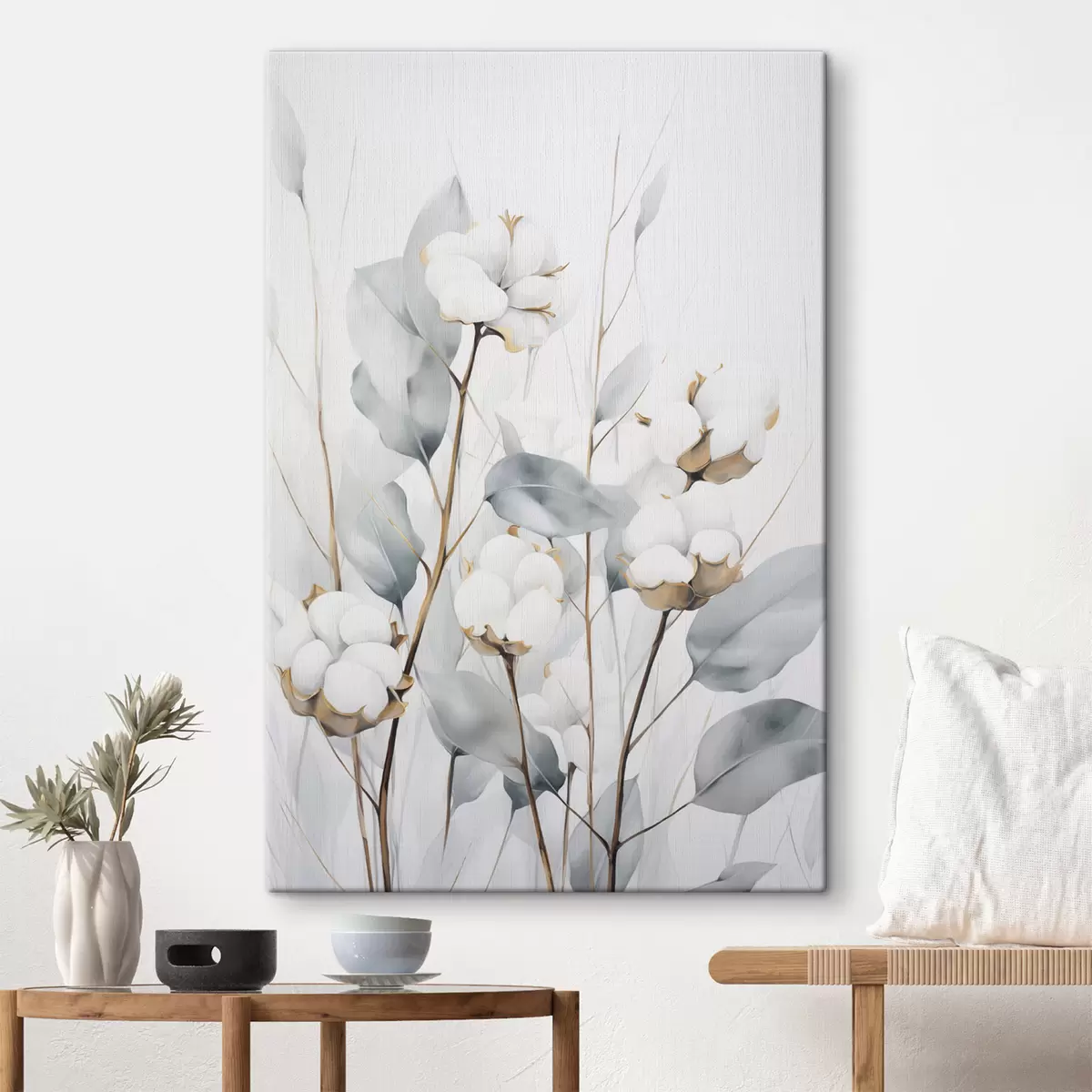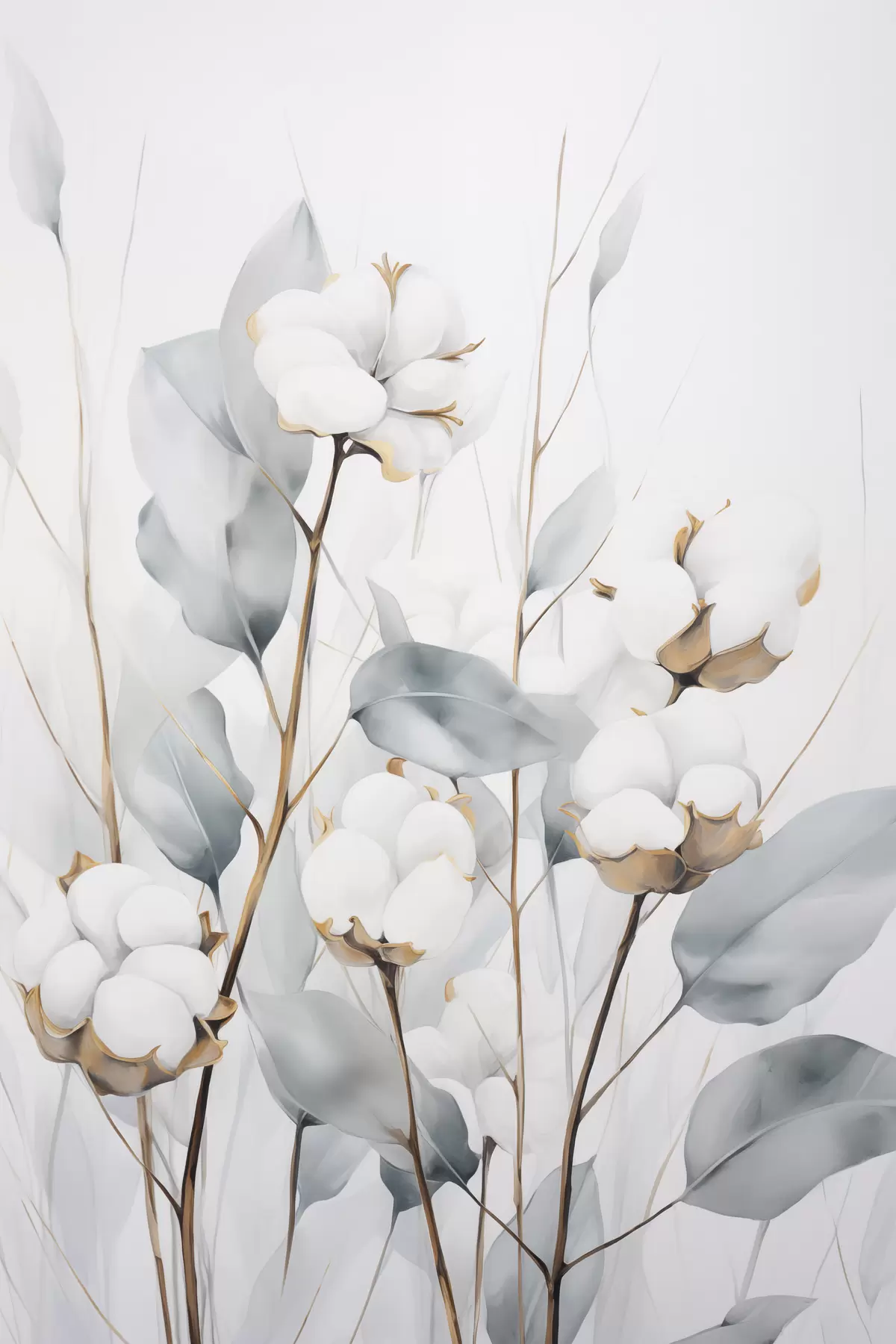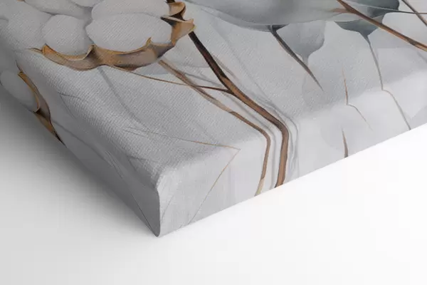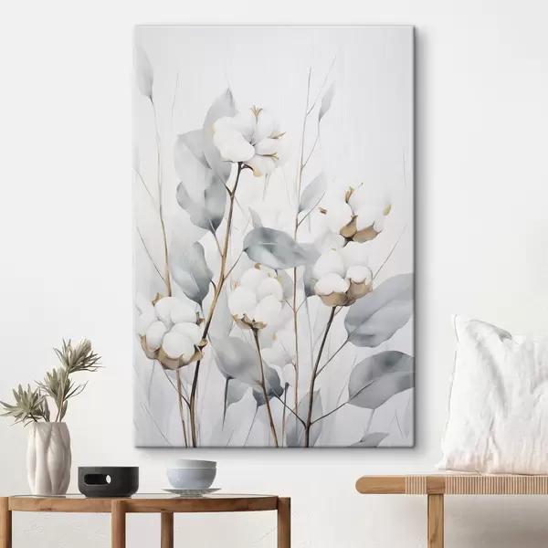 Quadri Pianta di cotone bianca con foglie di un tenue blu-verde su uno sfondo chiaro Nr s48743