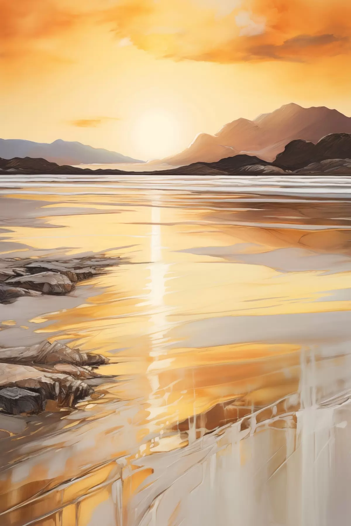 Quadri Un paesaggio con un fiume e le montagne sotto un cielo arancione e caldo, al tramonto Nr s48756