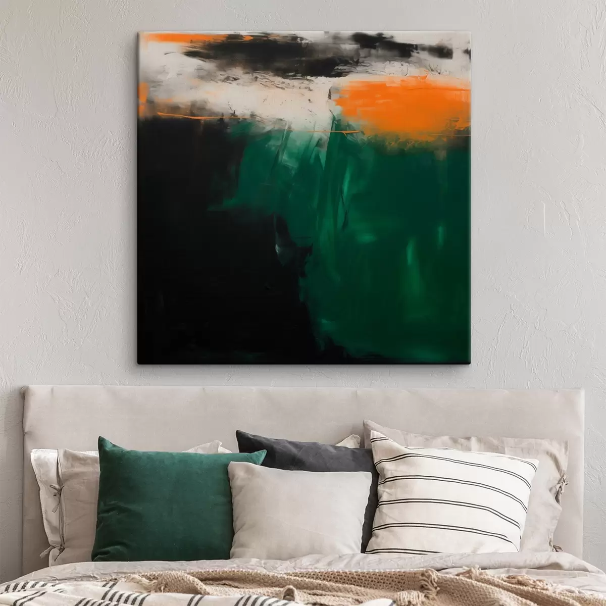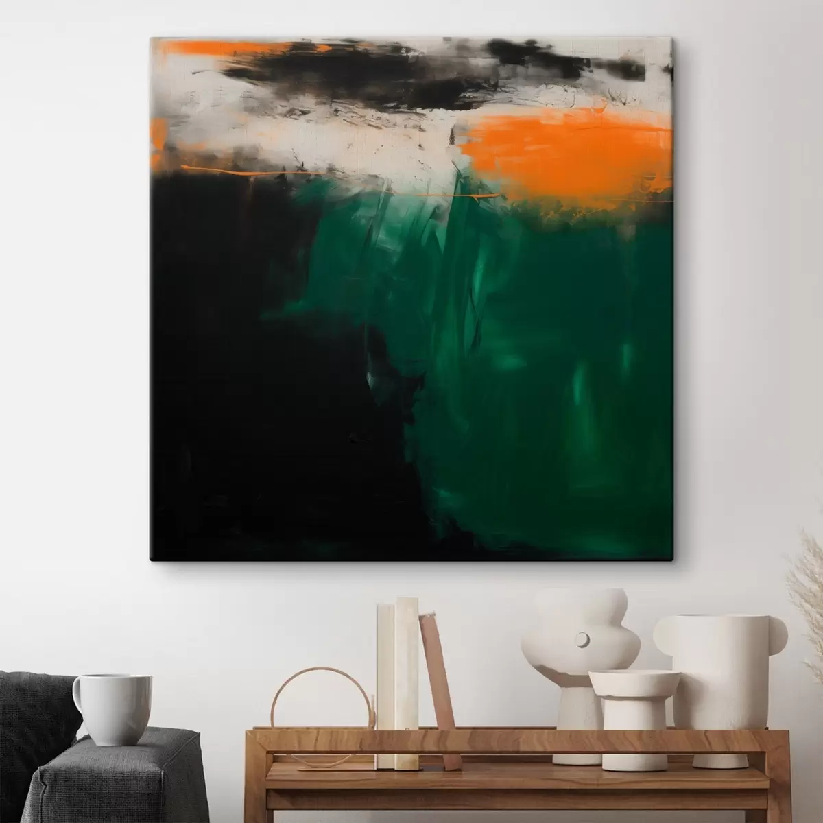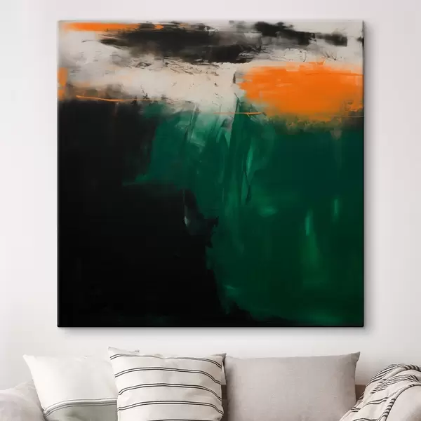 Quadri Un'opera astratta caratterizzata da accenti arancioni e pennellate di verde intenso, realizzata in uno stile pittorico contemporaneo Nr s48865