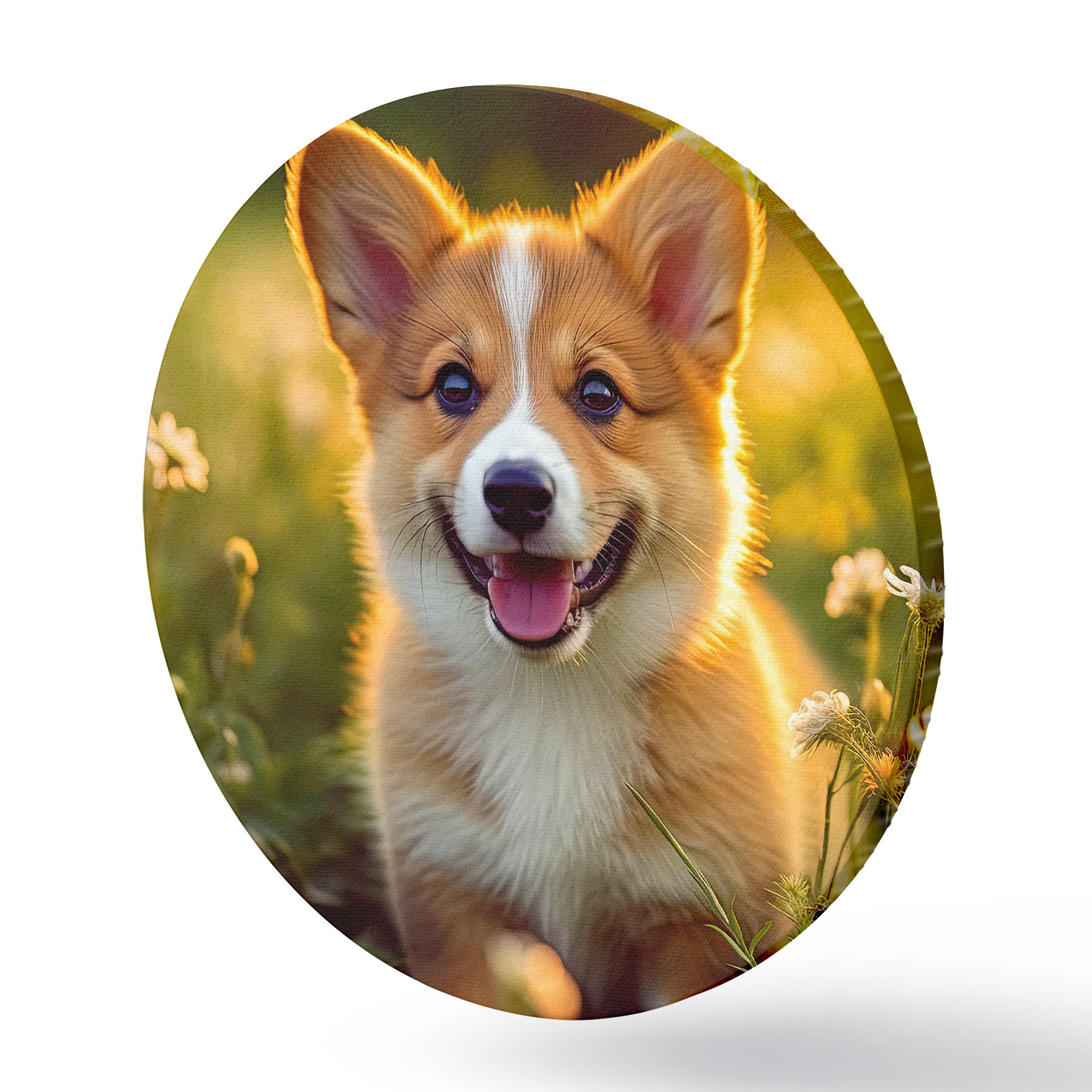 Quadri rotondi Cucciolo di Corgi tra i fiori di campo r33532