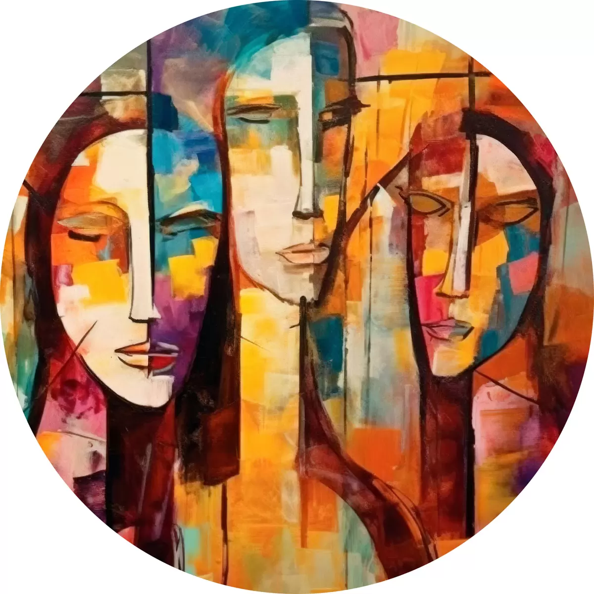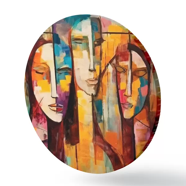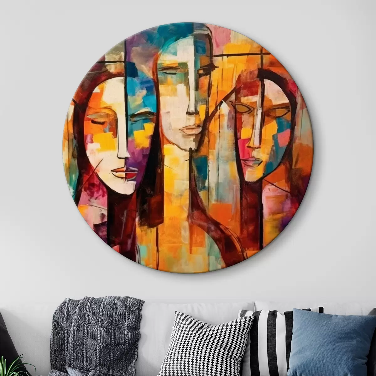 Quadri rotondi 3 volti surreali in tonalità arancione acceso r33845