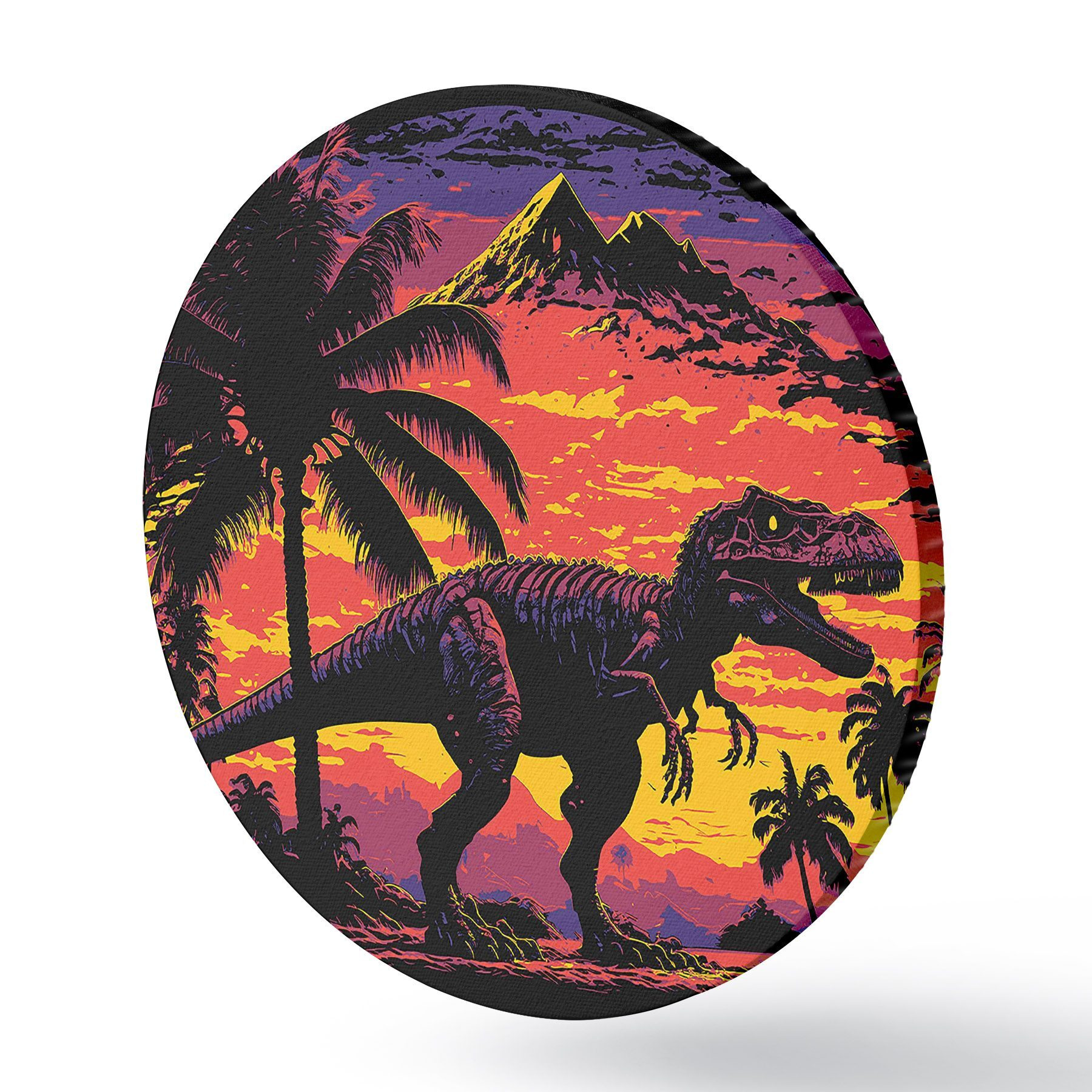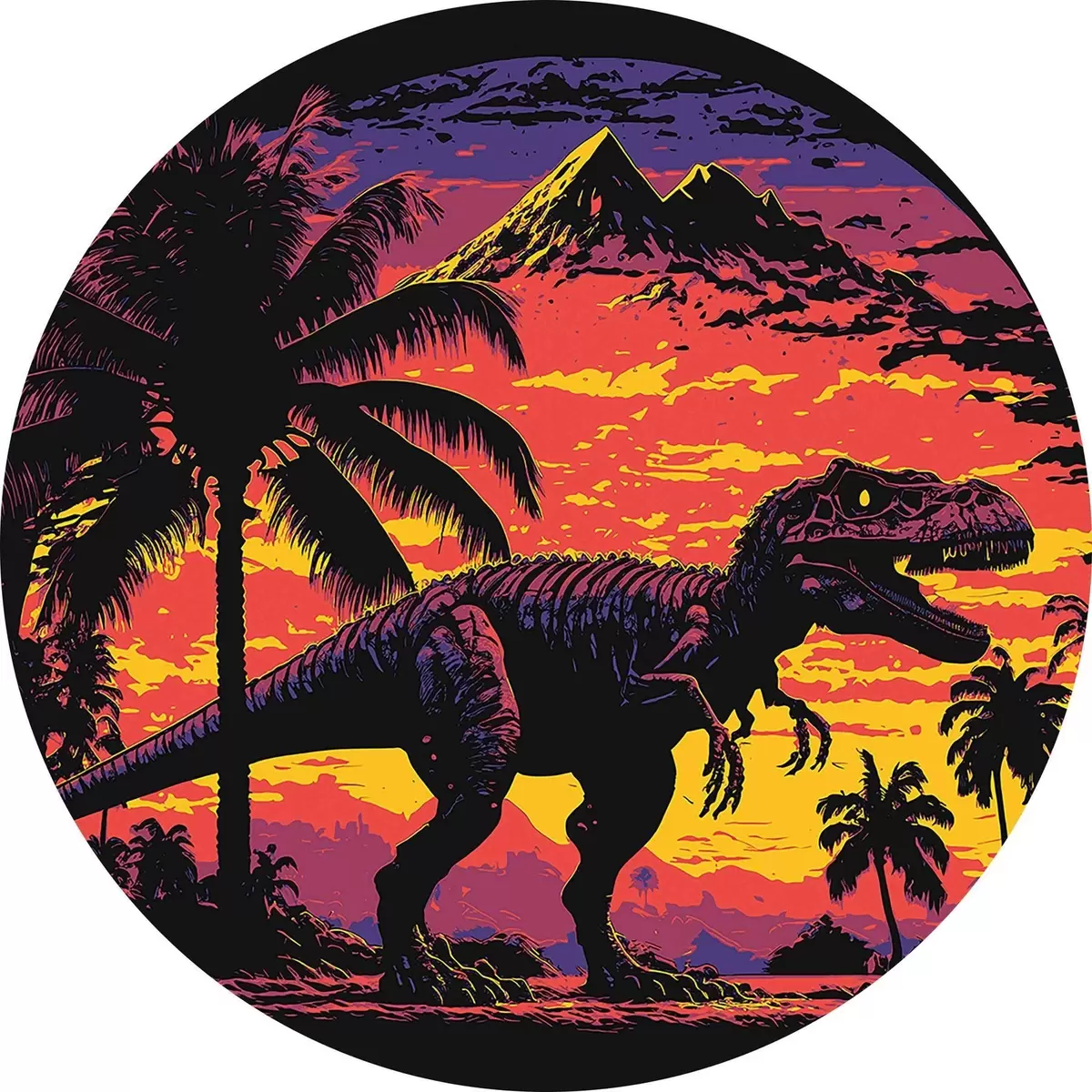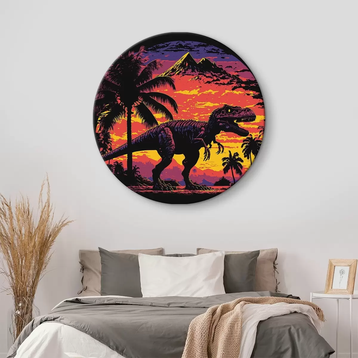 Quadri rotondi Dinosauro al tramonto tra le palme r33894