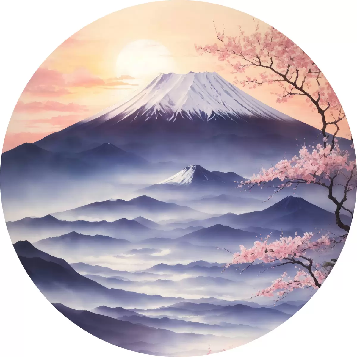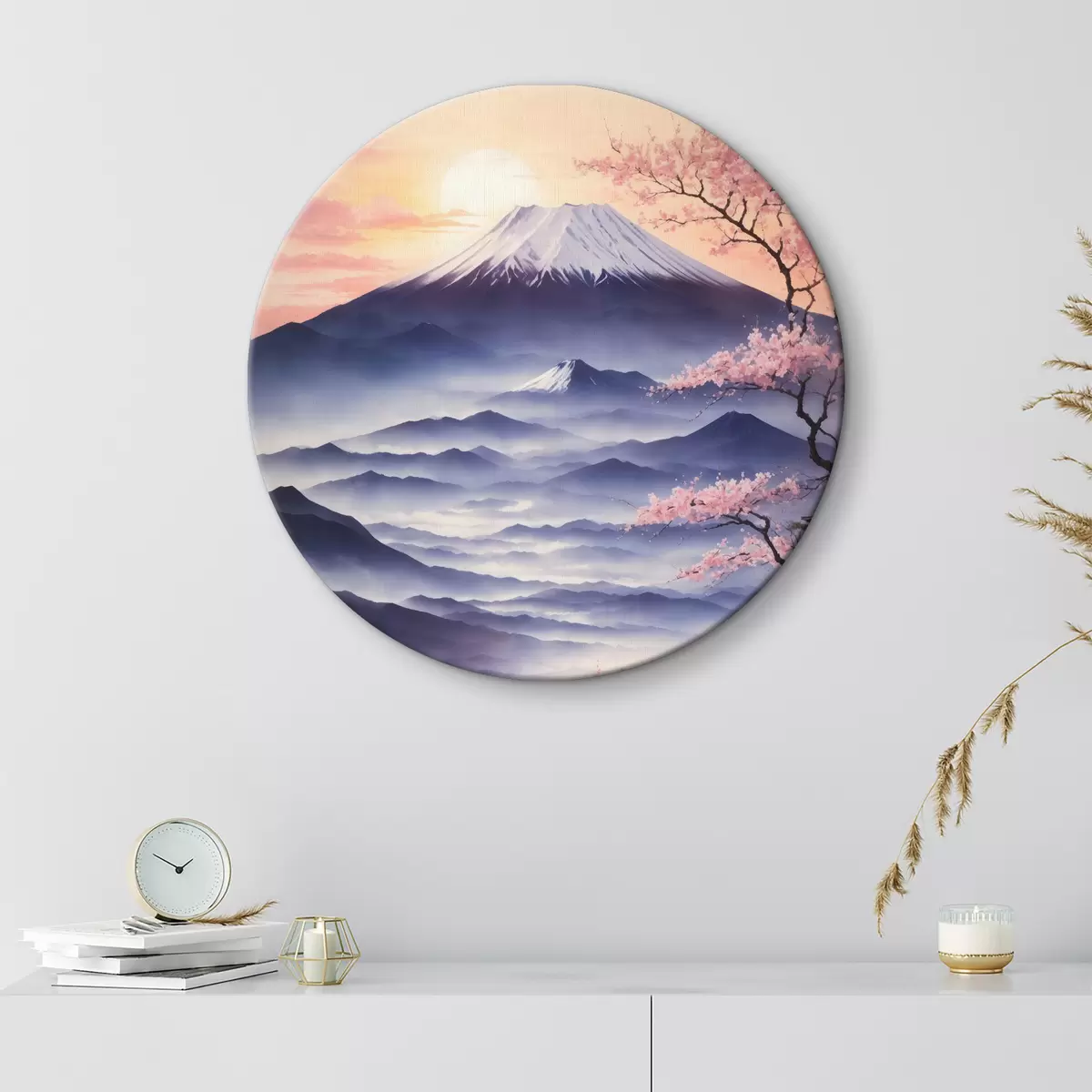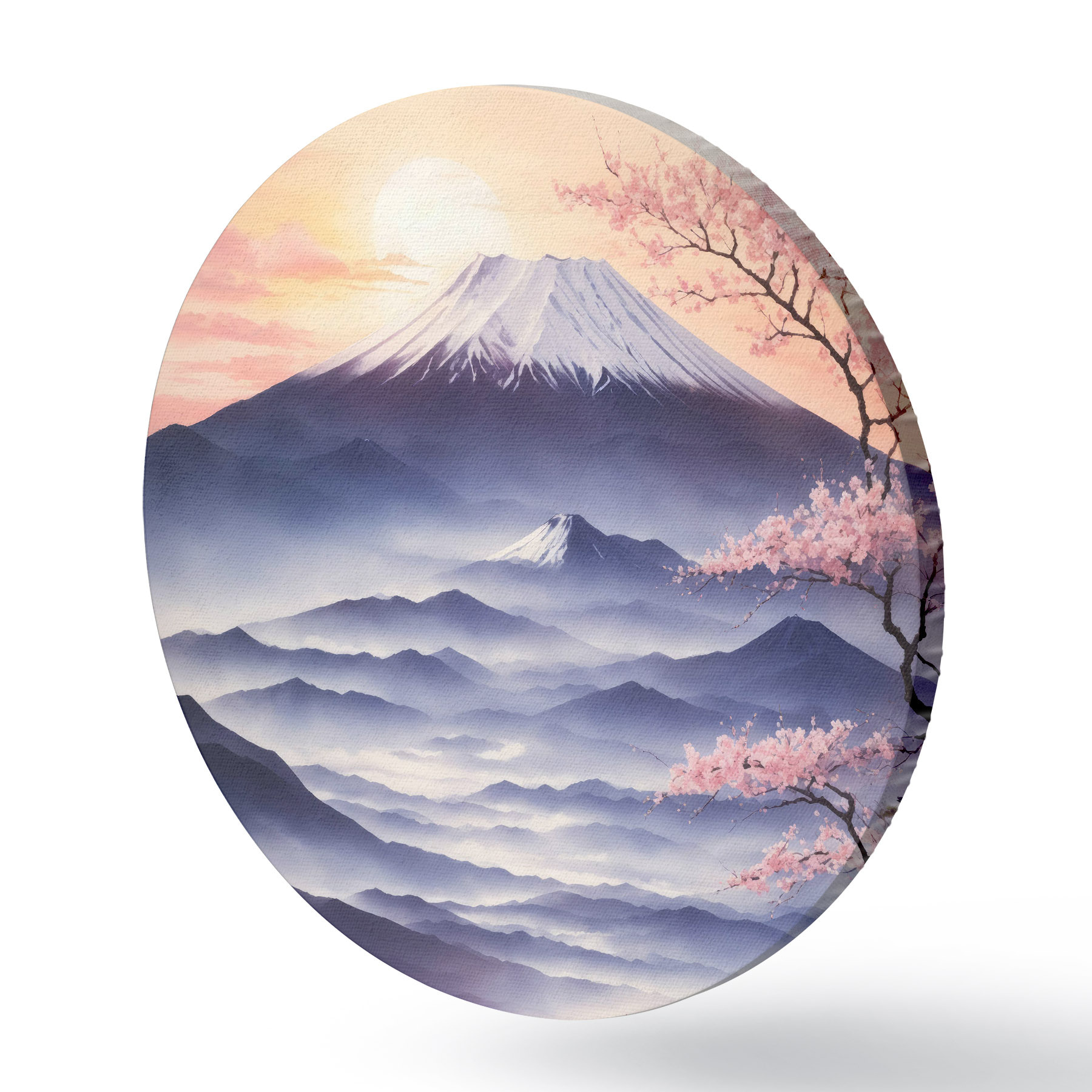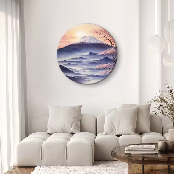 Quadri rotondi Vista di un vulcano tranquillo con una cima innevata r36233