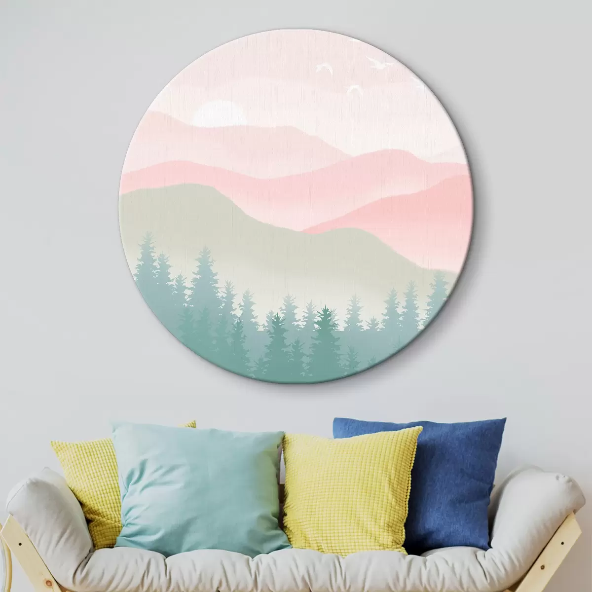Quadri rotondi Montagne nebbiose con foresta di pini, colori naturali tenui, rosa e verde r36394