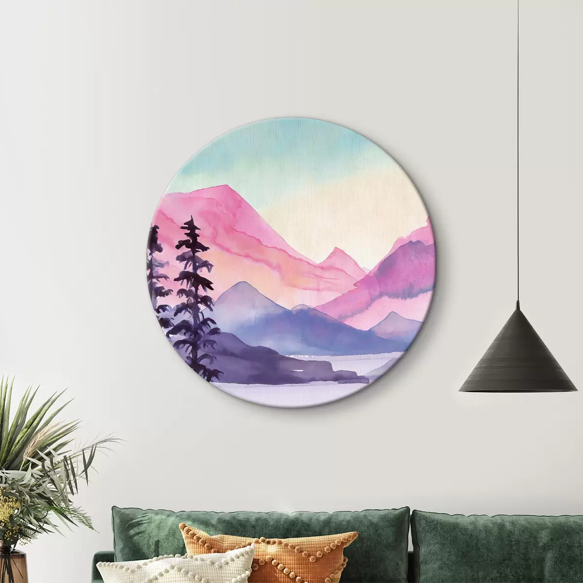 Quadri rotondi Paesaggio montano acquerellato, alba, colori tenui viola, rosa e blu r36496