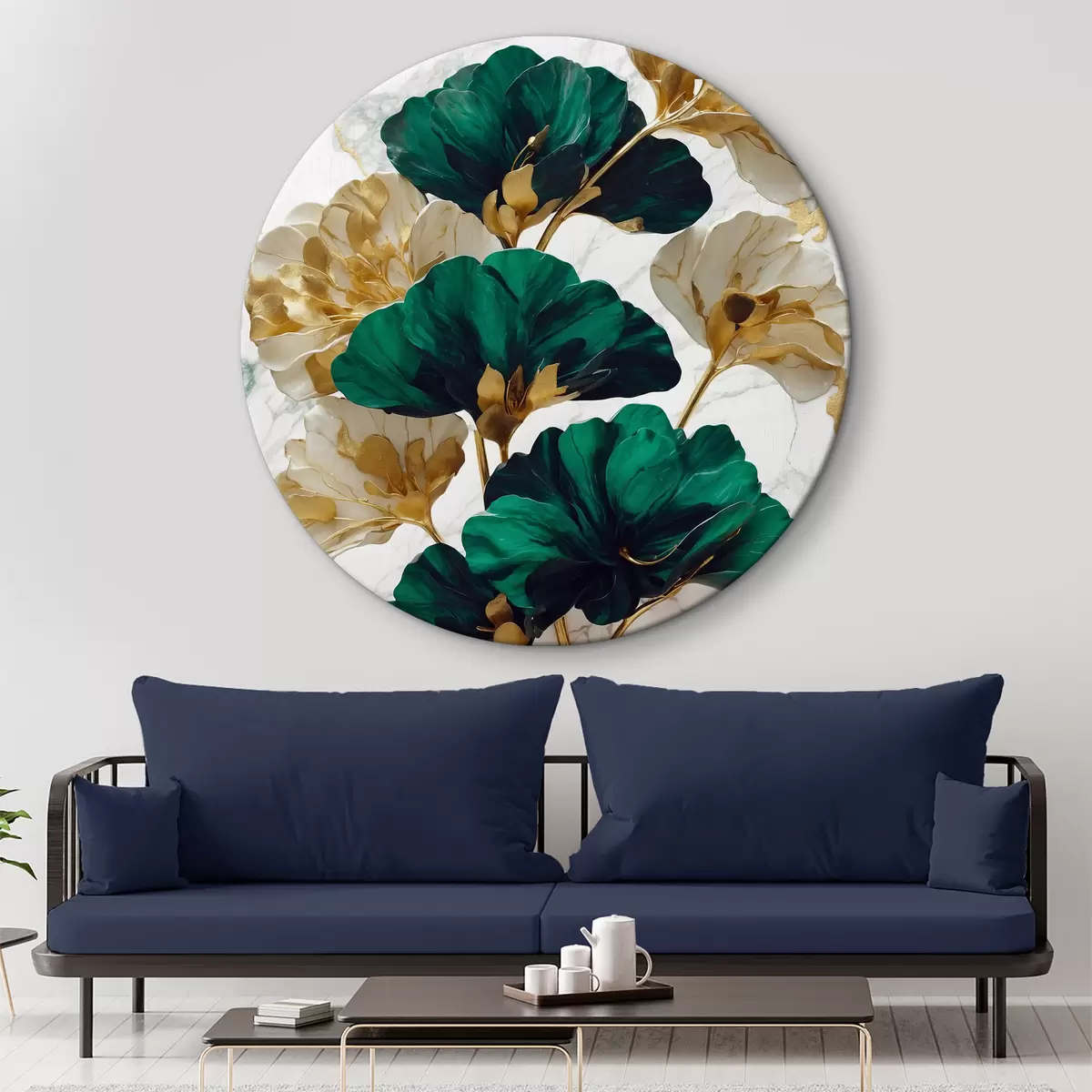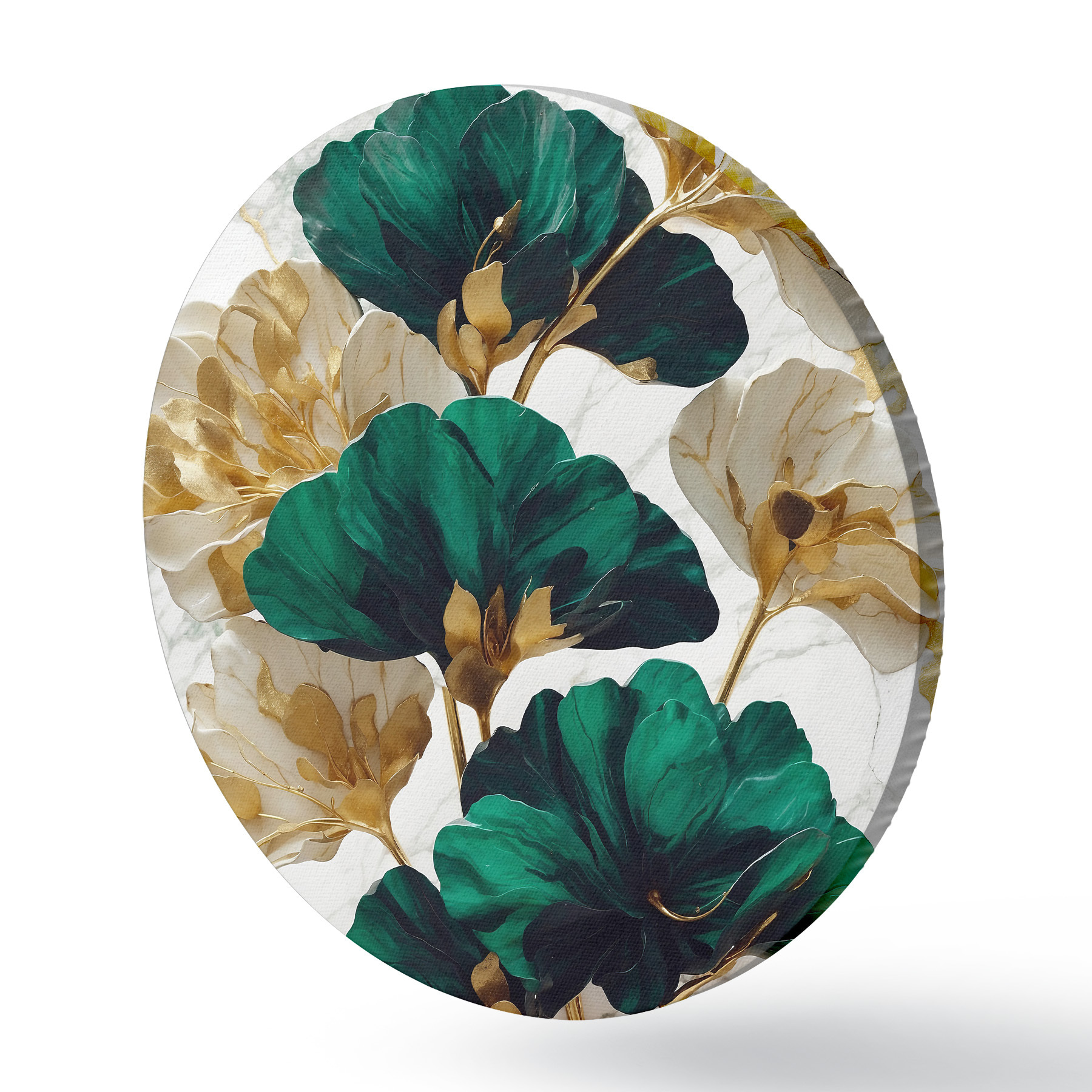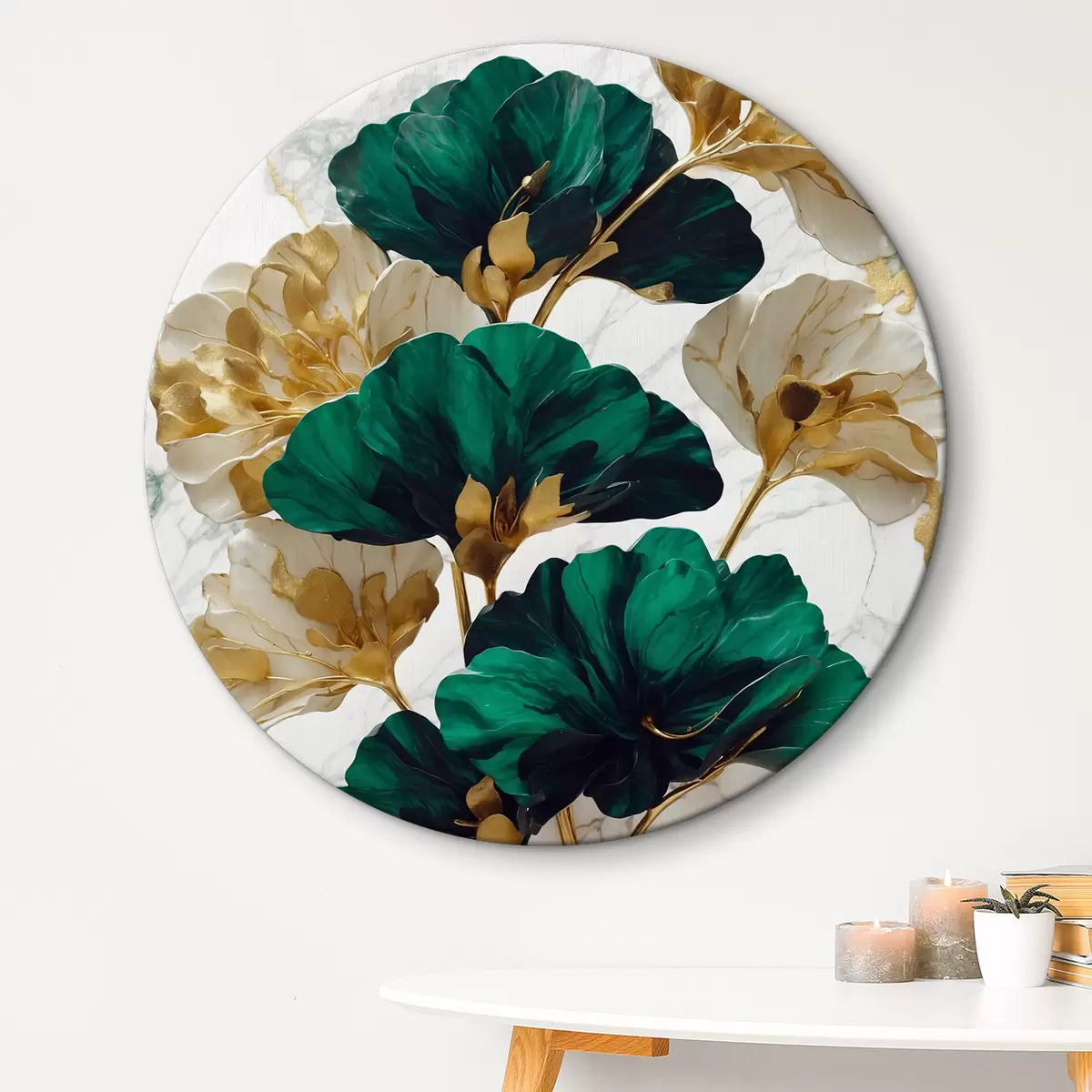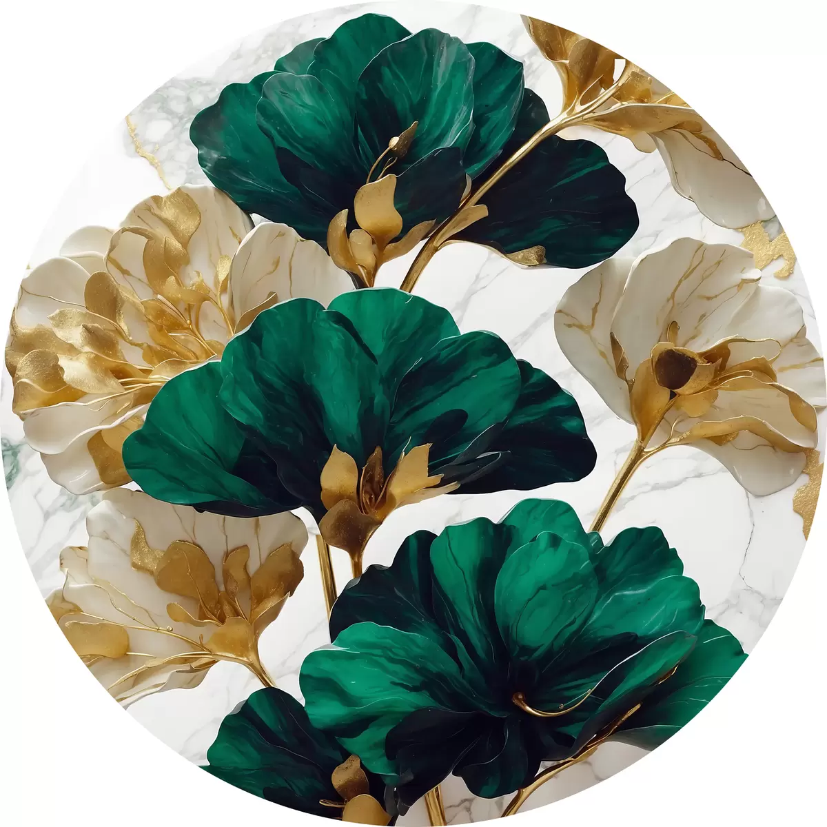 Quadri rotondi Fiori verdi e bianchi su sfondo di marmo bianco r36646
