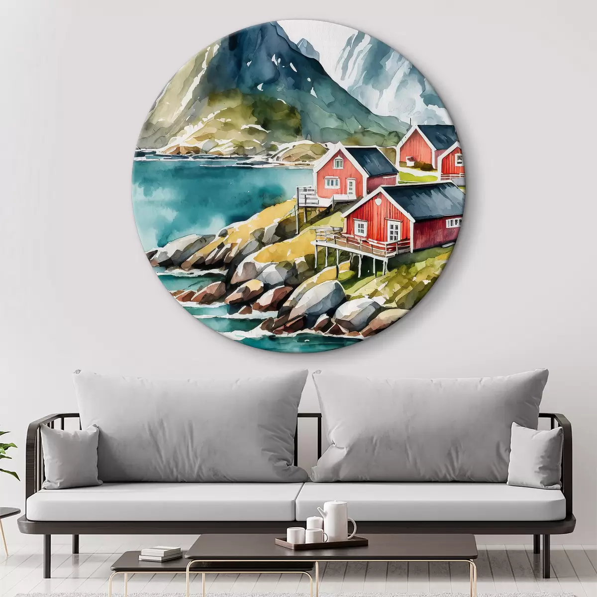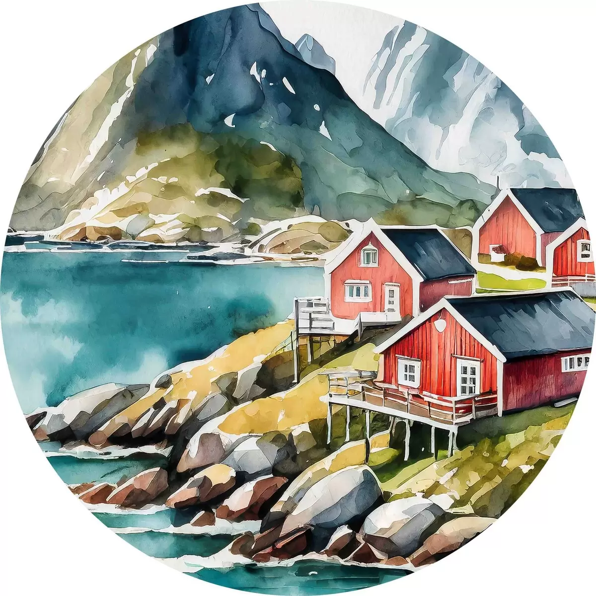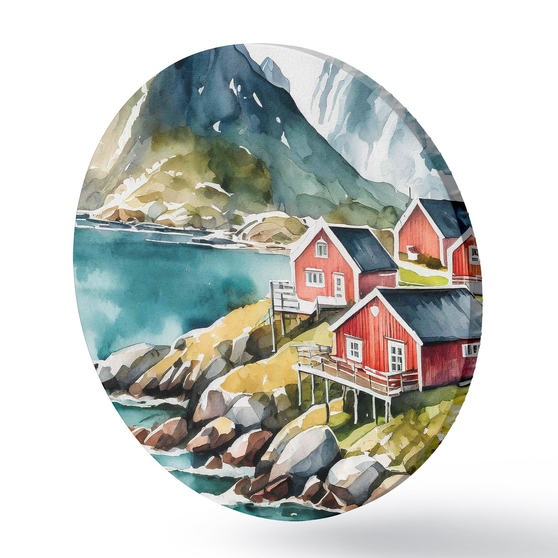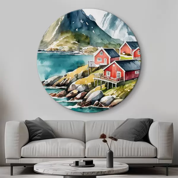 Quadri rotondi Acquerello di case su una collina vicino a un lago artificiale r36678