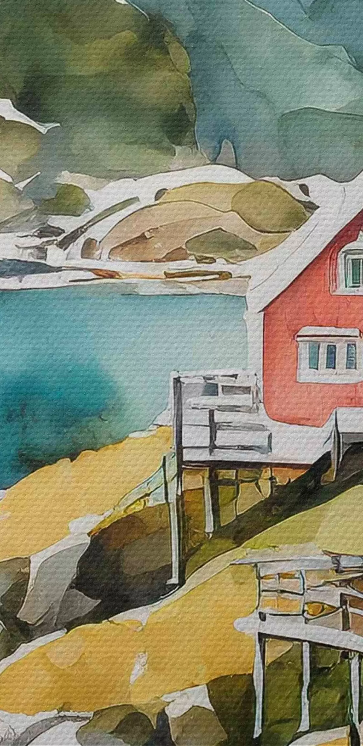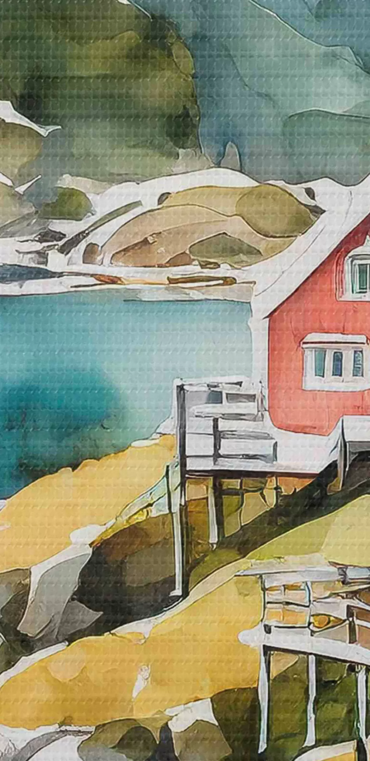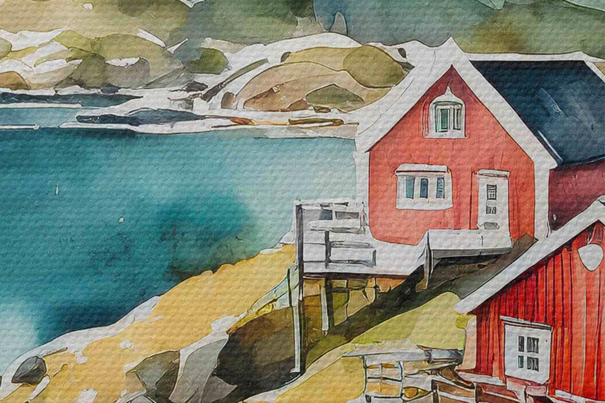 Immagine Acquerello di case su una collina vicino a un lago artificiale Nr r36678