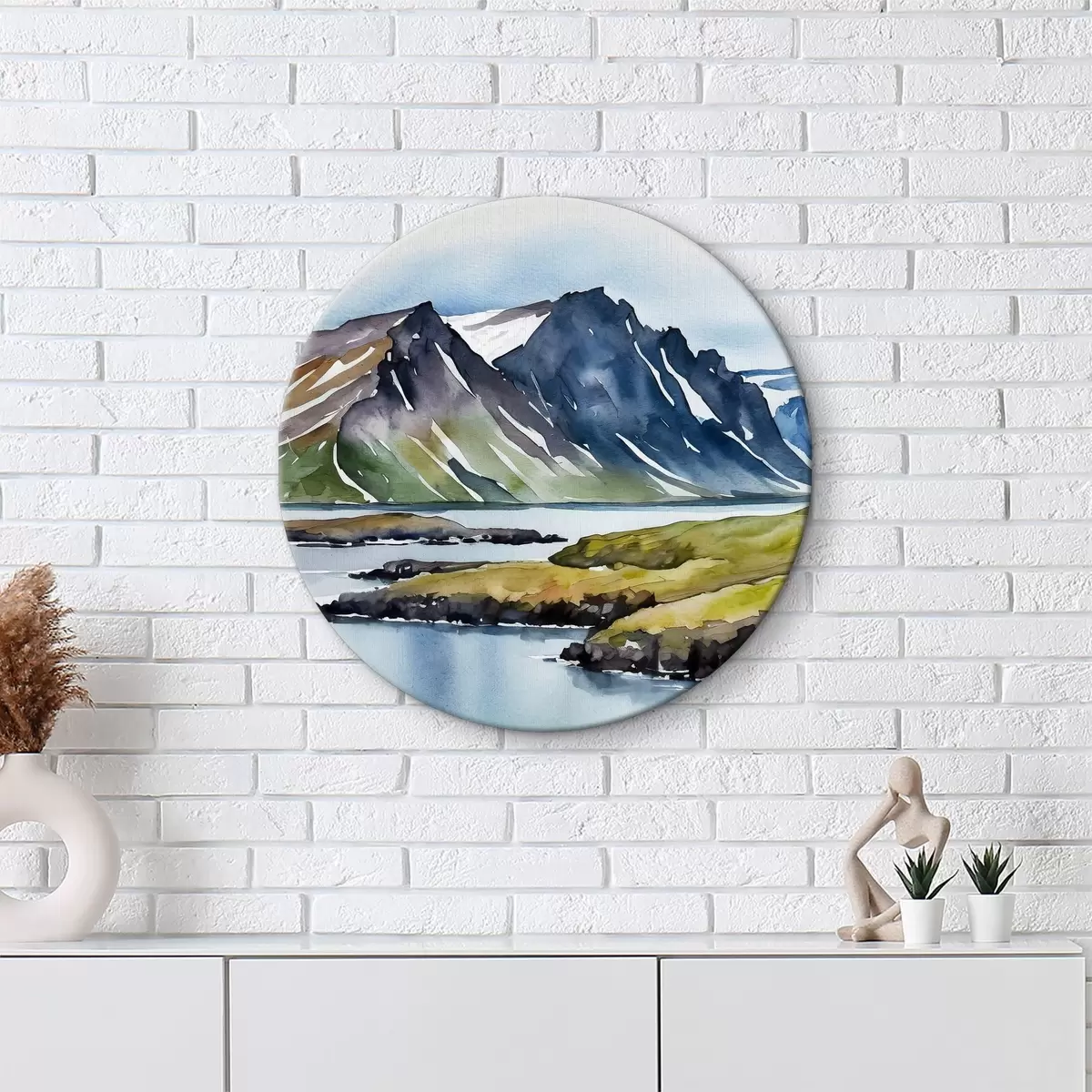 Quadri rotondi Acquerello raffigurante un lago e delle montagne r36679