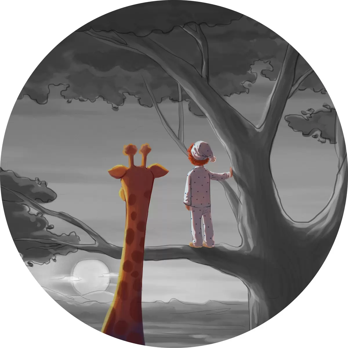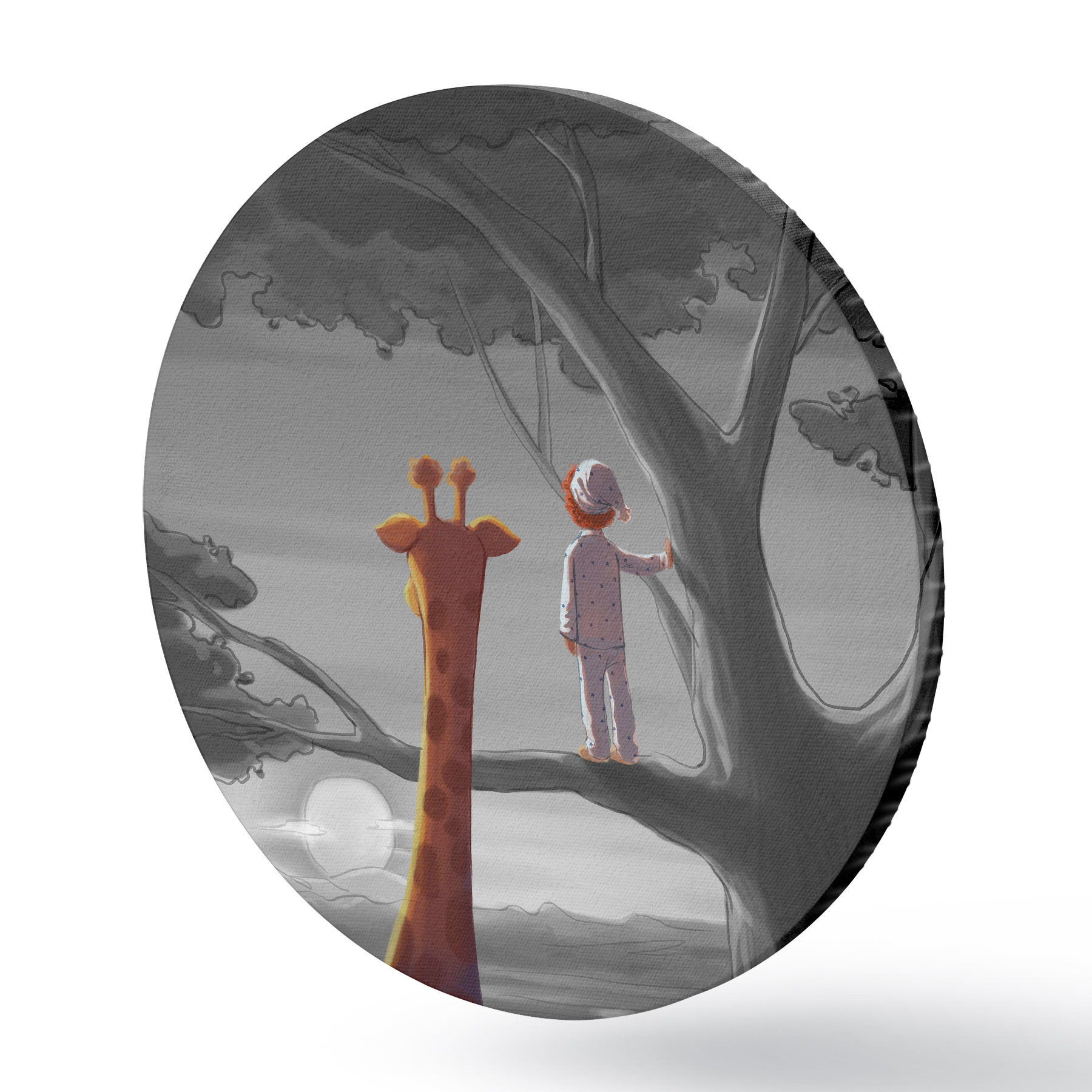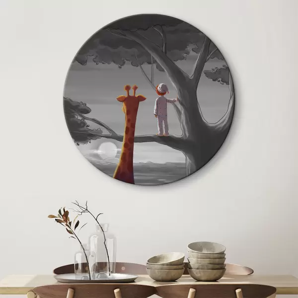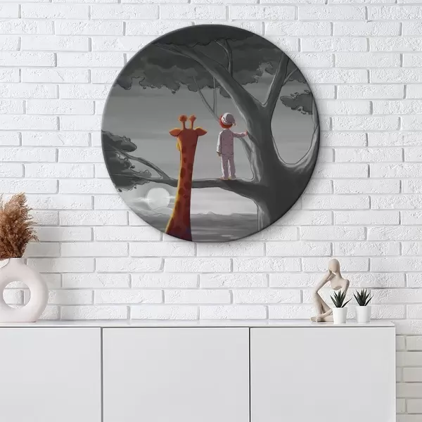 Quadri rotondi Giraffa e bambino in piedi su un albero r36700