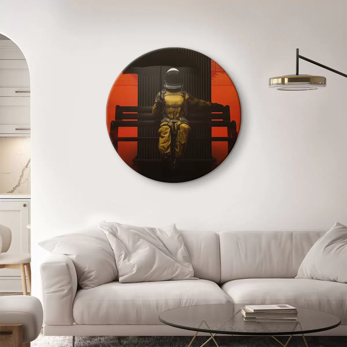 Quadri rotondi Una persona in abito da sera seduta su una panchina con un ombrello r36702
