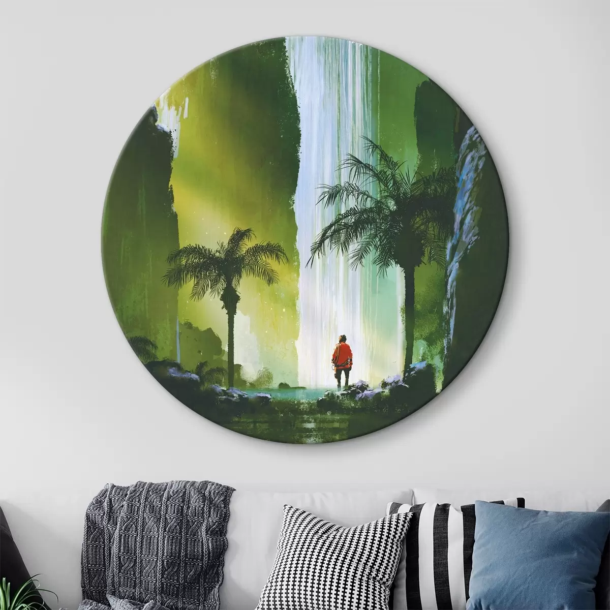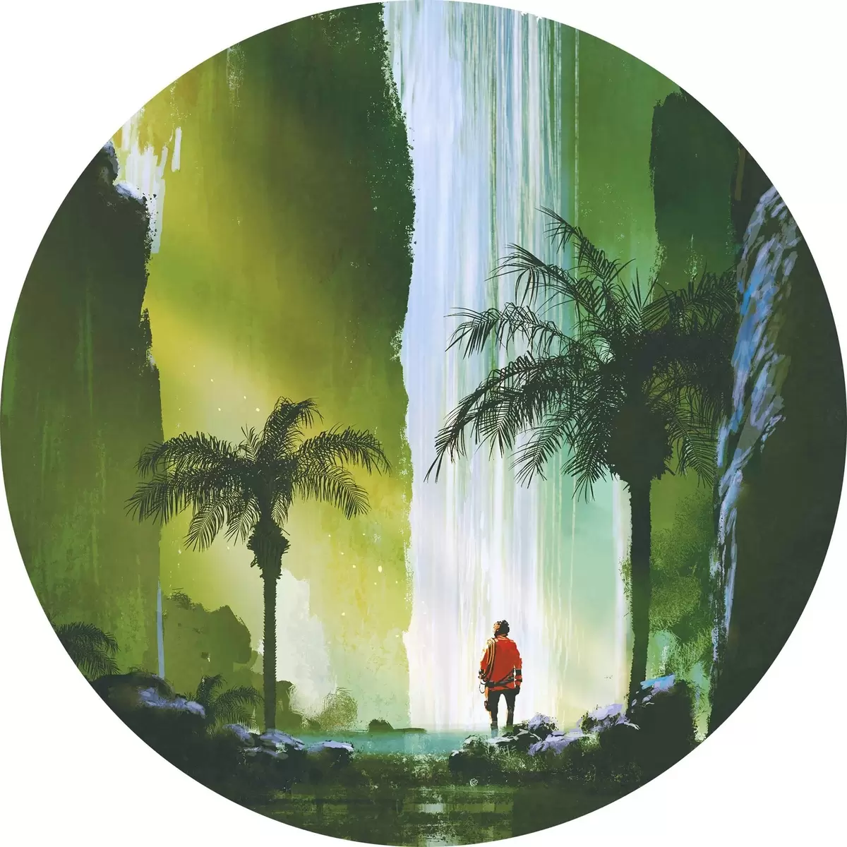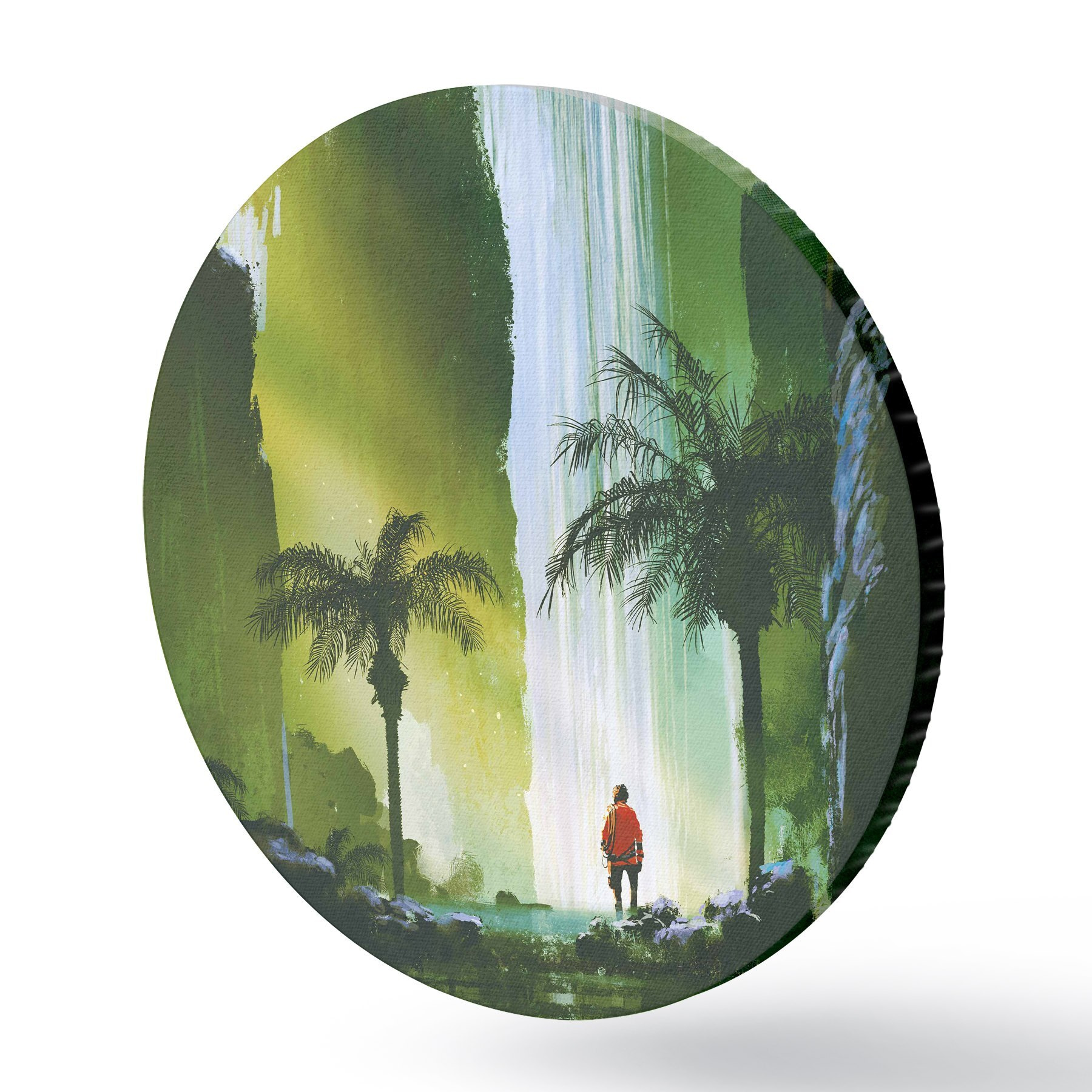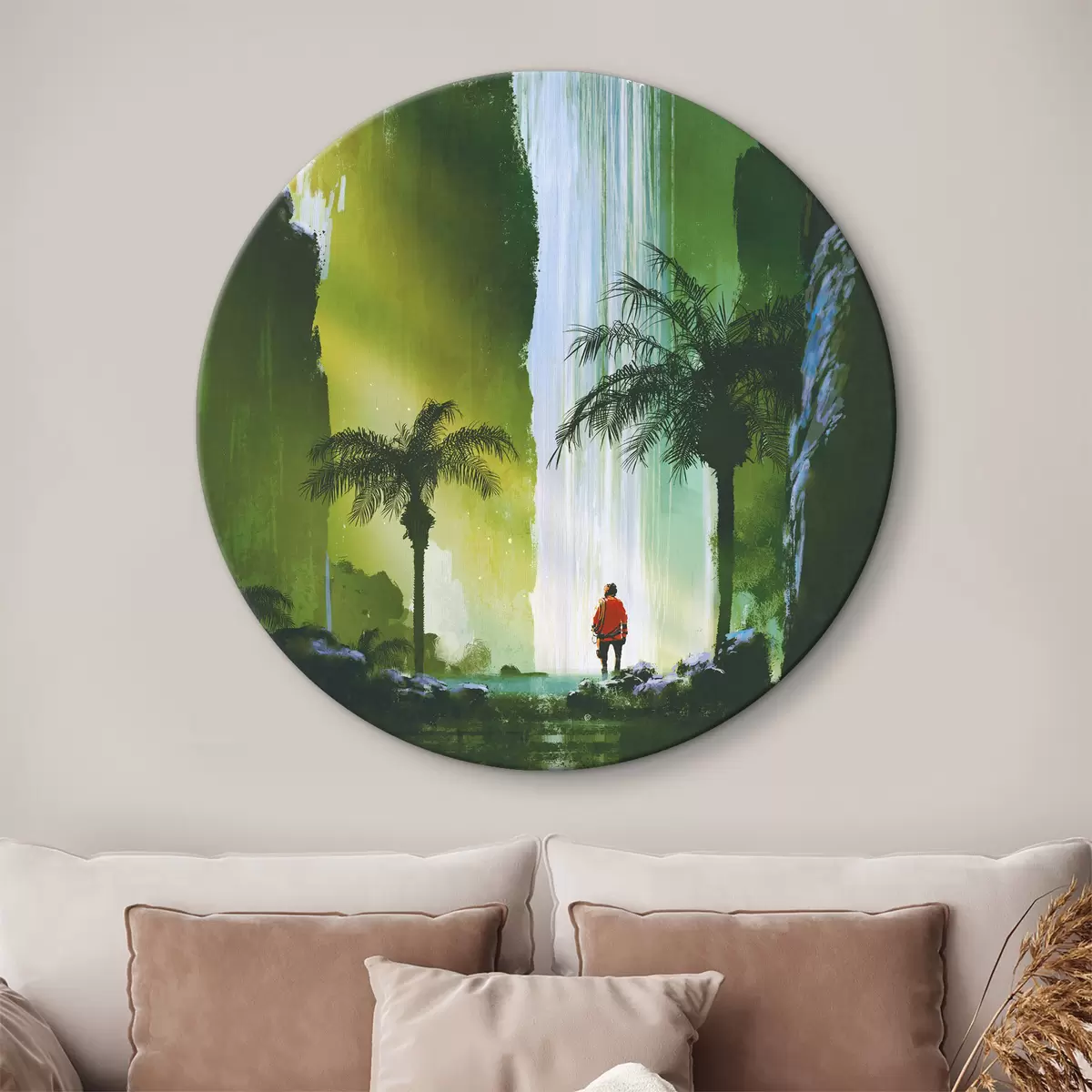 Quadri rotondi Un uomo che cammina nella foresta con una cascata r37080