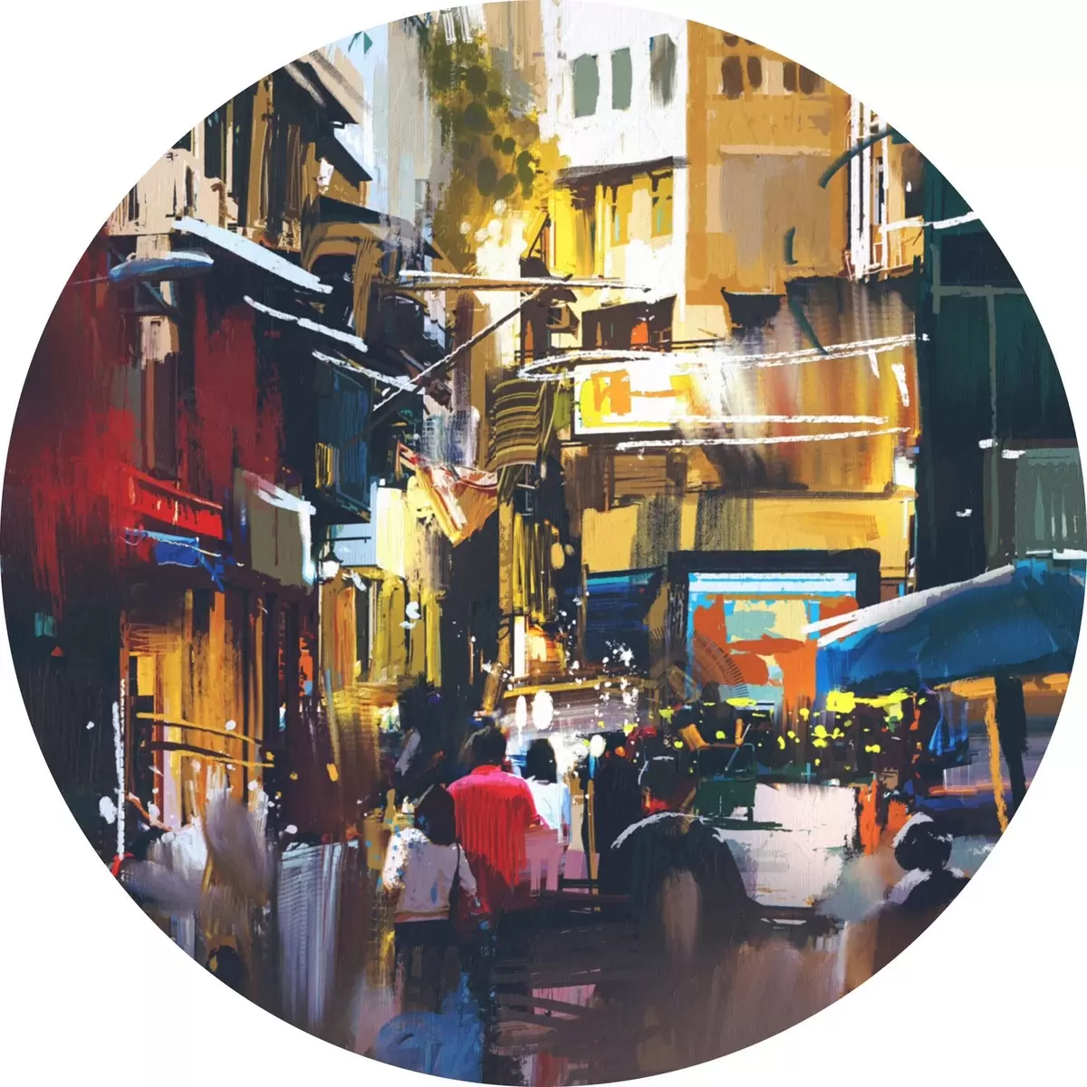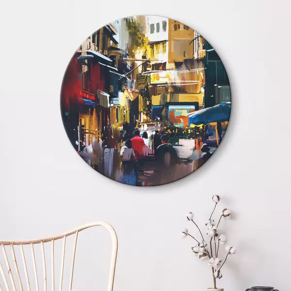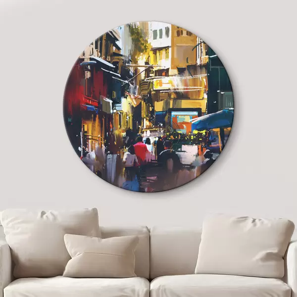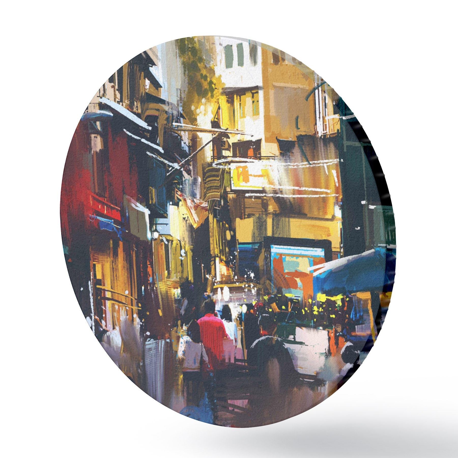 Quadri rotondi Strada con edifici e persone che camminano r37096