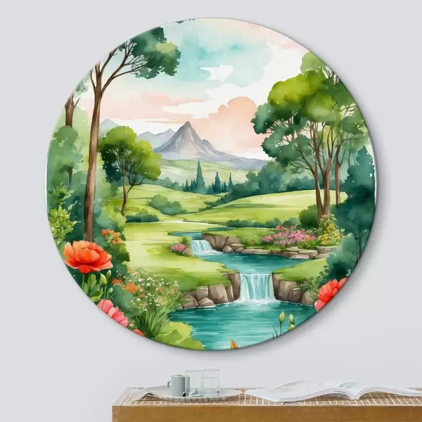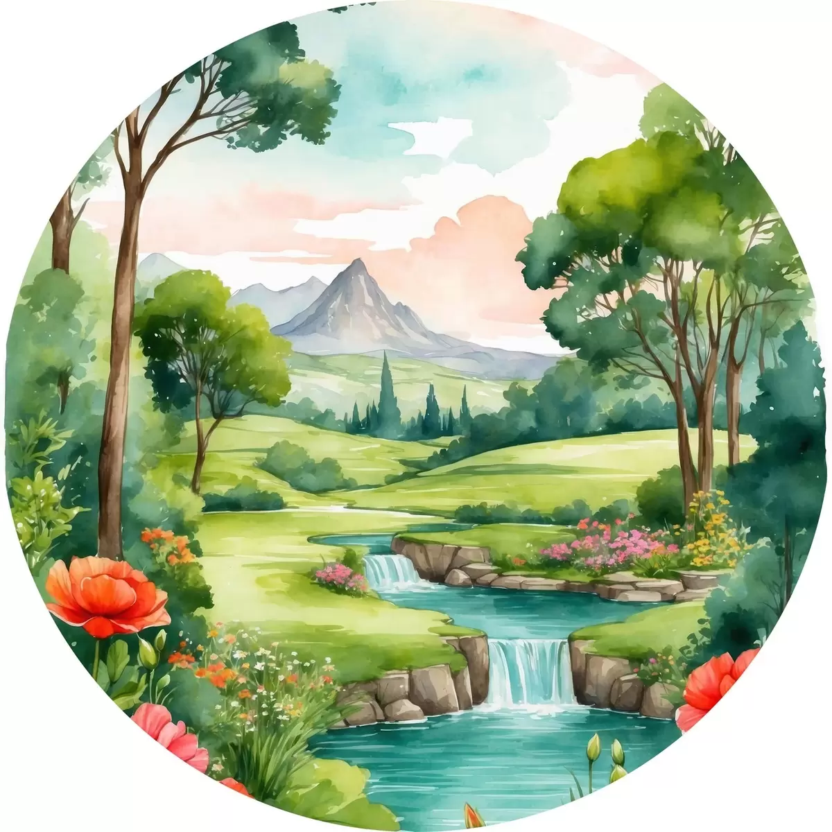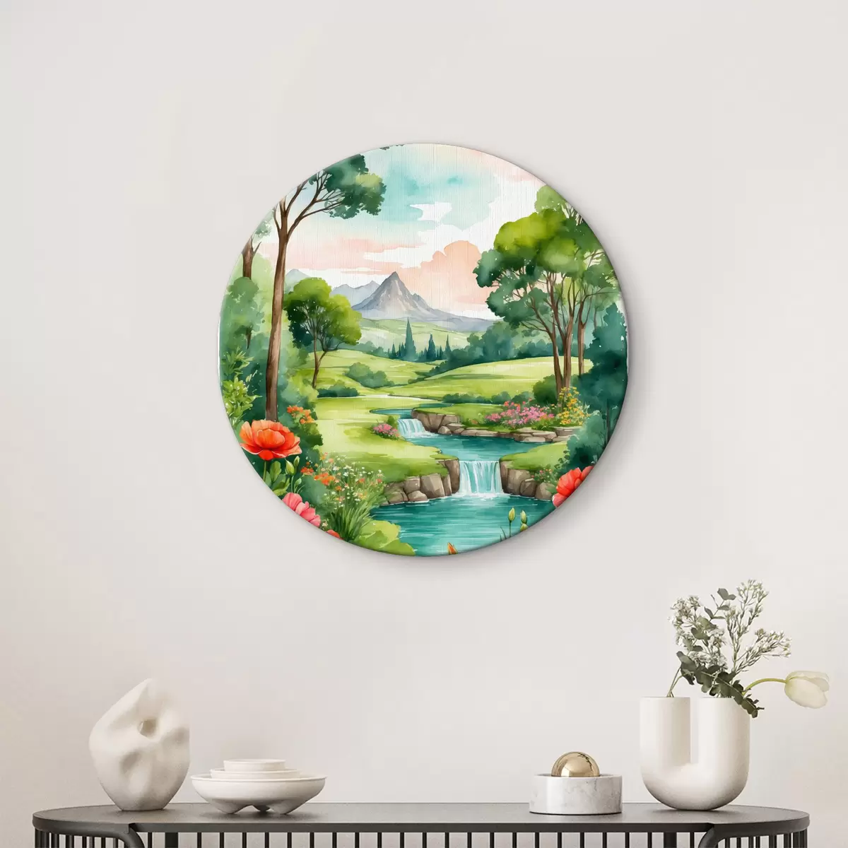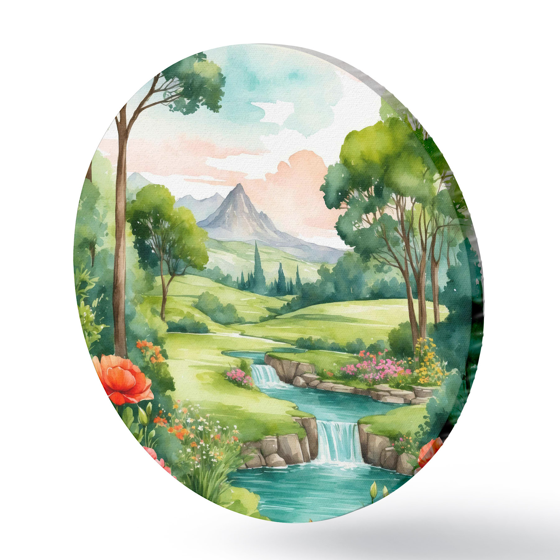 Quadri rotondi Acquerello raffigurante un fiume e dei fiori r37116