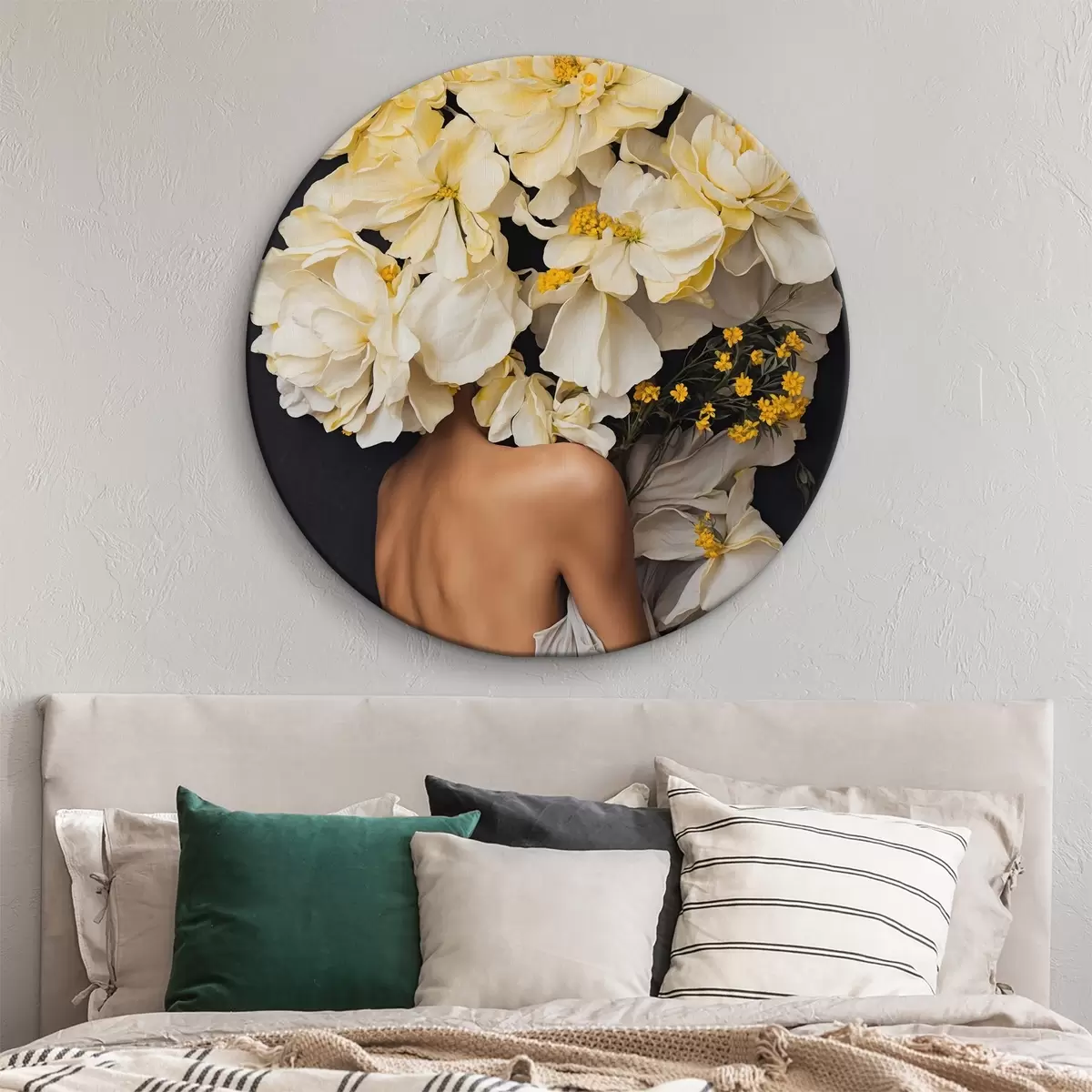 Quadri rotondi Donna con fiori gialli su sfondo nero r37162
