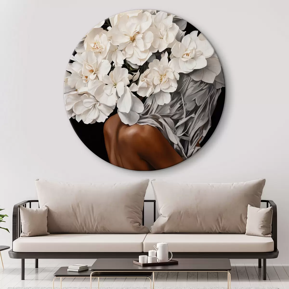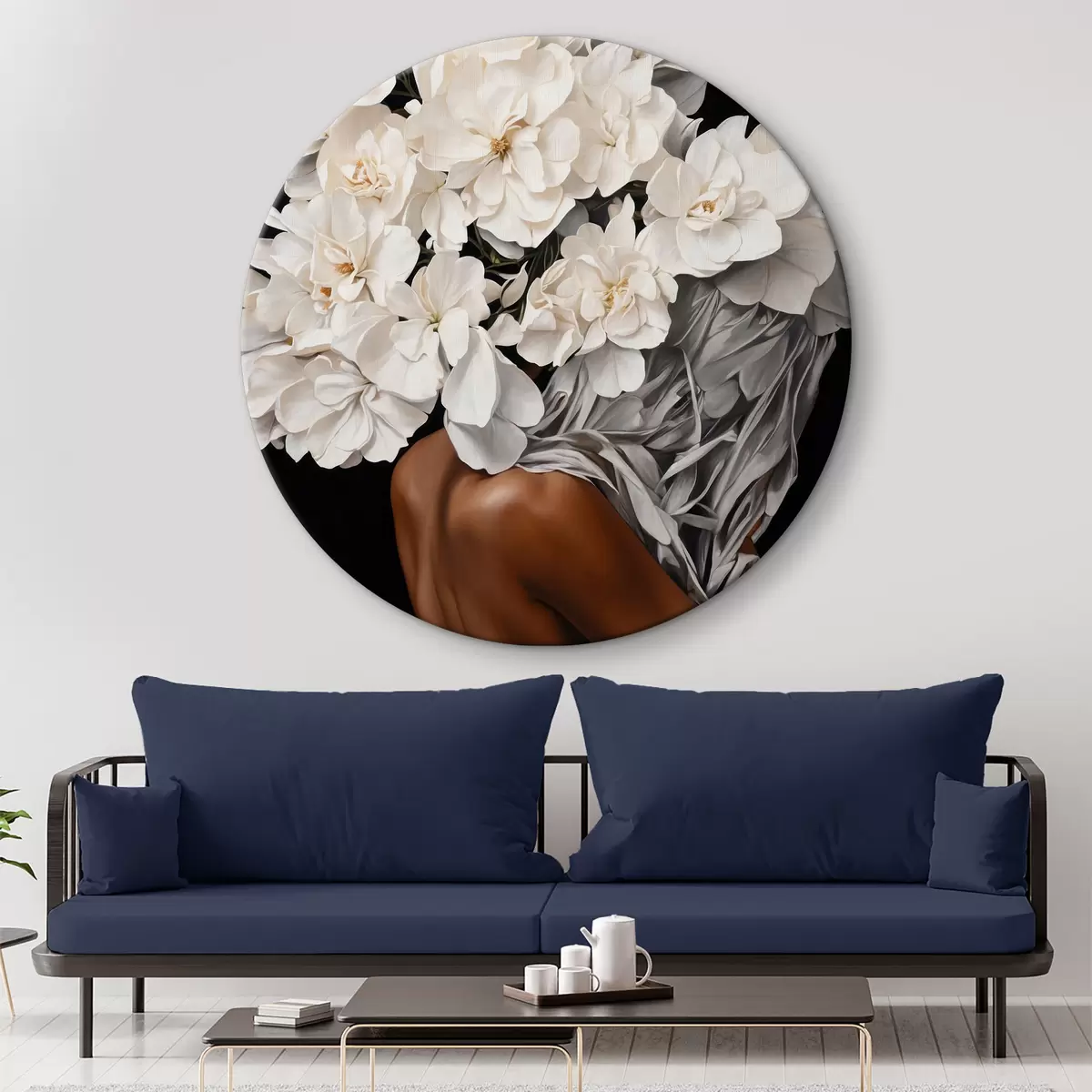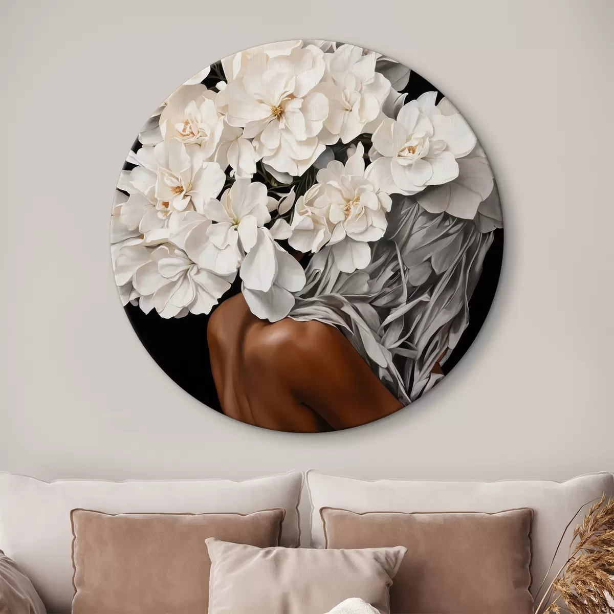 Quadri rotondi Donna con fiori bianchi su sfondo nero r37163