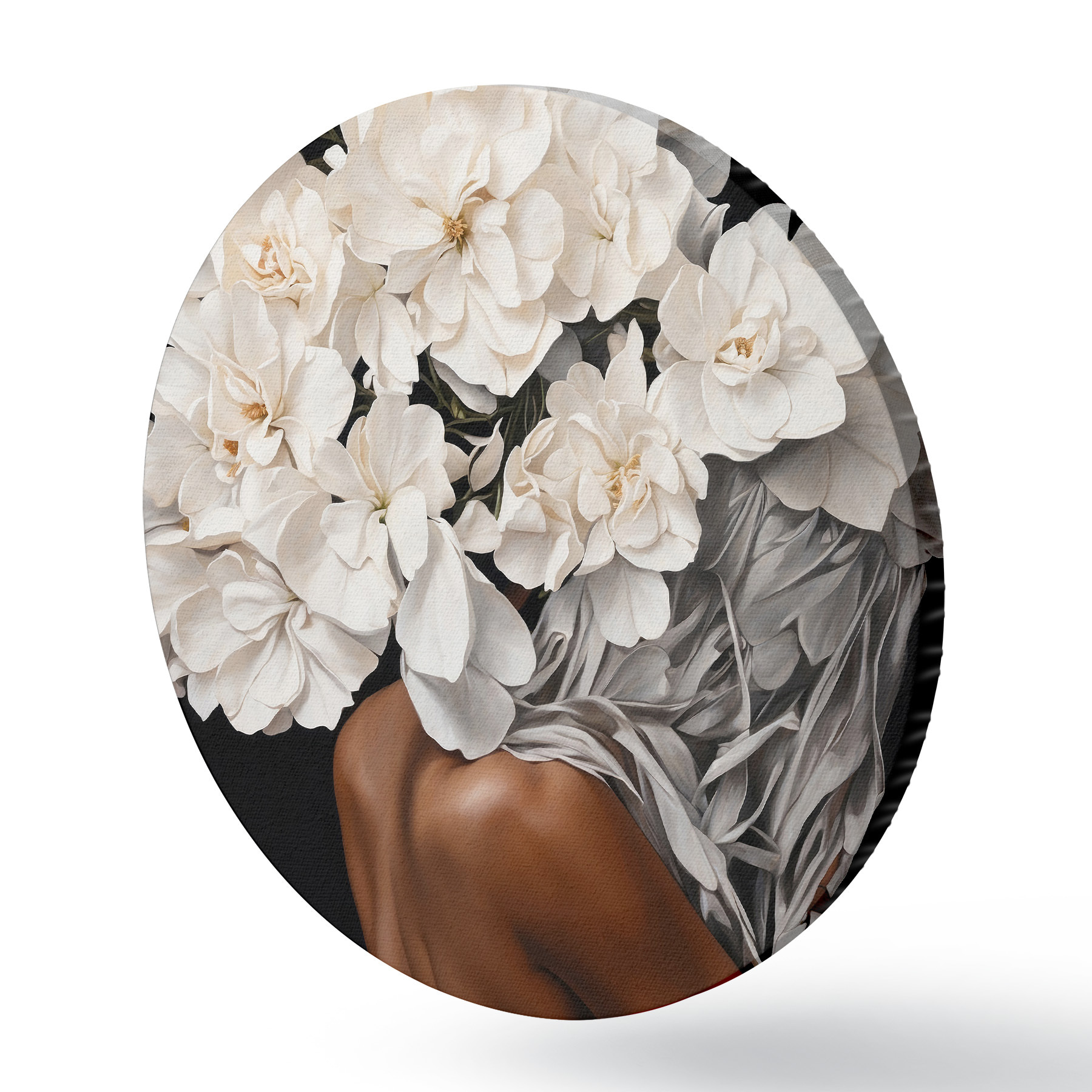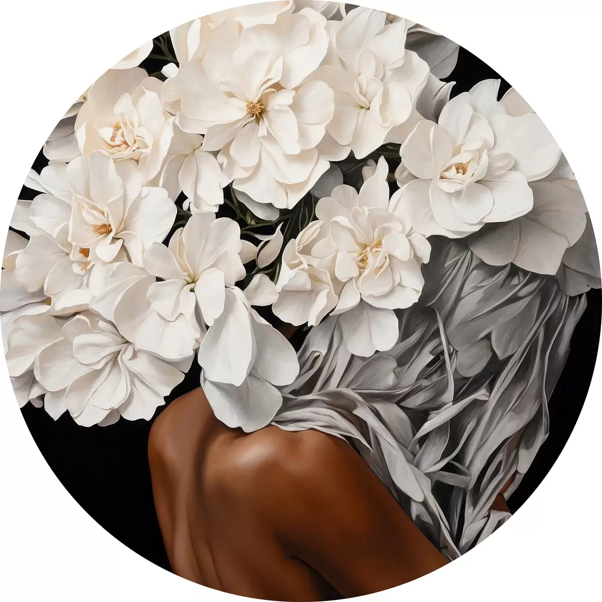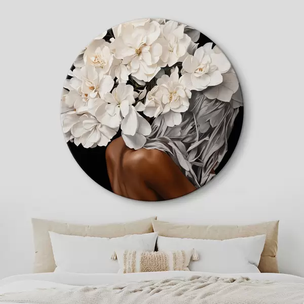 Quadri rotondi Donna con fiori bianchi su sfondo nero r37163
