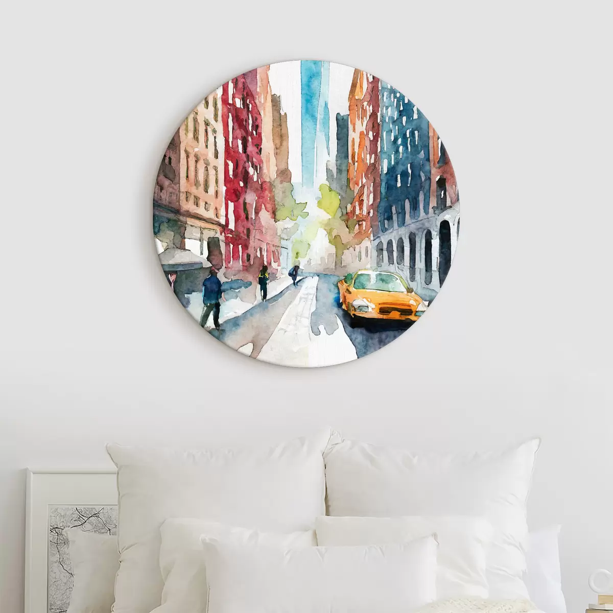 Quadri rotondi Un acquerello raffigurante una strada con edifici e un'alta torre sullo sfondo r37346