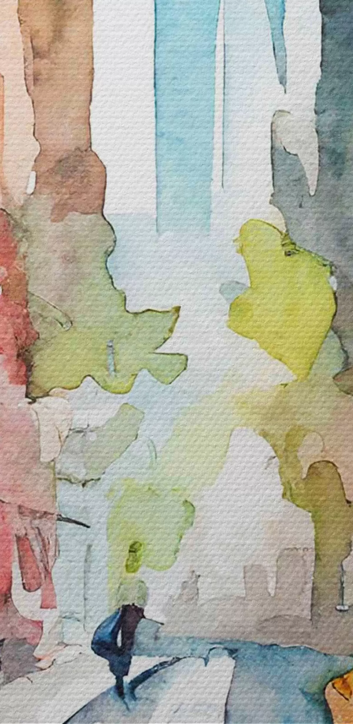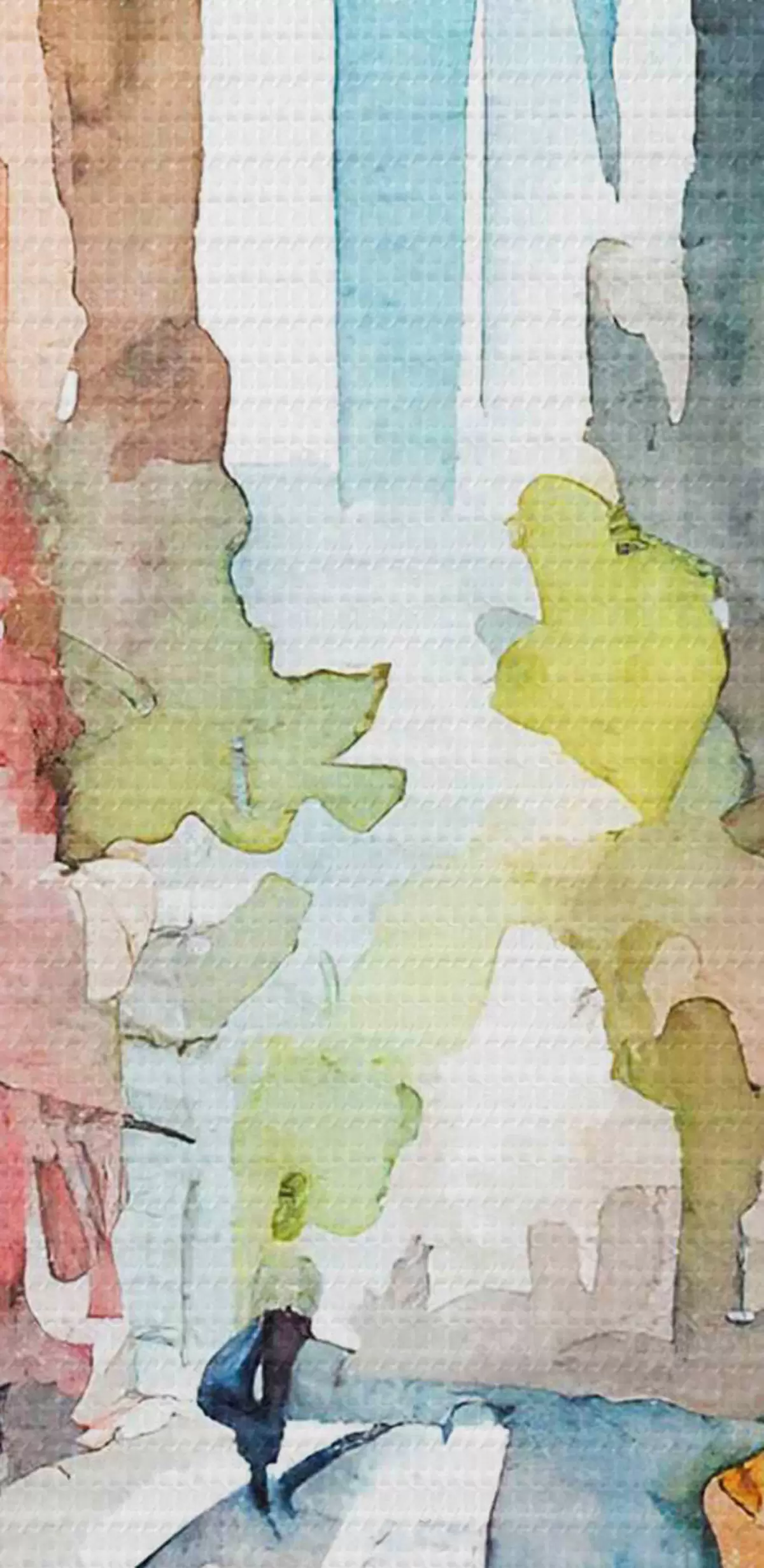 Immagine Un acquerello raffigurante una strada con edifici e un'alta torre sullo sfondo Nr r37346