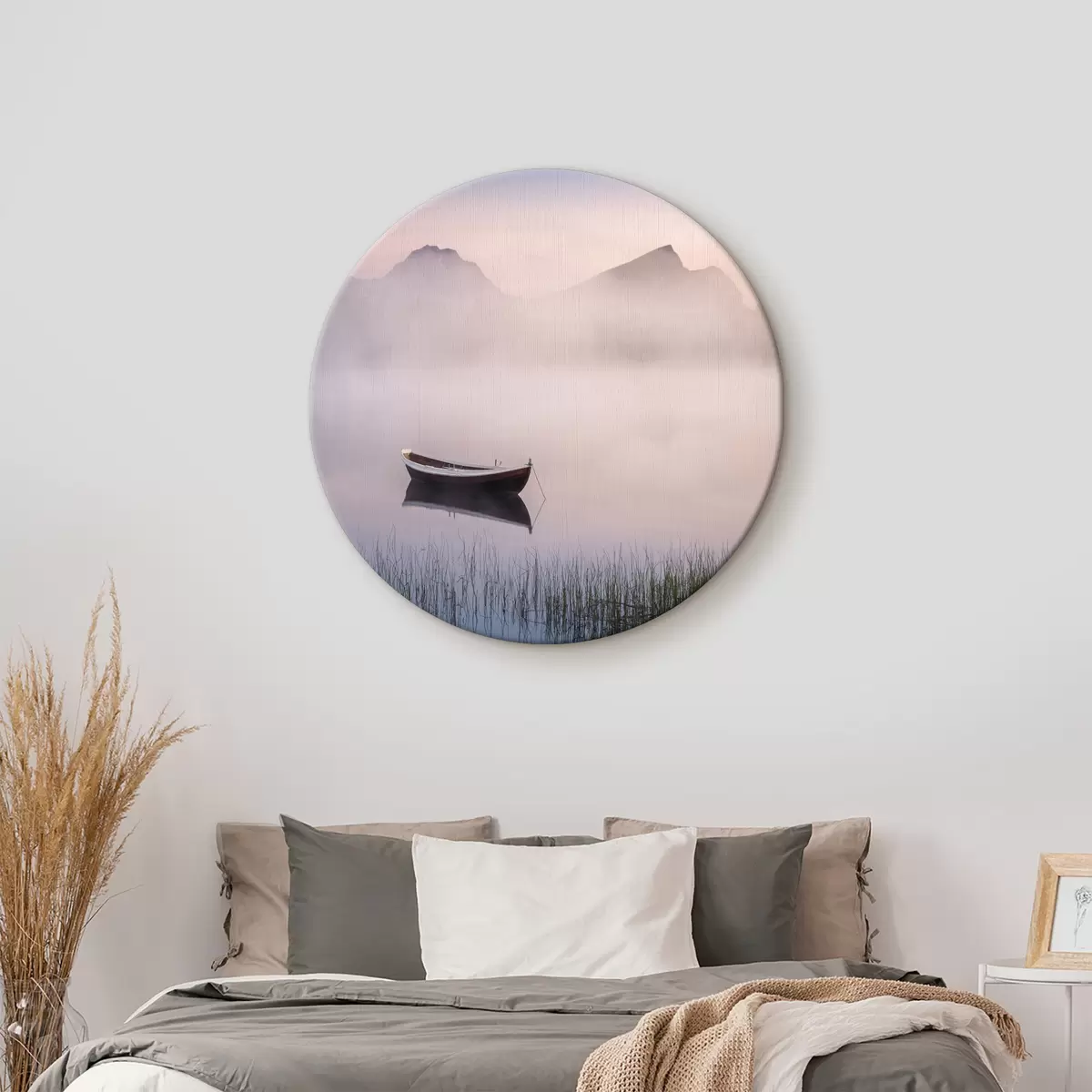 Quadri rotondi Barca su un lago con erba e montagne sullo sfondo r37622