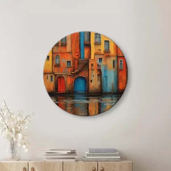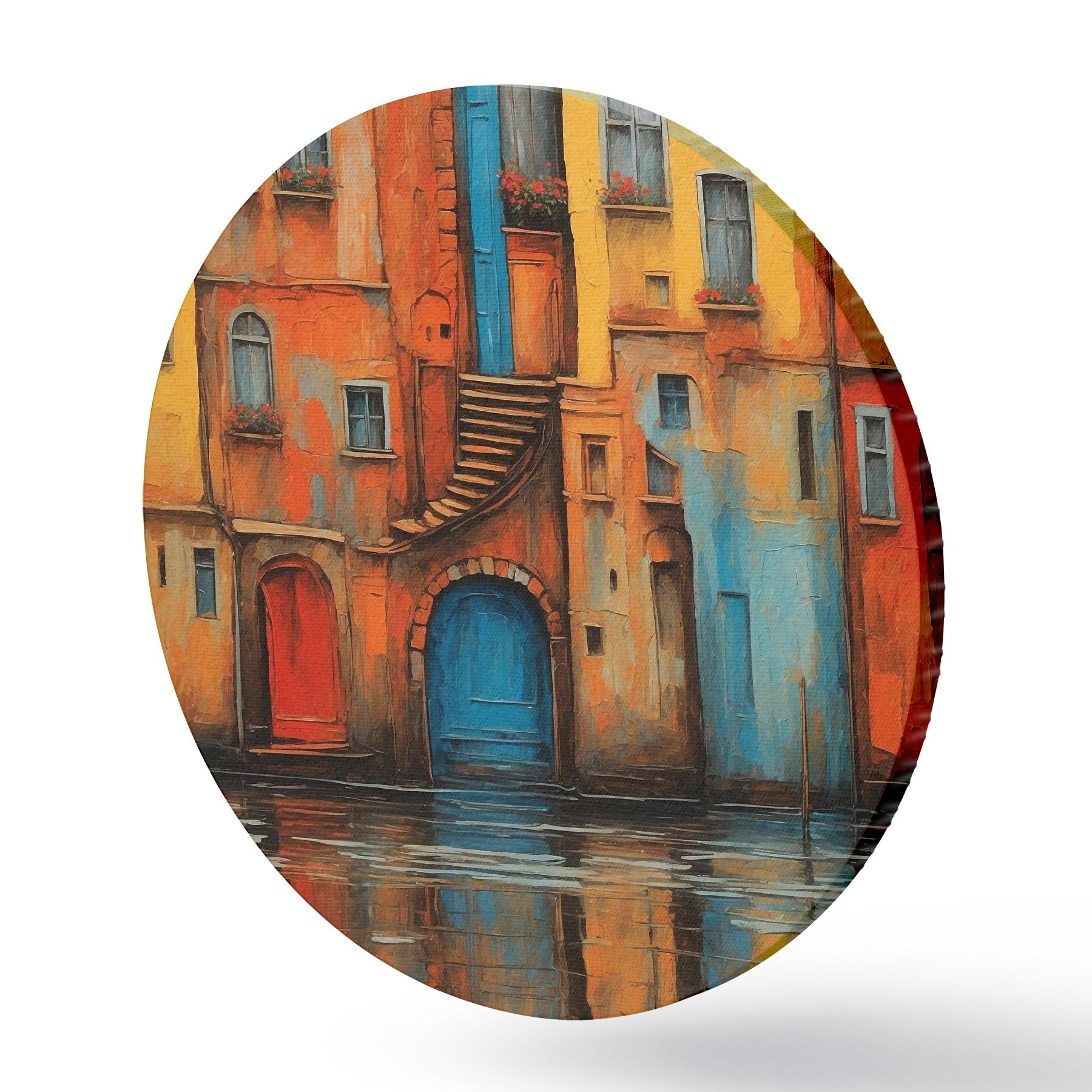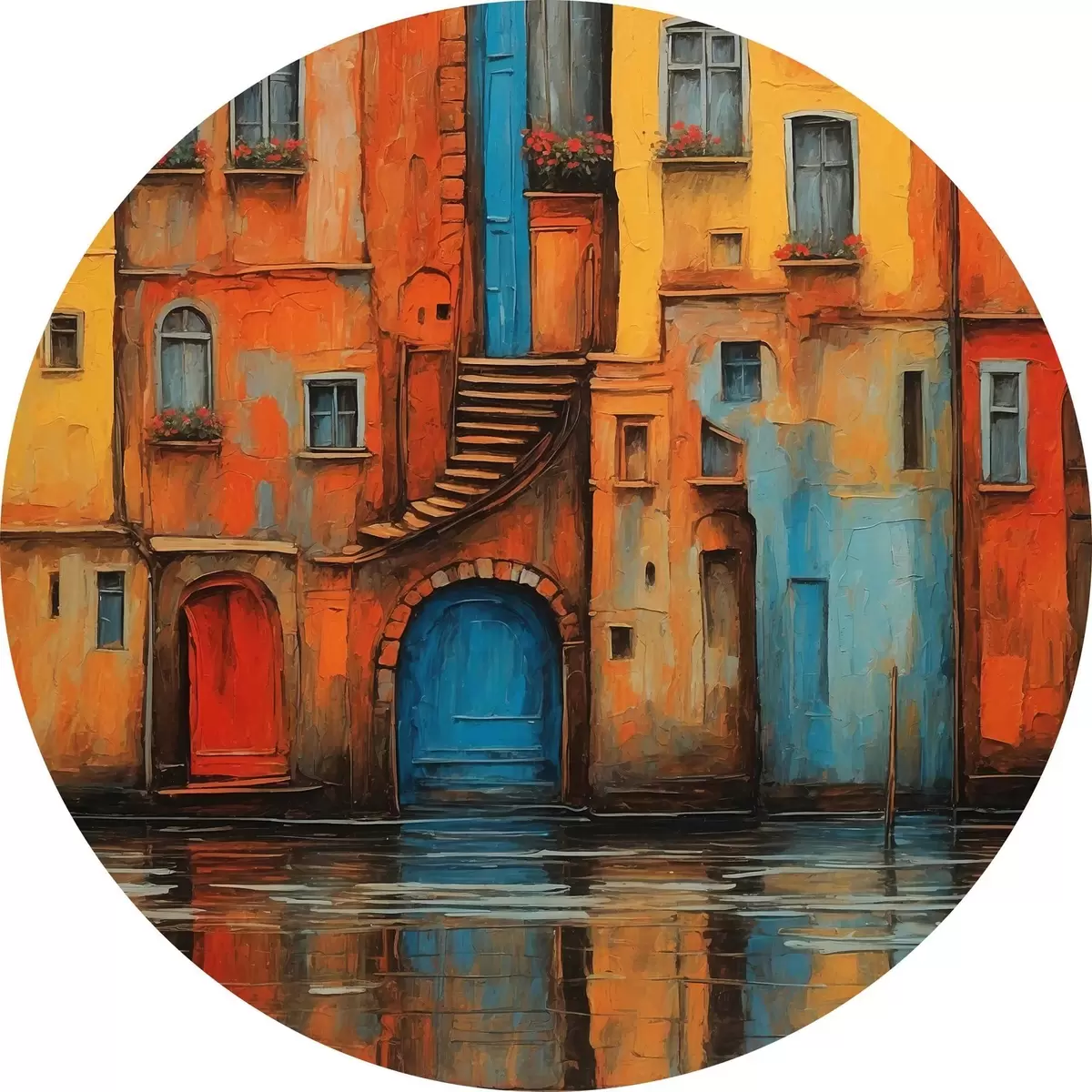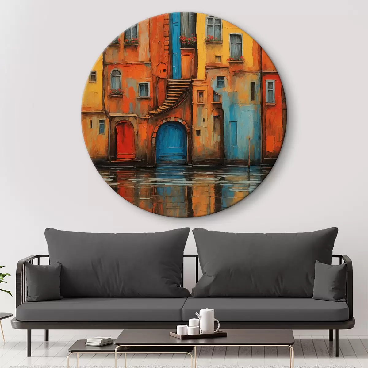 Quadri rotondi Immagine di un edificio con una scala e porte blu r37789
