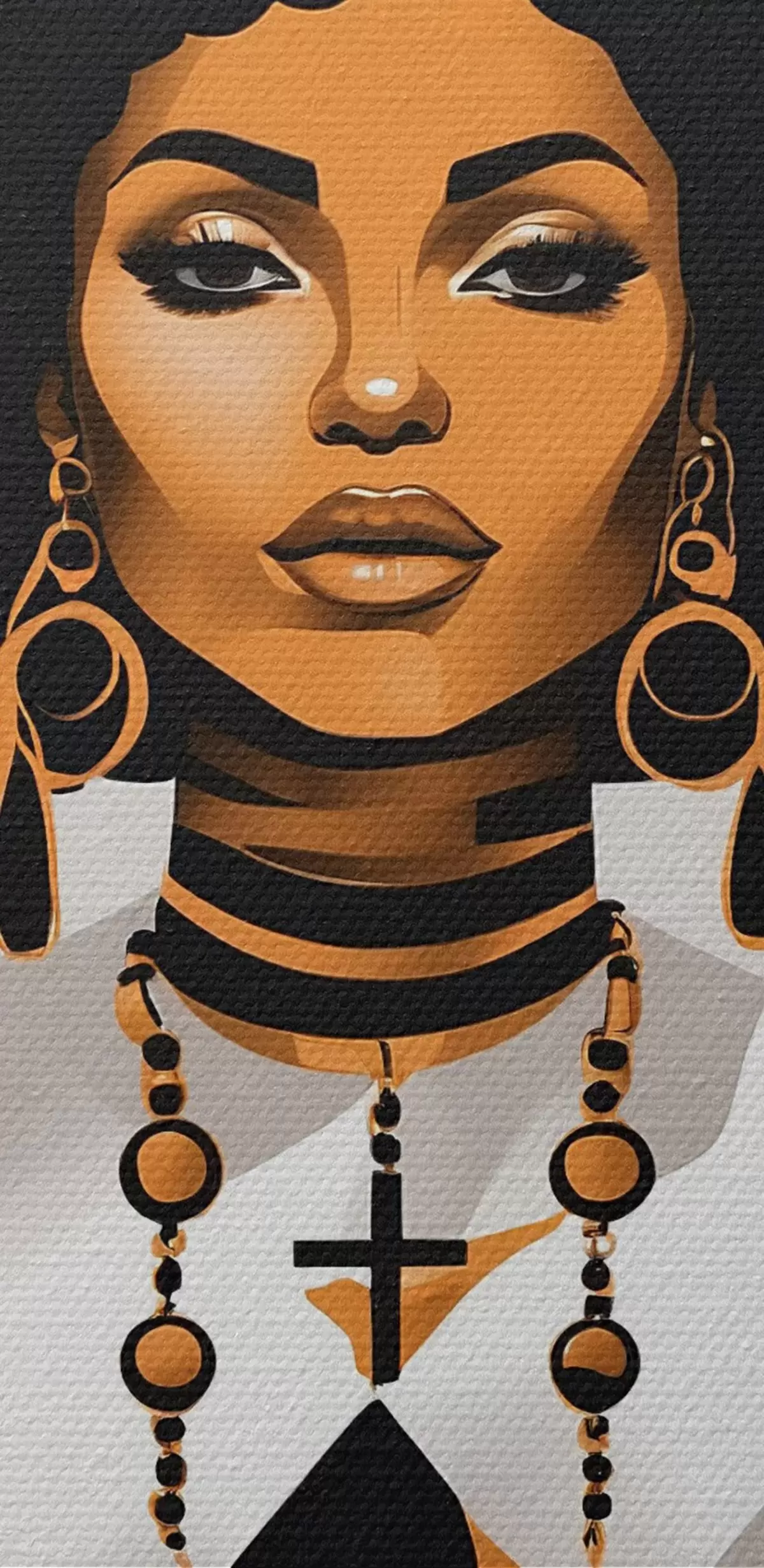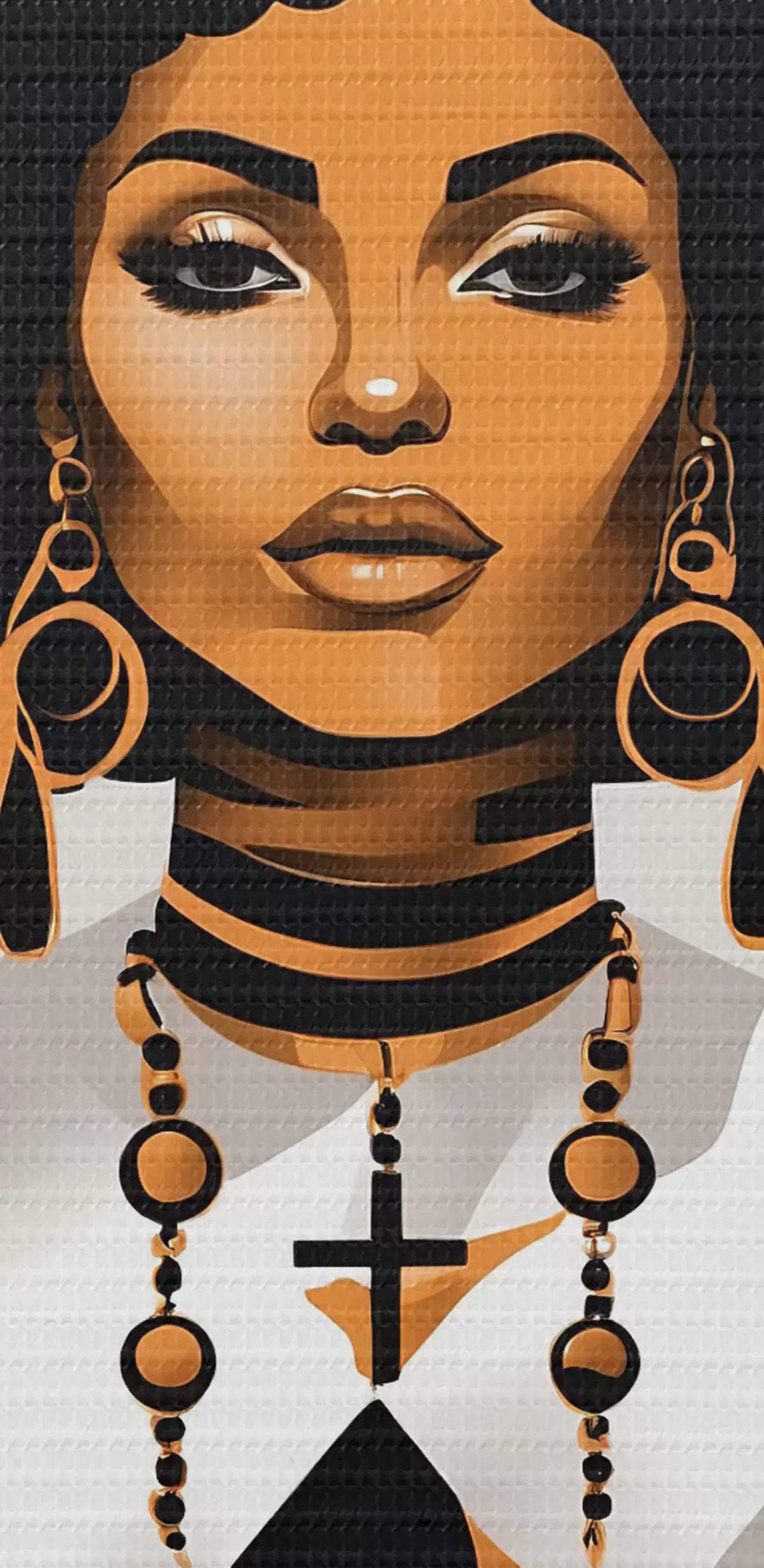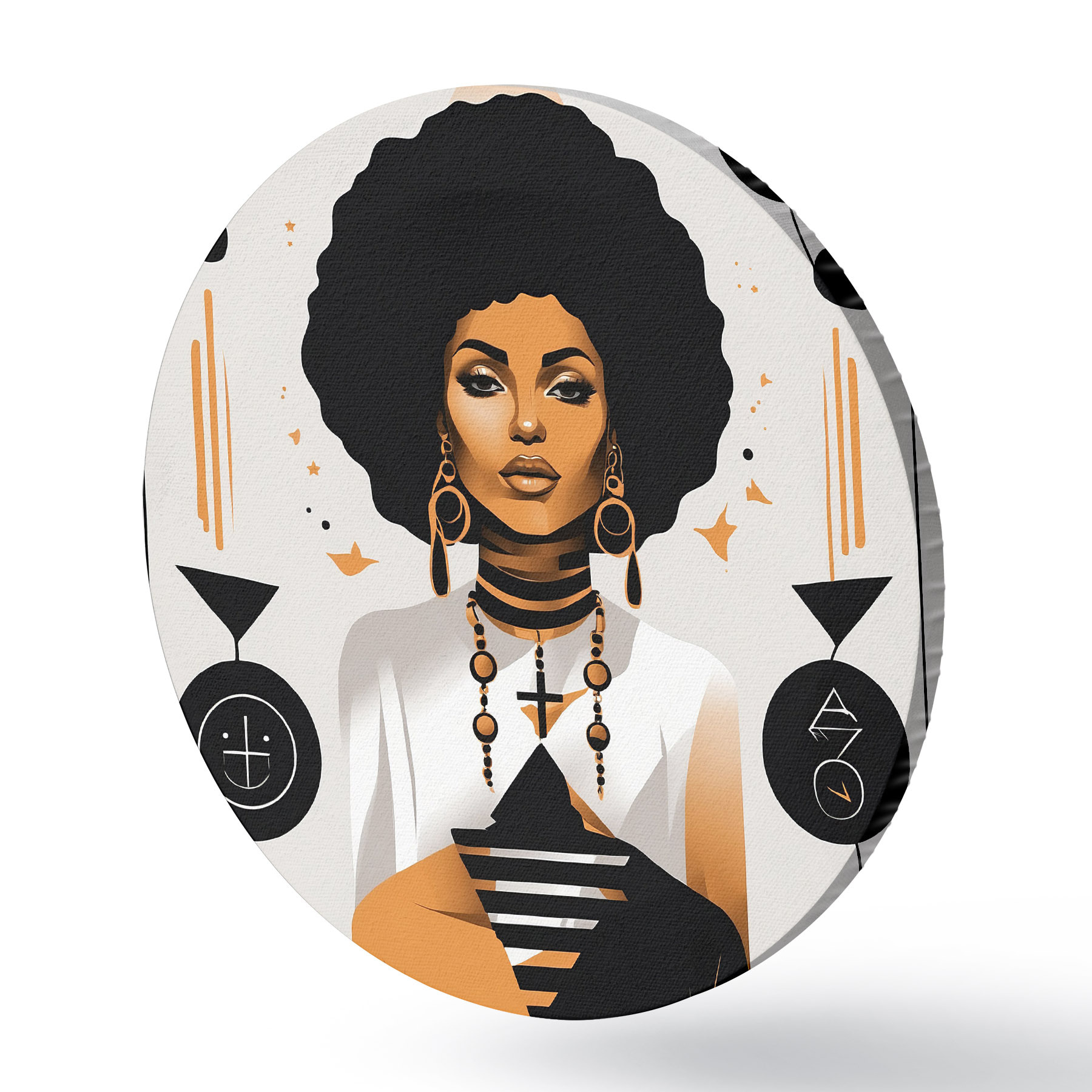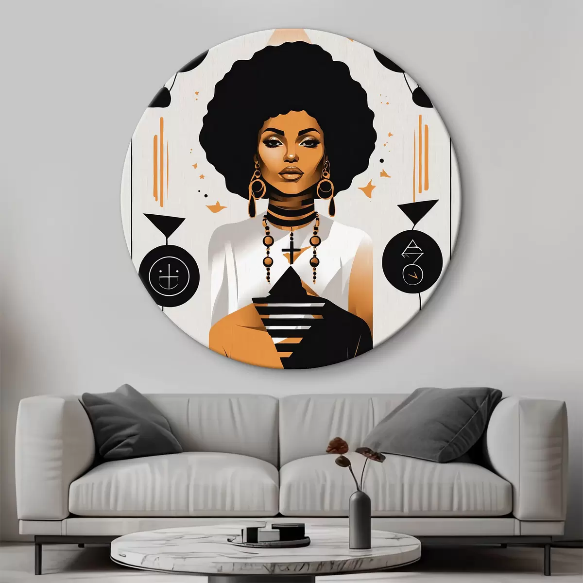 Quadri rotondi Una donna con grandi capelli afro, camicia bianca e orecchini r37793