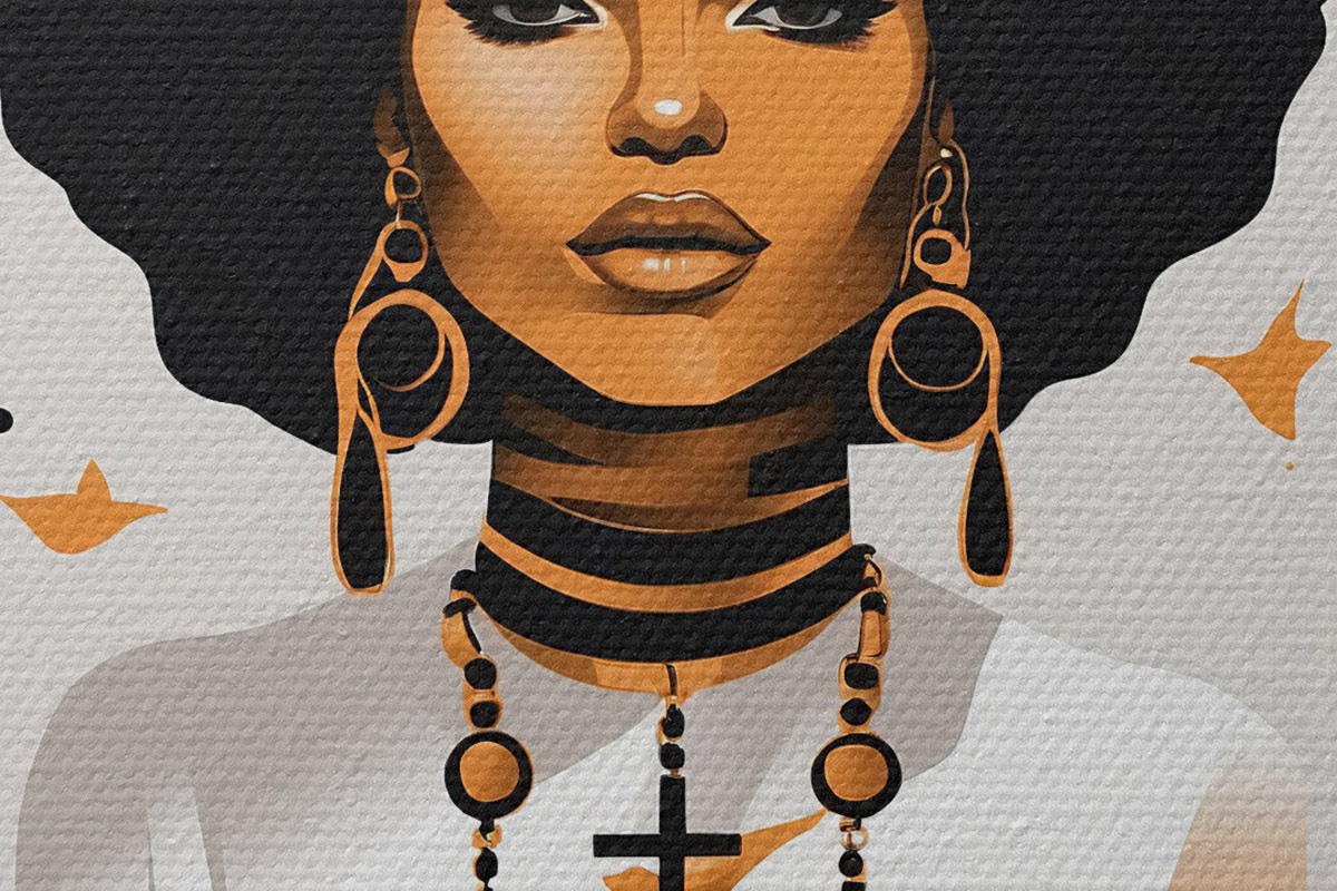 Immagine Una donna con grandi capelli afro, camicia bianca e orecchini Nr r37793