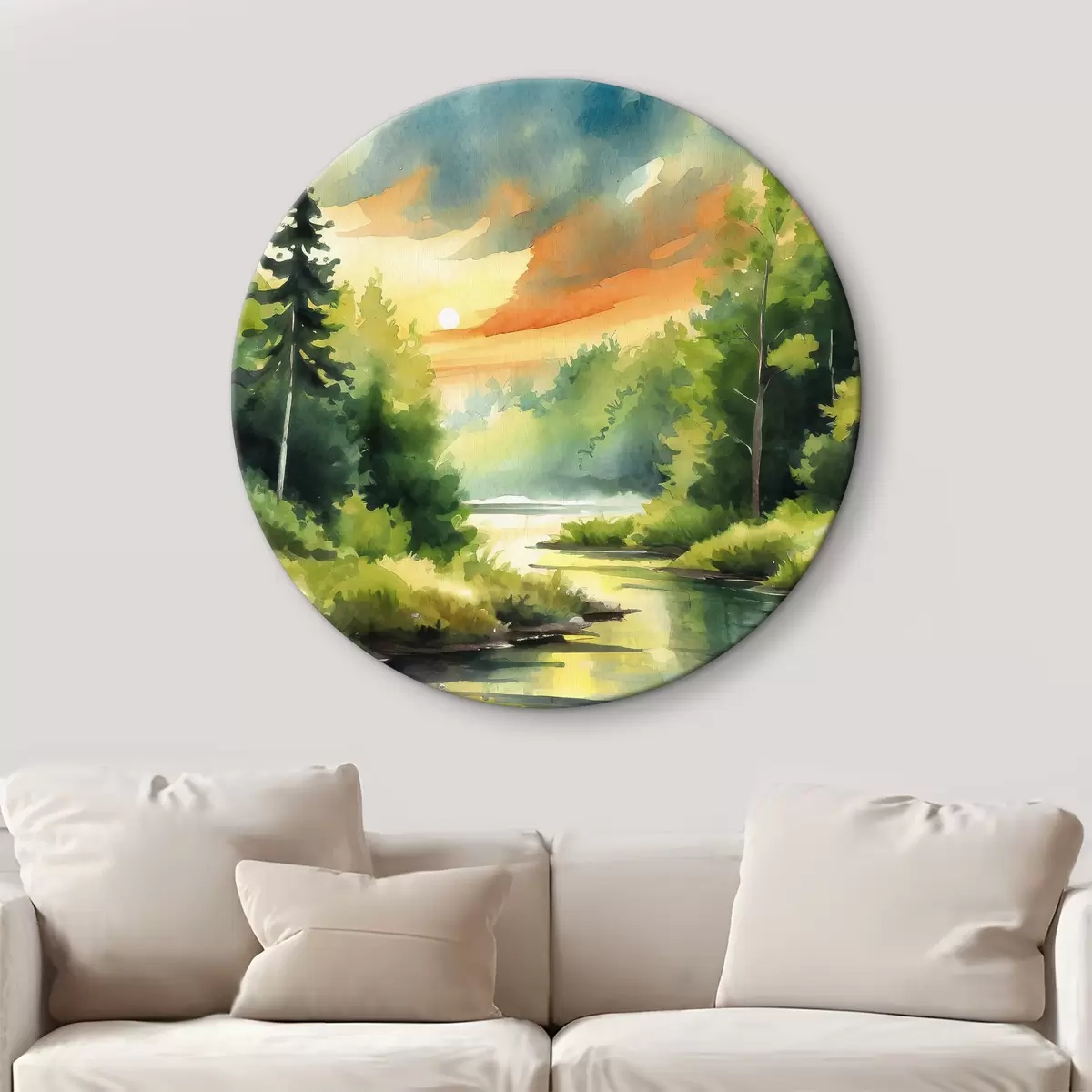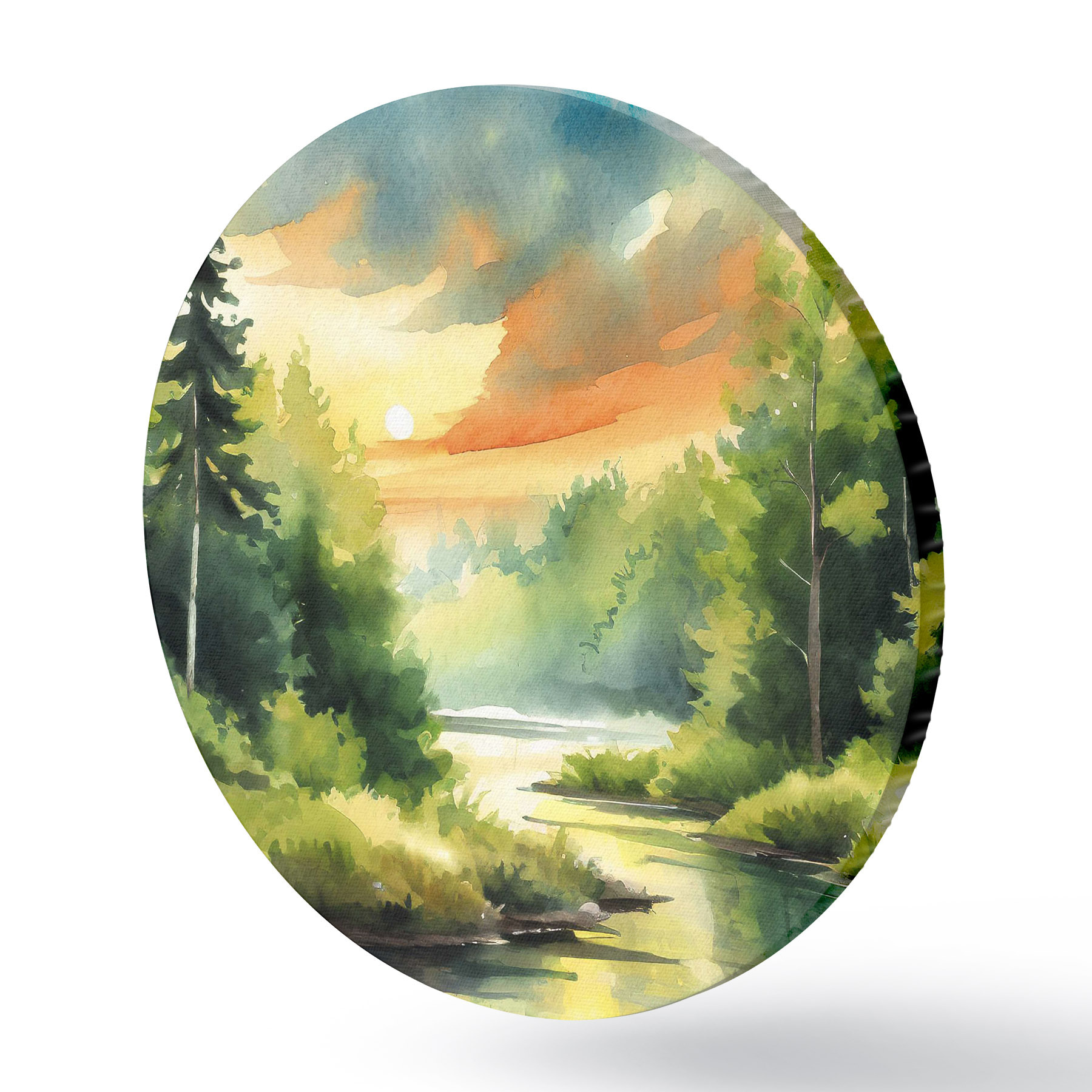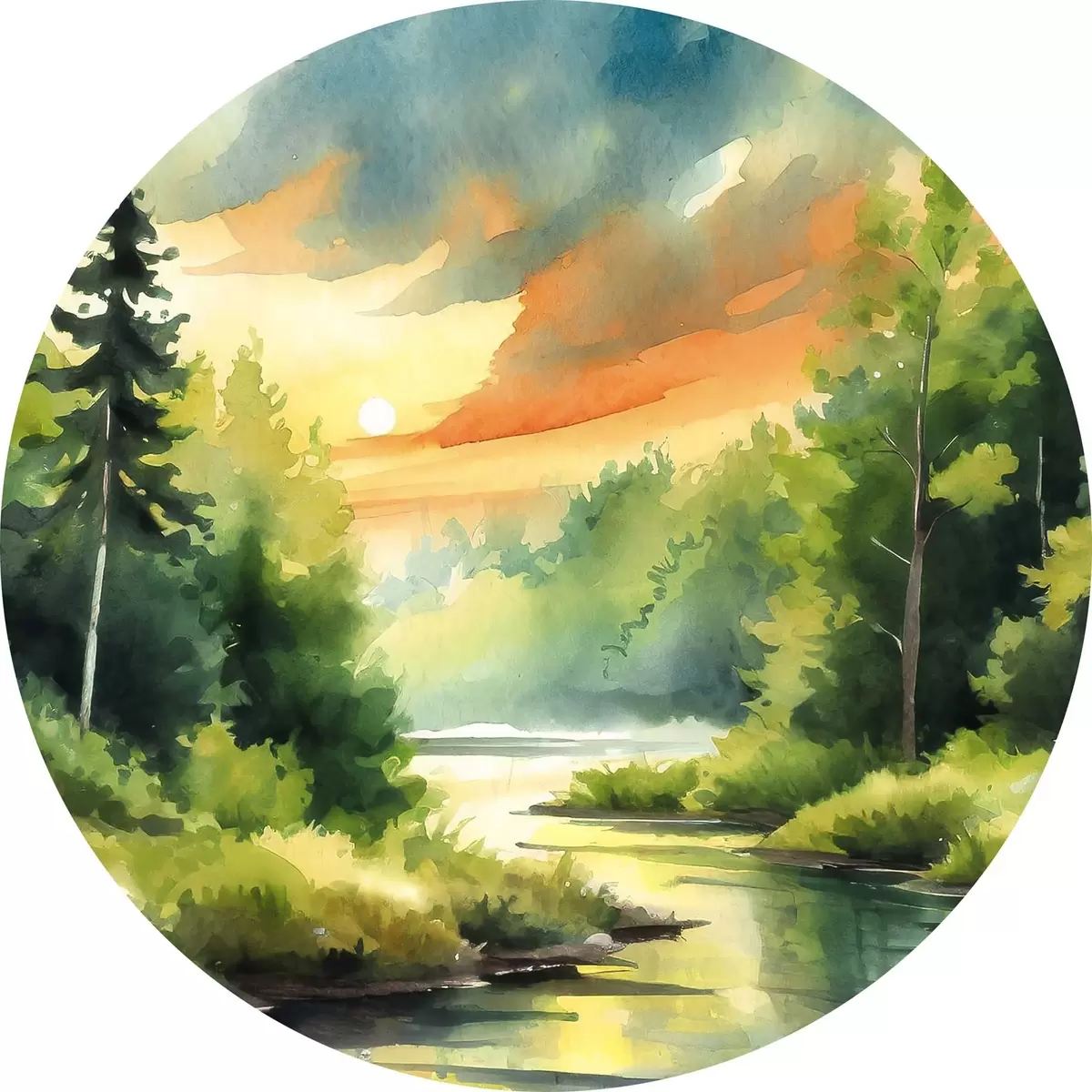 Quadri rotondi Una foresta tranquilla vicino a un fiume calmo r37953
