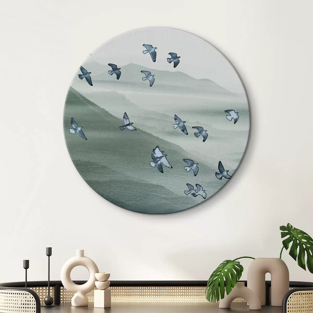 Quadri rotondi Uno stormo di uccelli in volo sulle montagne r38069