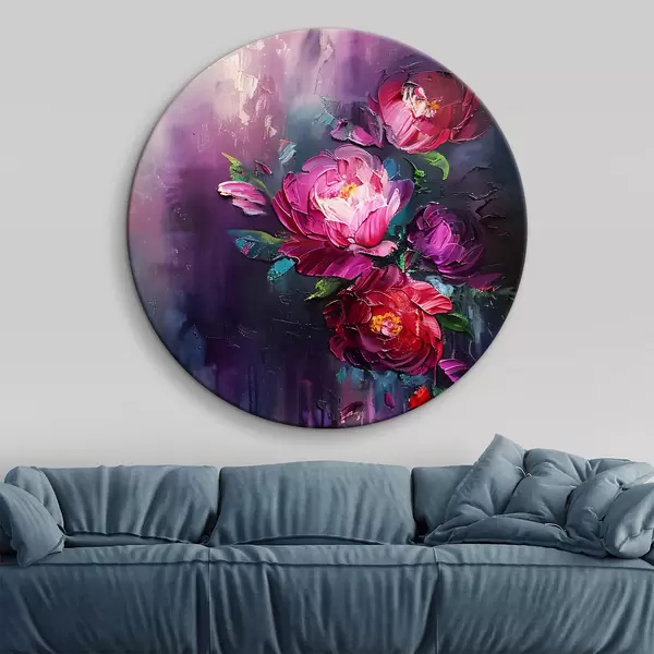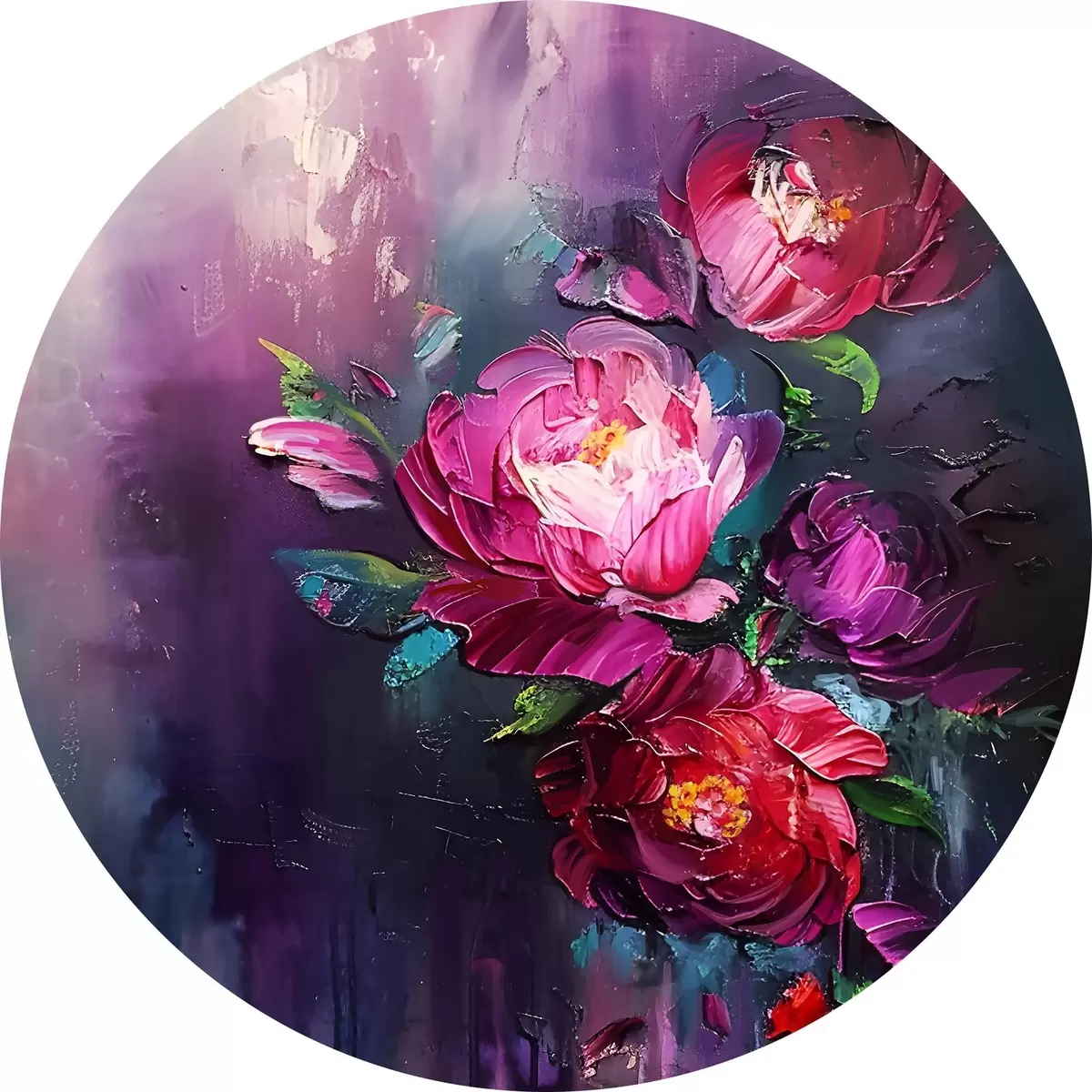 Quadri rotondi Dipingere rose, fiori che sbocciano in stile pittura a olio, su uno sfondo viola scuro r38108