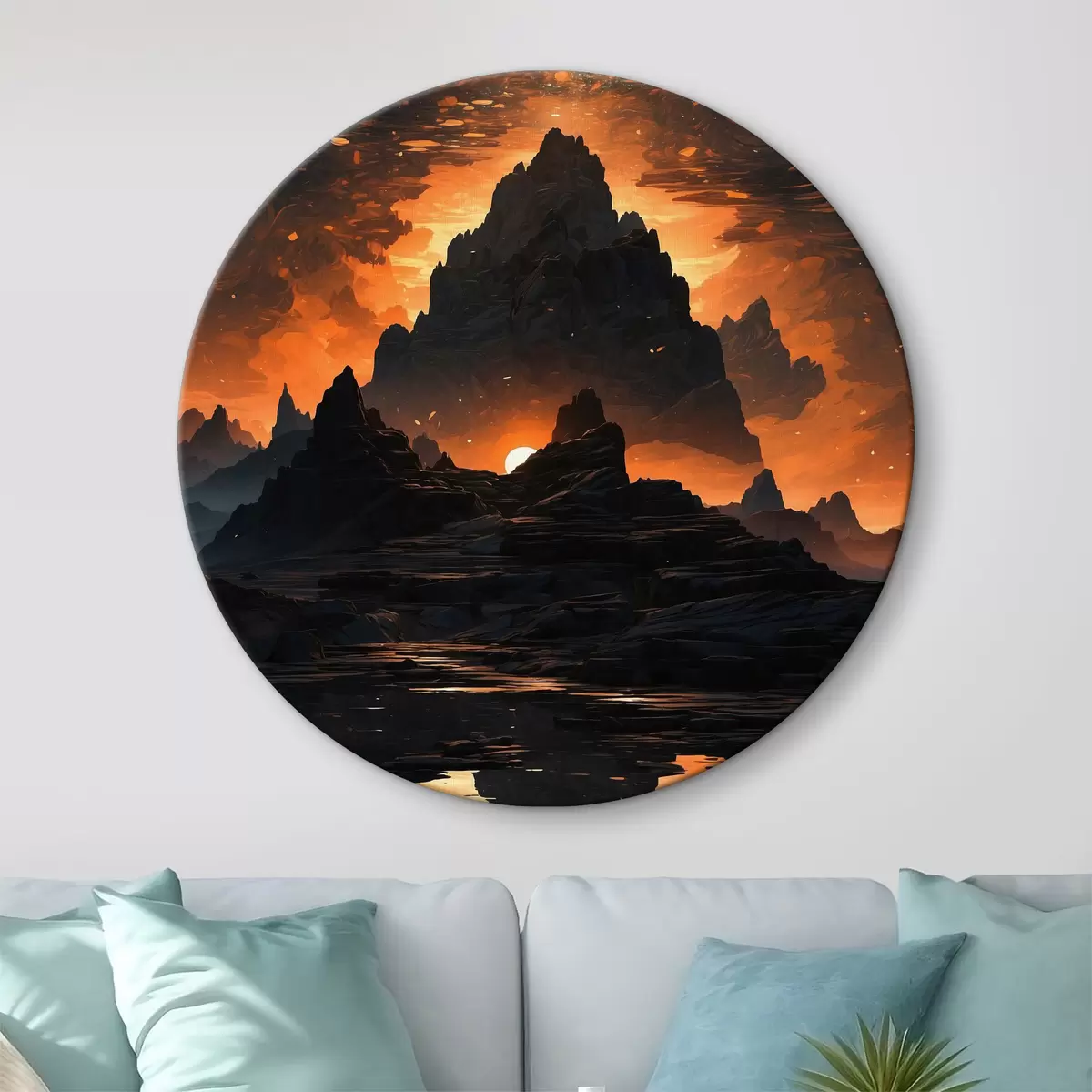Quadri rotondi Catena montuosa con il sole che tramonta dietro di essa r38120
