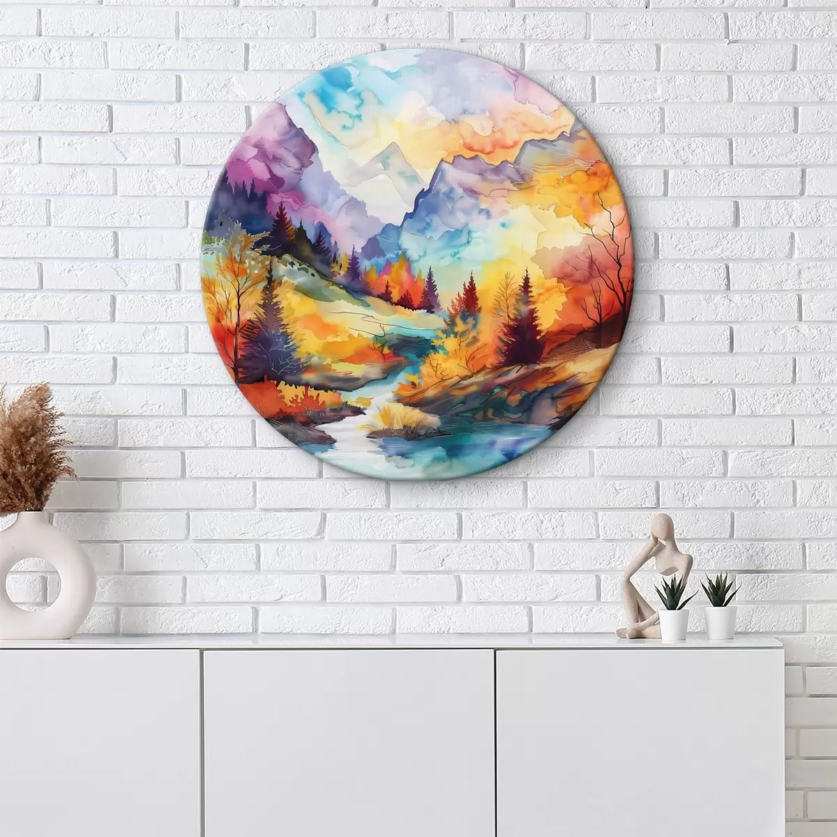 Quadri rotondi Paesaggio montano colorato con alberi e fiume r38145