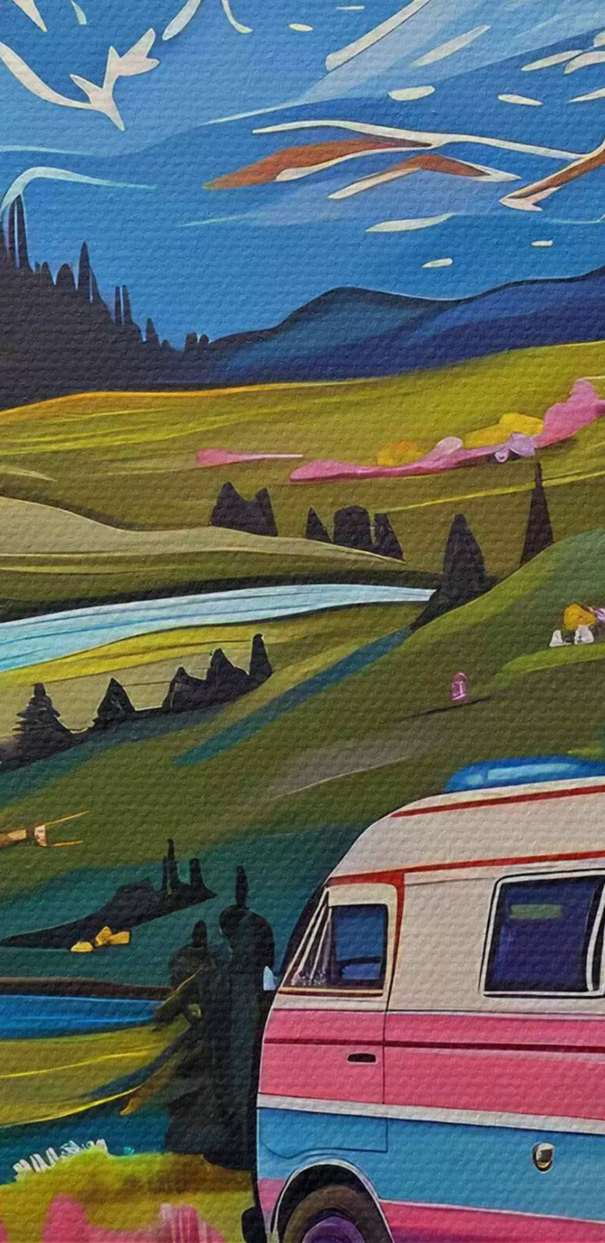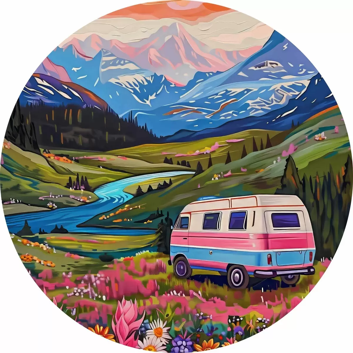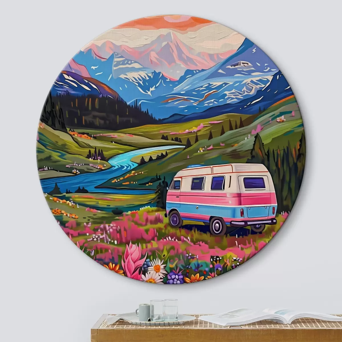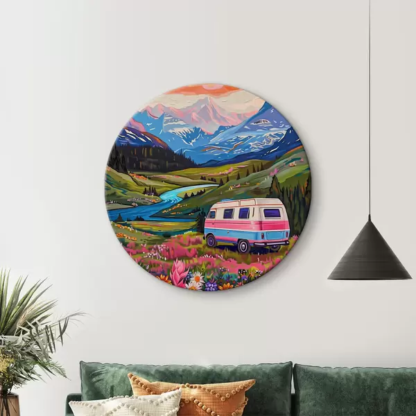 Quadri rotondi Un furgone che attraversa una valle con fiori e montagne r38259