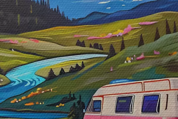 Immagine Un furgone che attraversa una valle con fiori e montagne Nr r38259