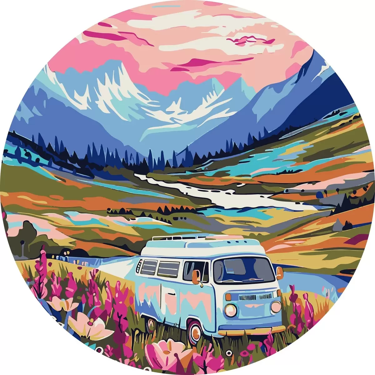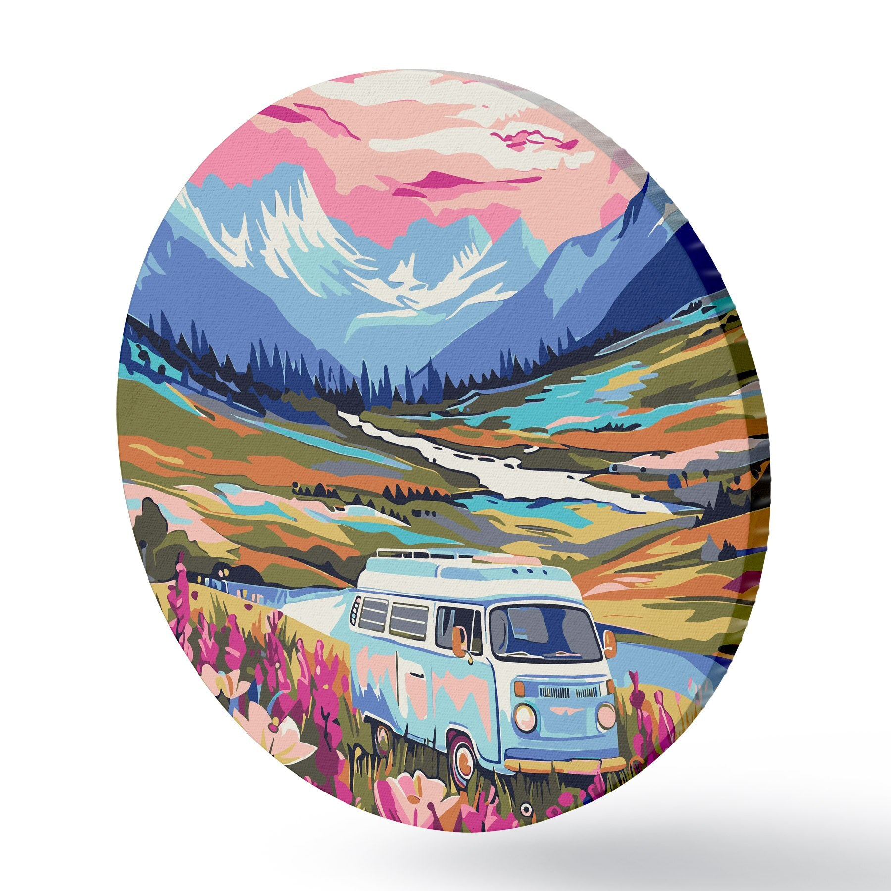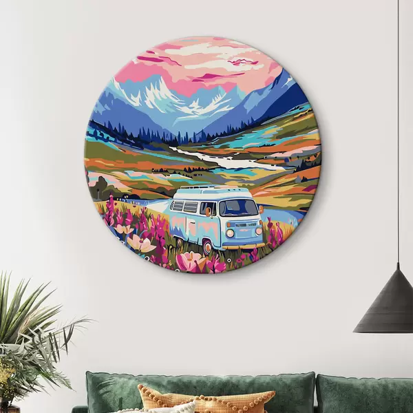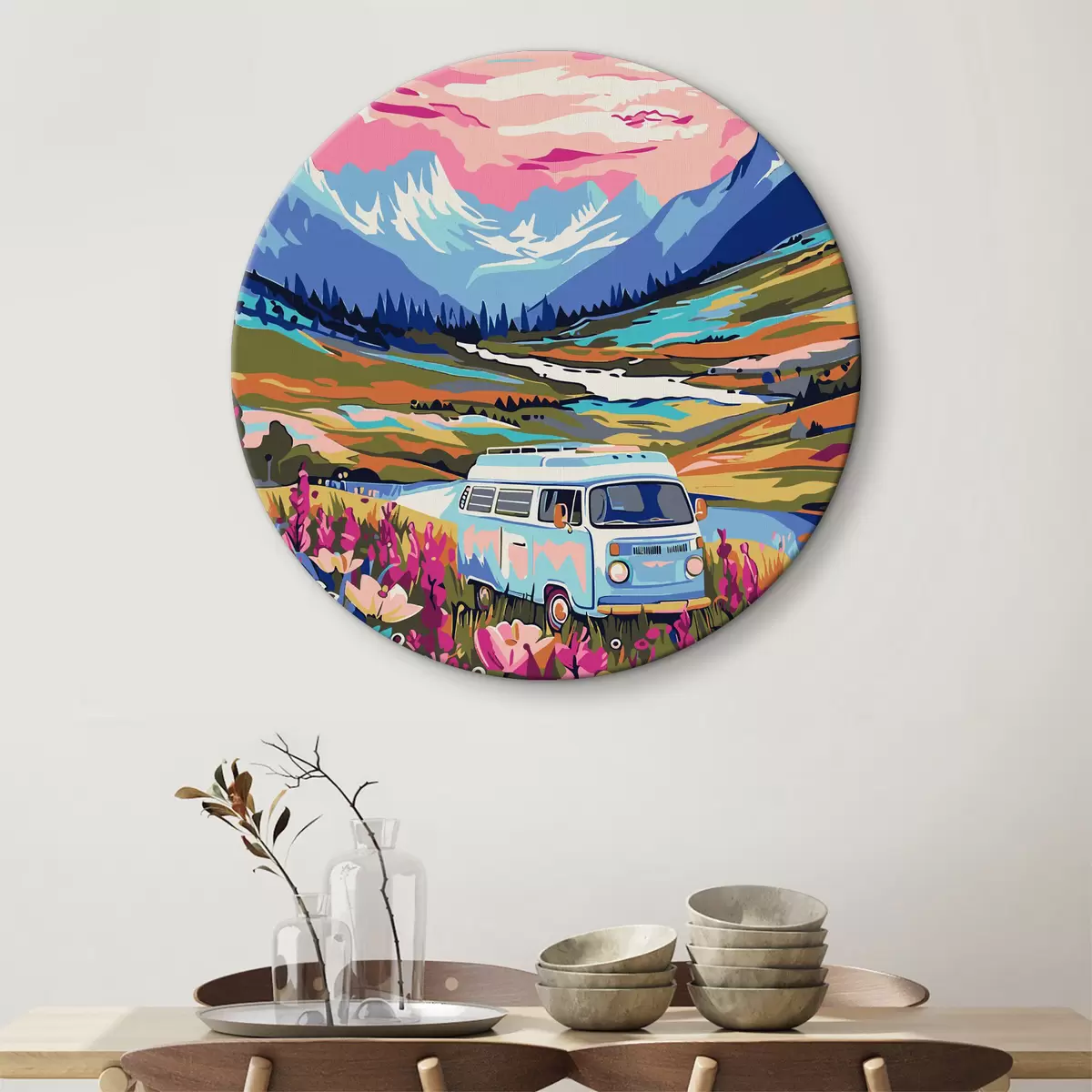 Quadri rotondi Un furgone che attraversa un campo di fiori r38260