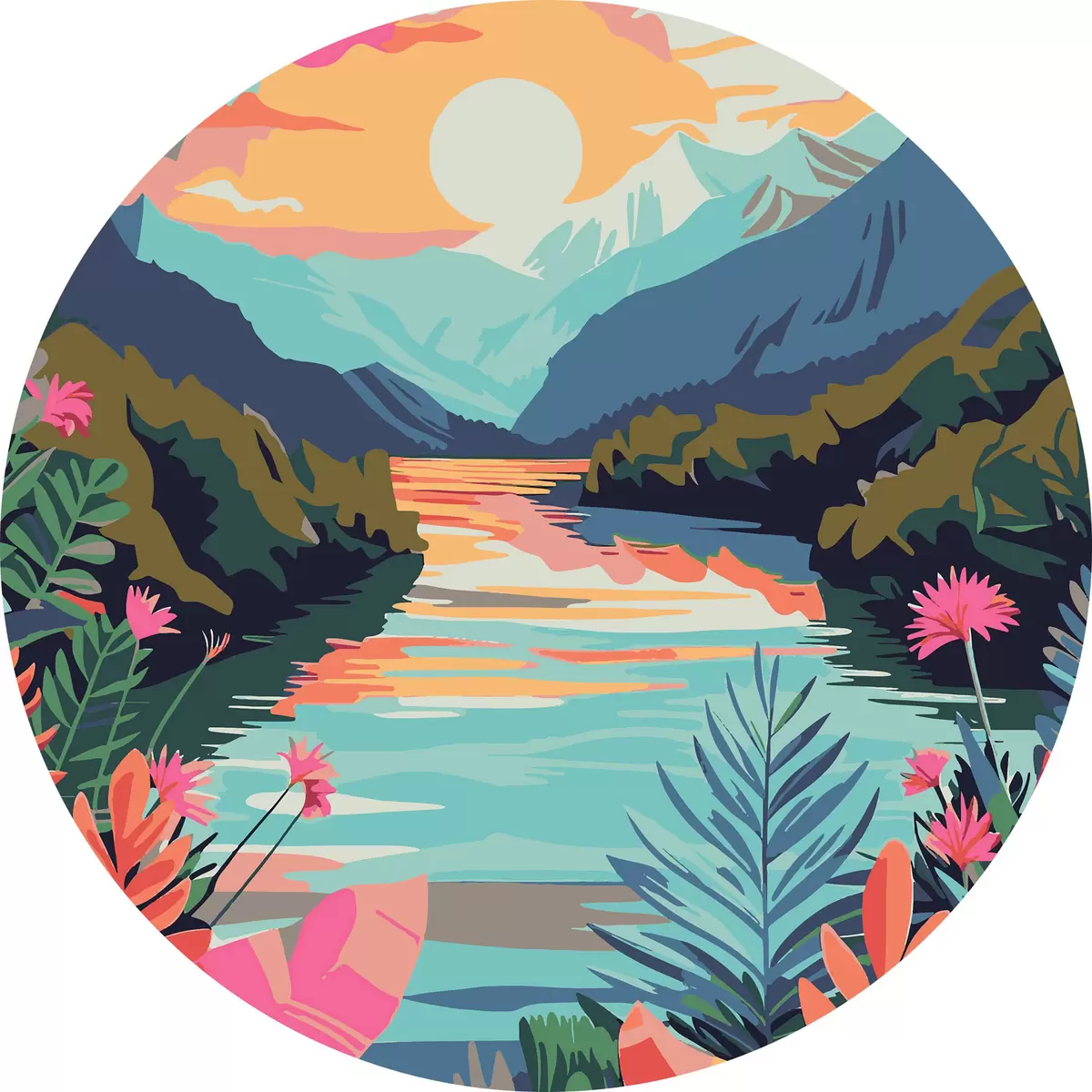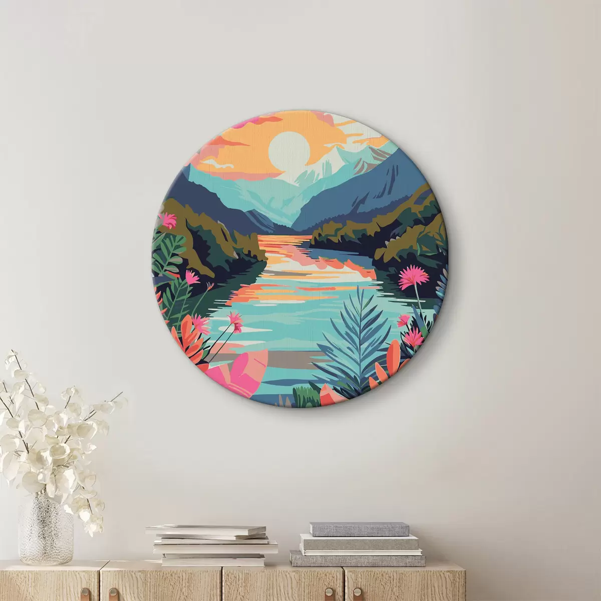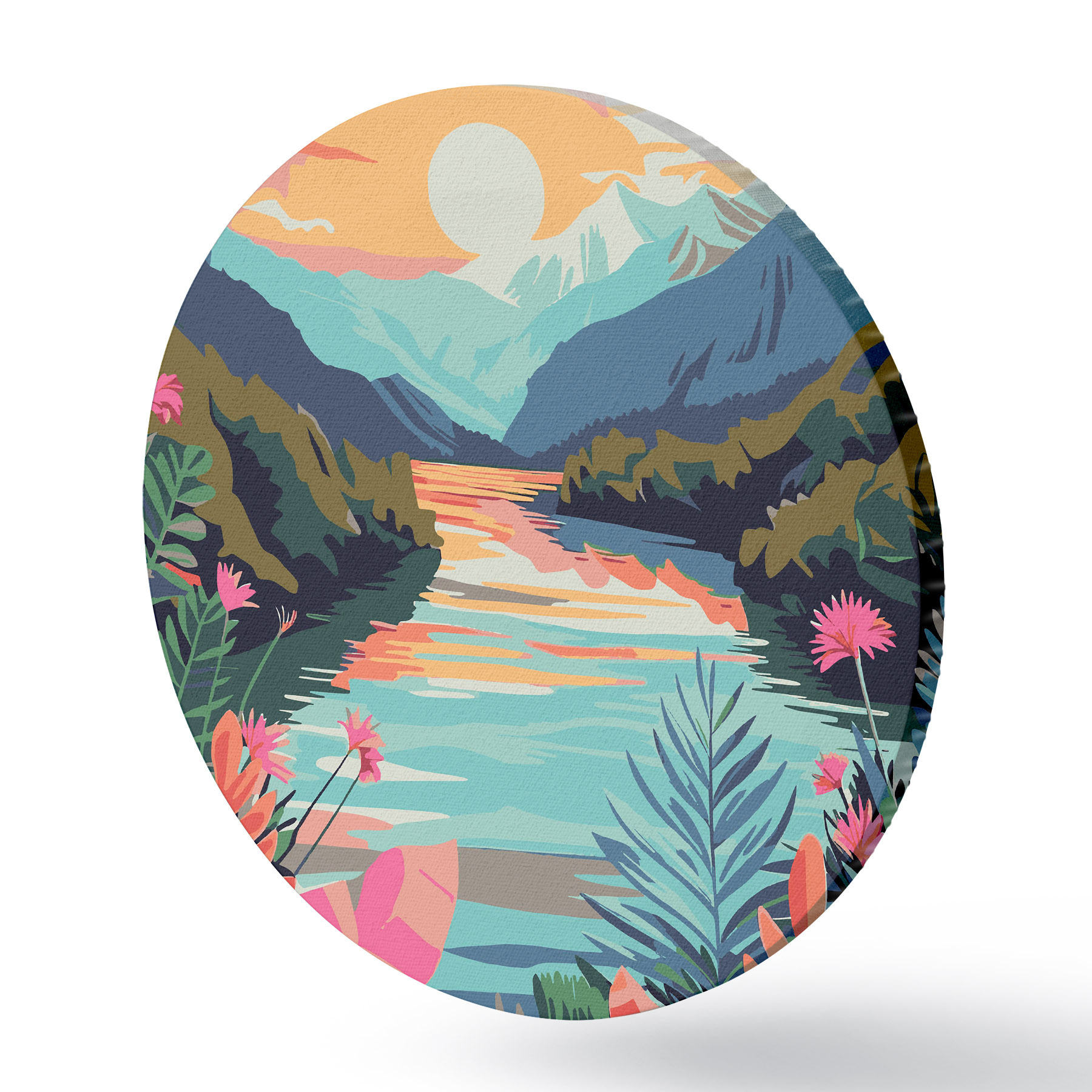 Quadri rotondi Fiume con fiori e montagne sullo sfondo r38266