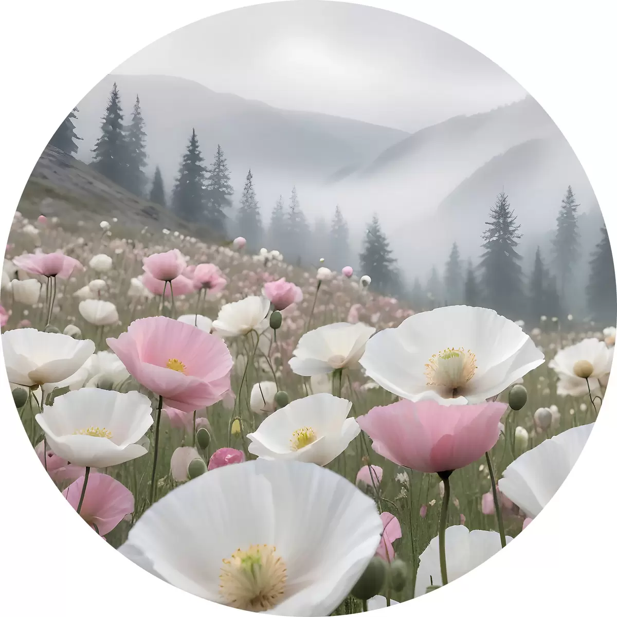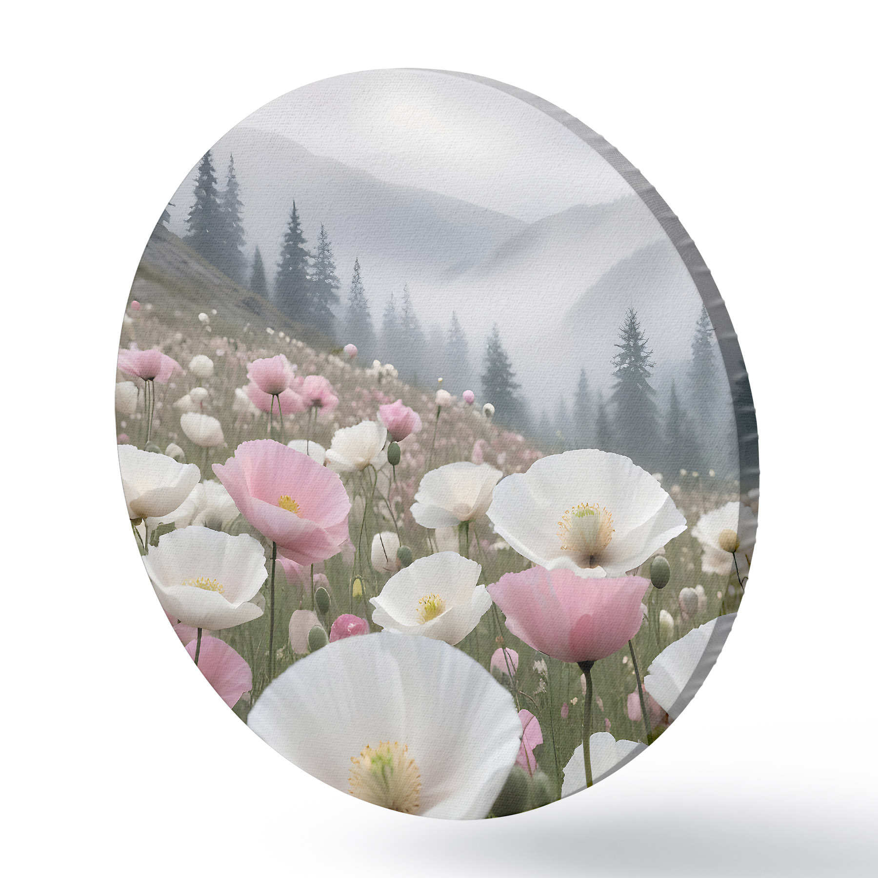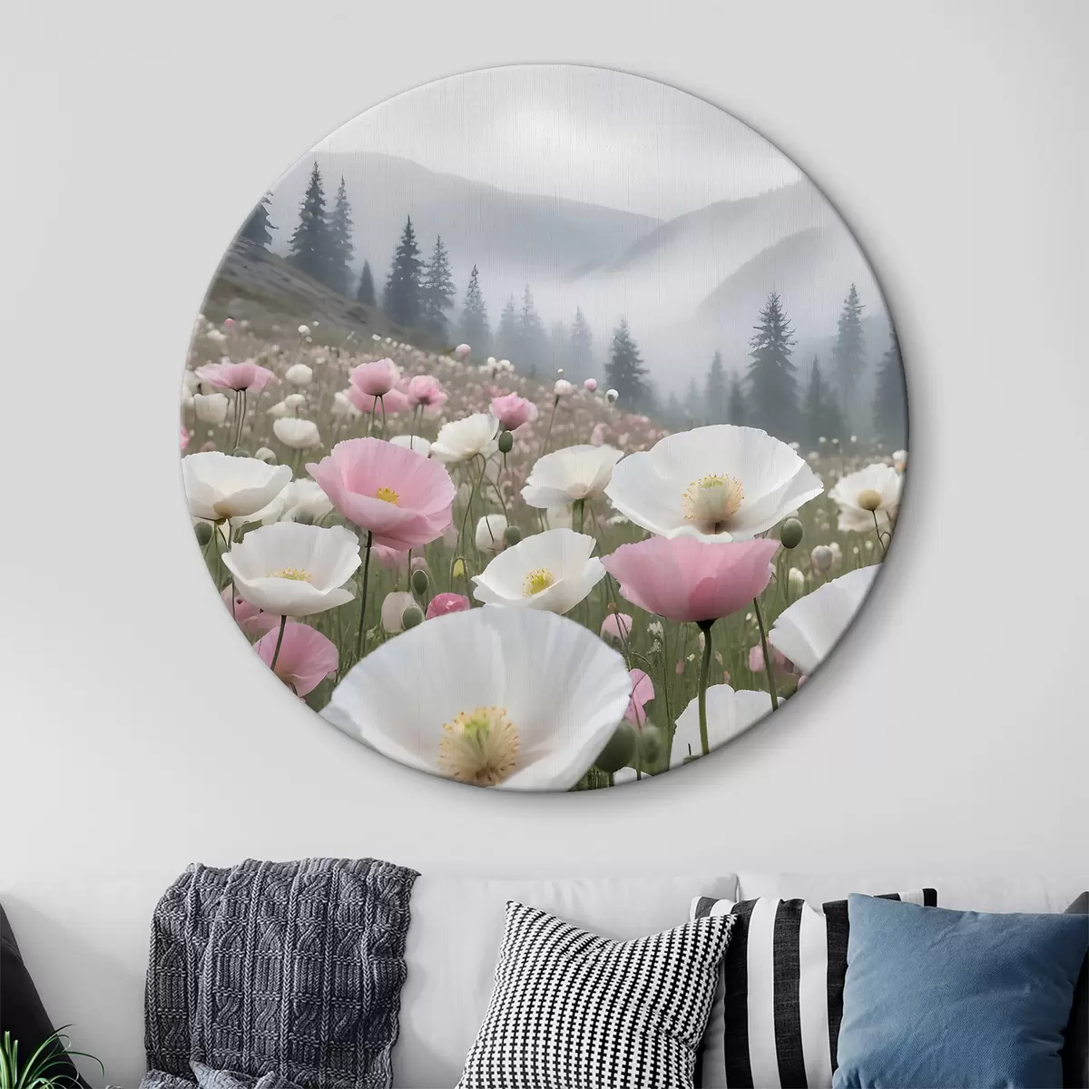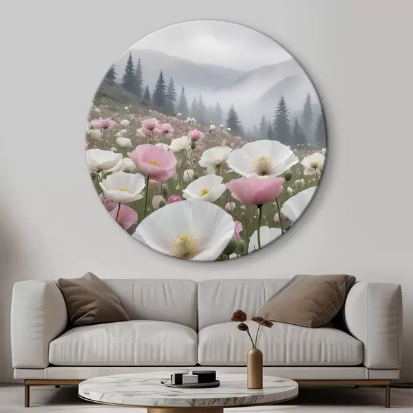 Quadri rotondi Un campo di papaveri rosa e bianchi nel paesaggio montano sullo sfondo r38369