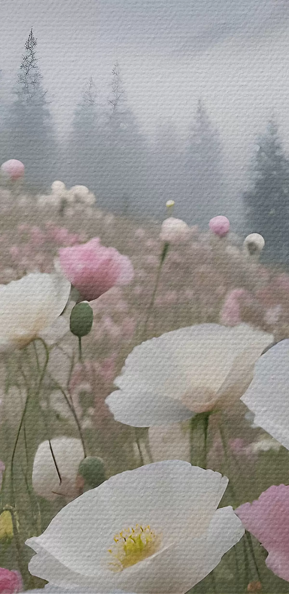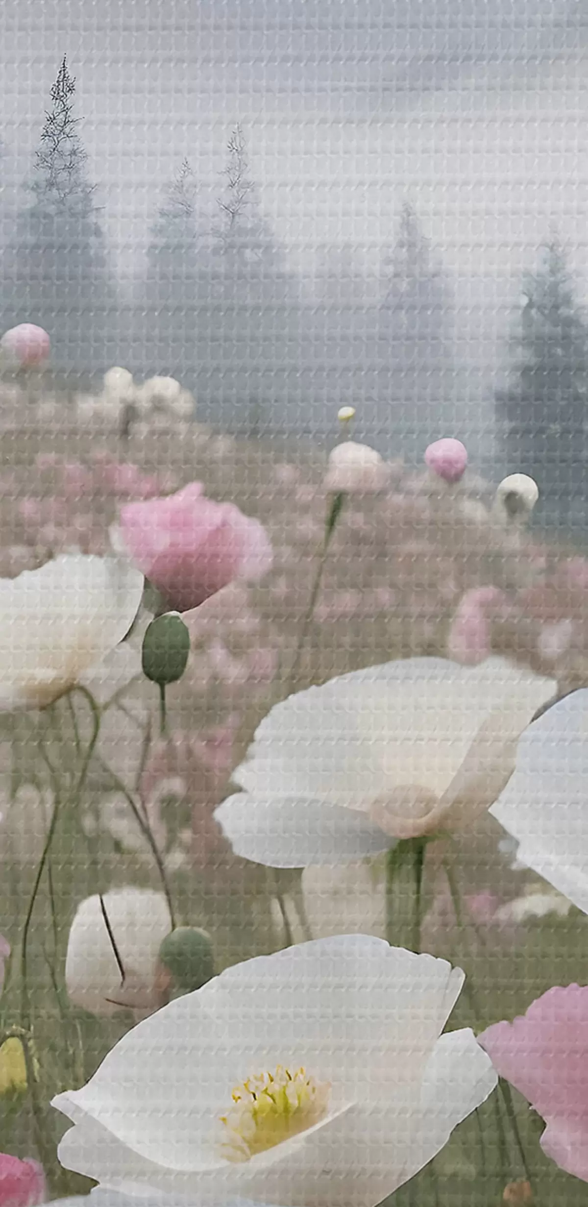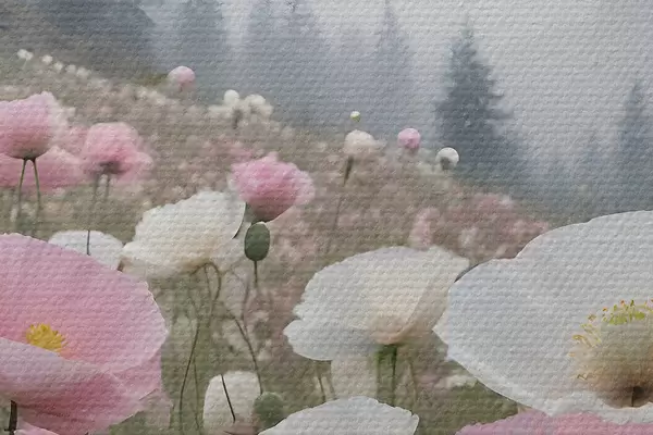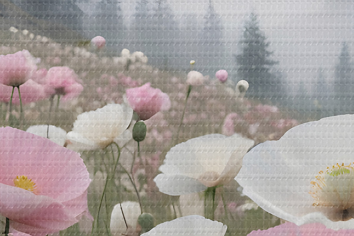 Immagine Un campo di papaveri rosa e bianchi nel paesaggio montano sullo sfondo Nr r38369