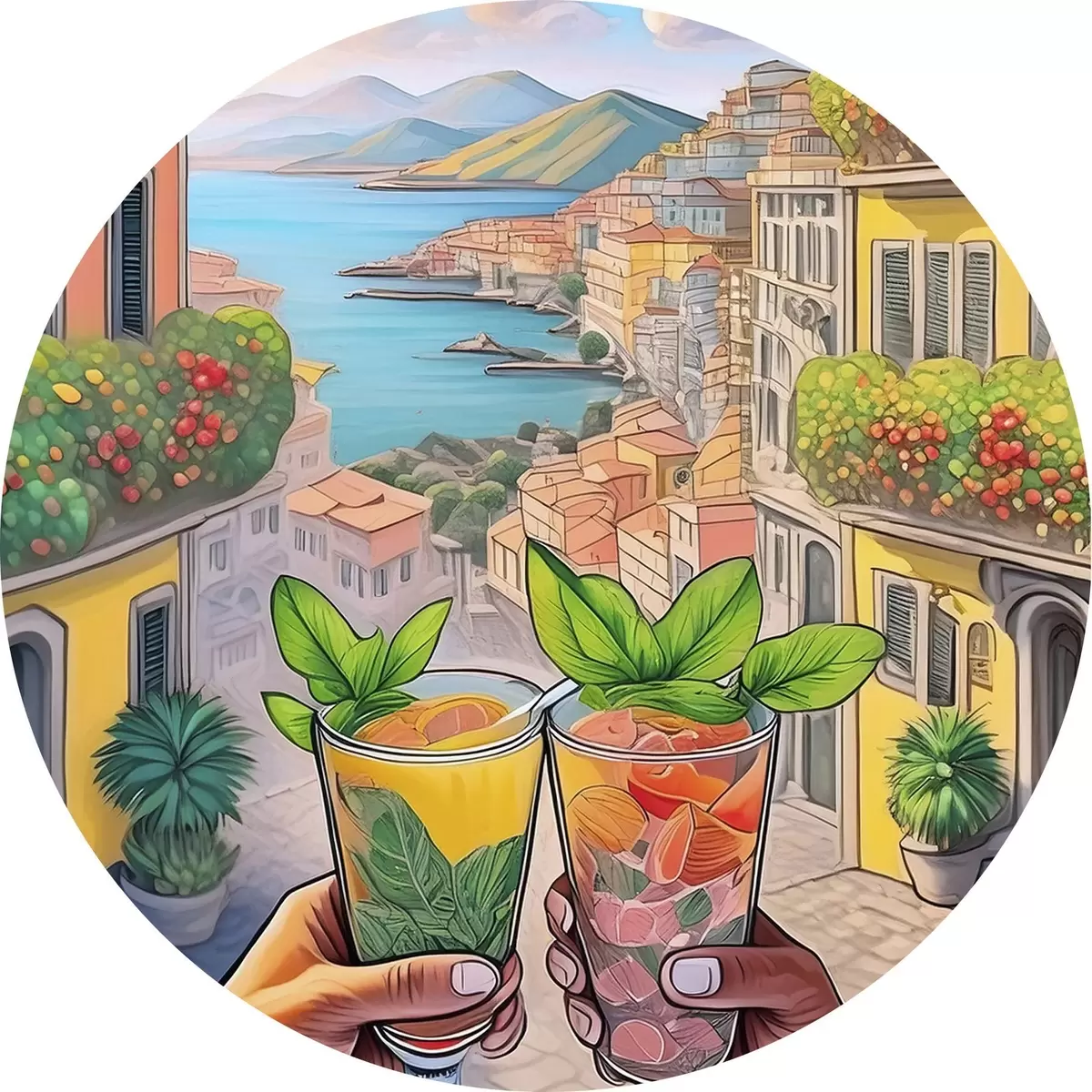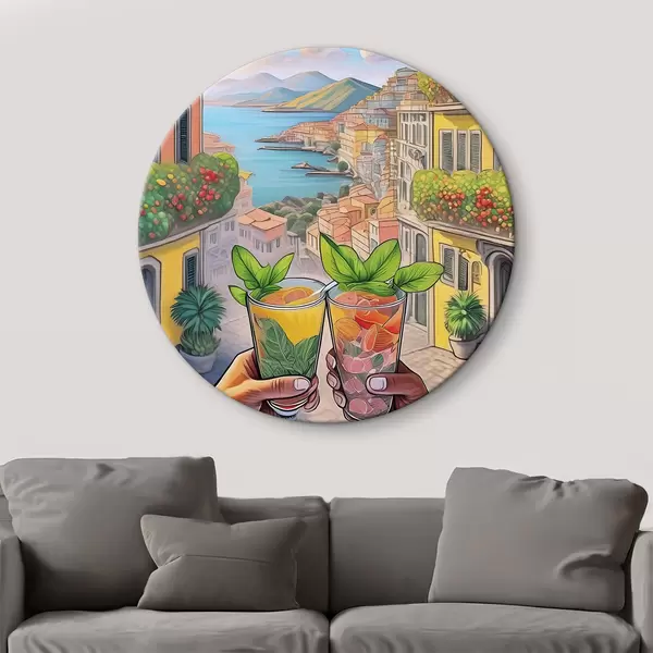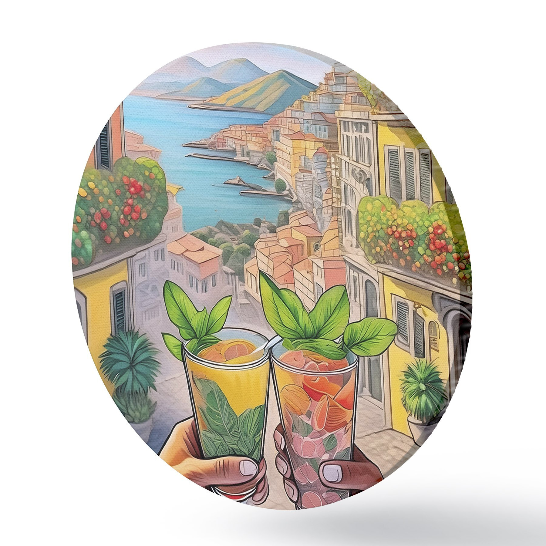 Quadri rotondi Città italiana, costa del mare, cocktail, vocazione, architettura, estate, acquerello r38392