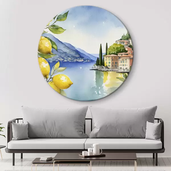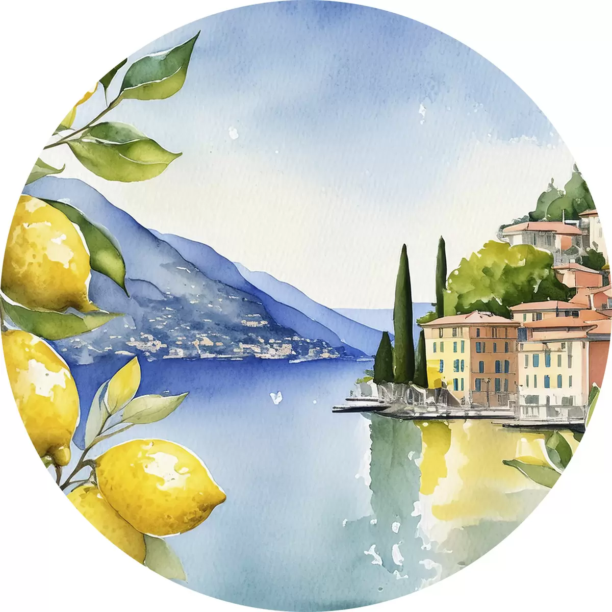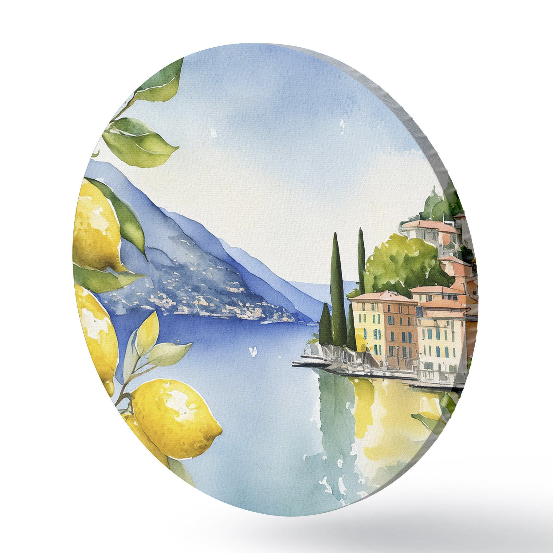 Quadri rotondi Lago italiano, estate, acquerello, paesaggio naturale, limoni, architettura cittadina r38394