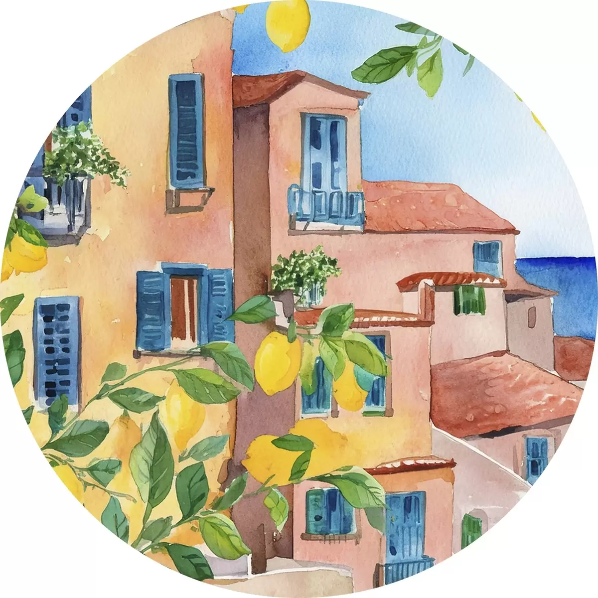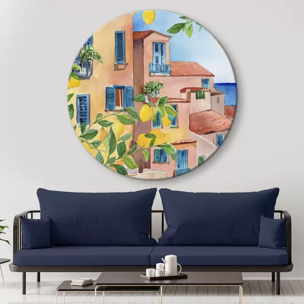 Quadri rotondi Architettura della città italiana, costa del mare, estate, acquerello, albero di limone r38395