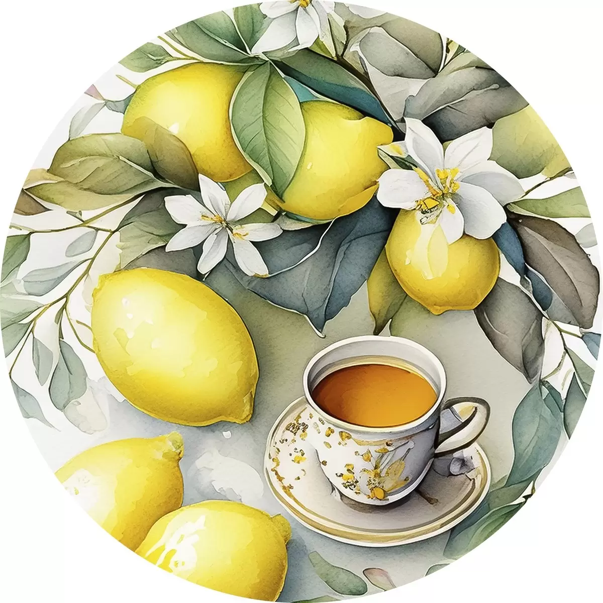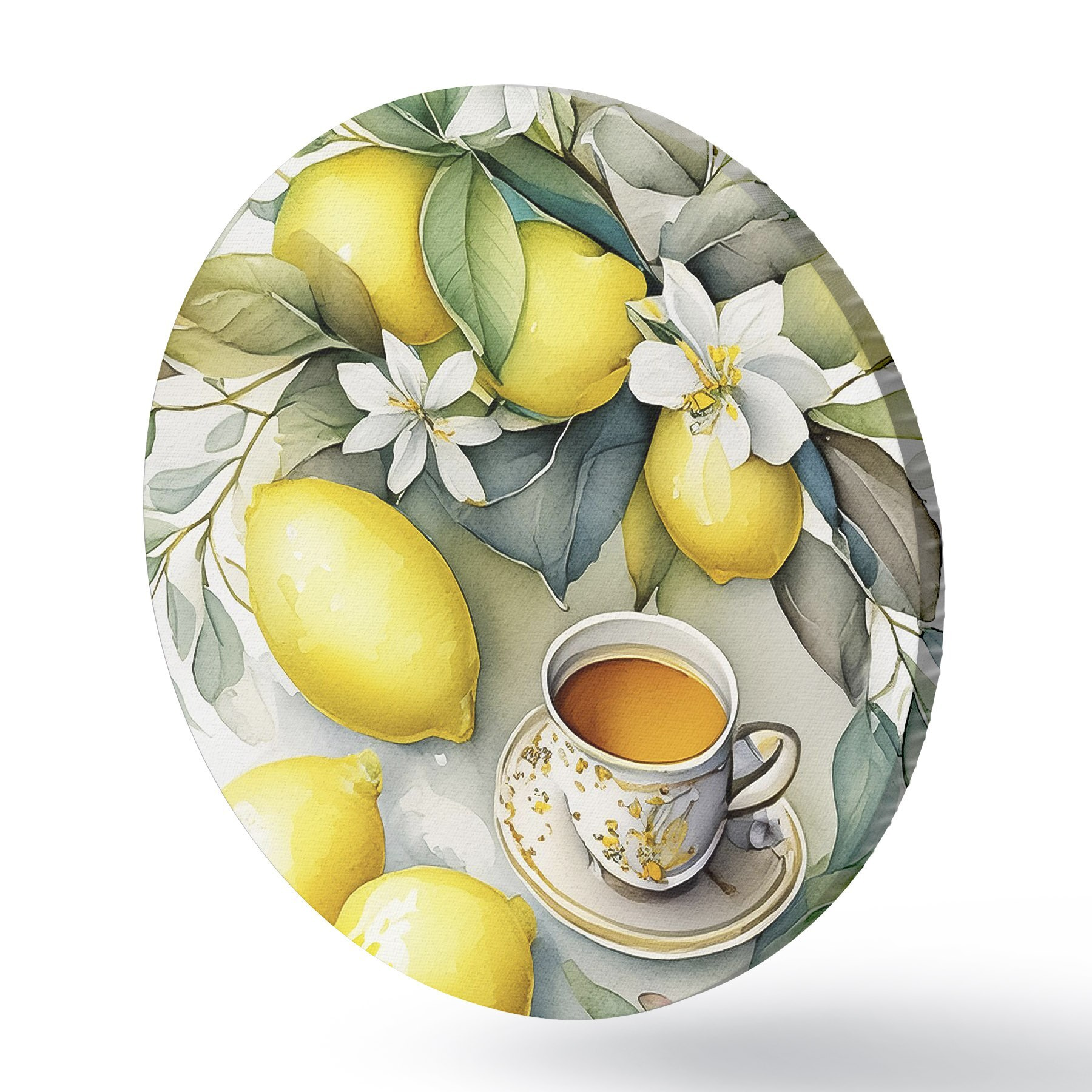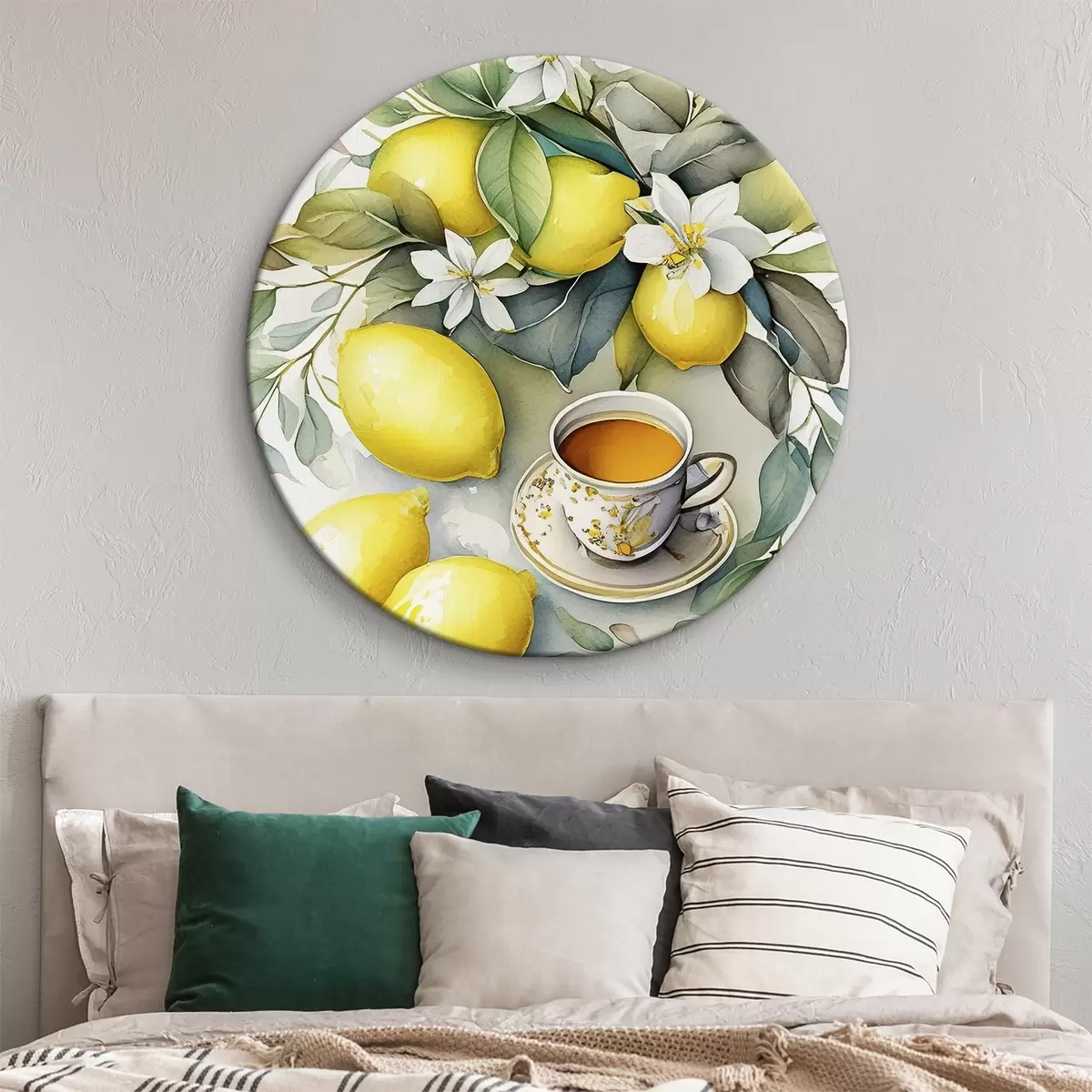 Quadri rotondi Limoni e fiori, acquerello, colazione, tazza di tè, stile bohémien r38403