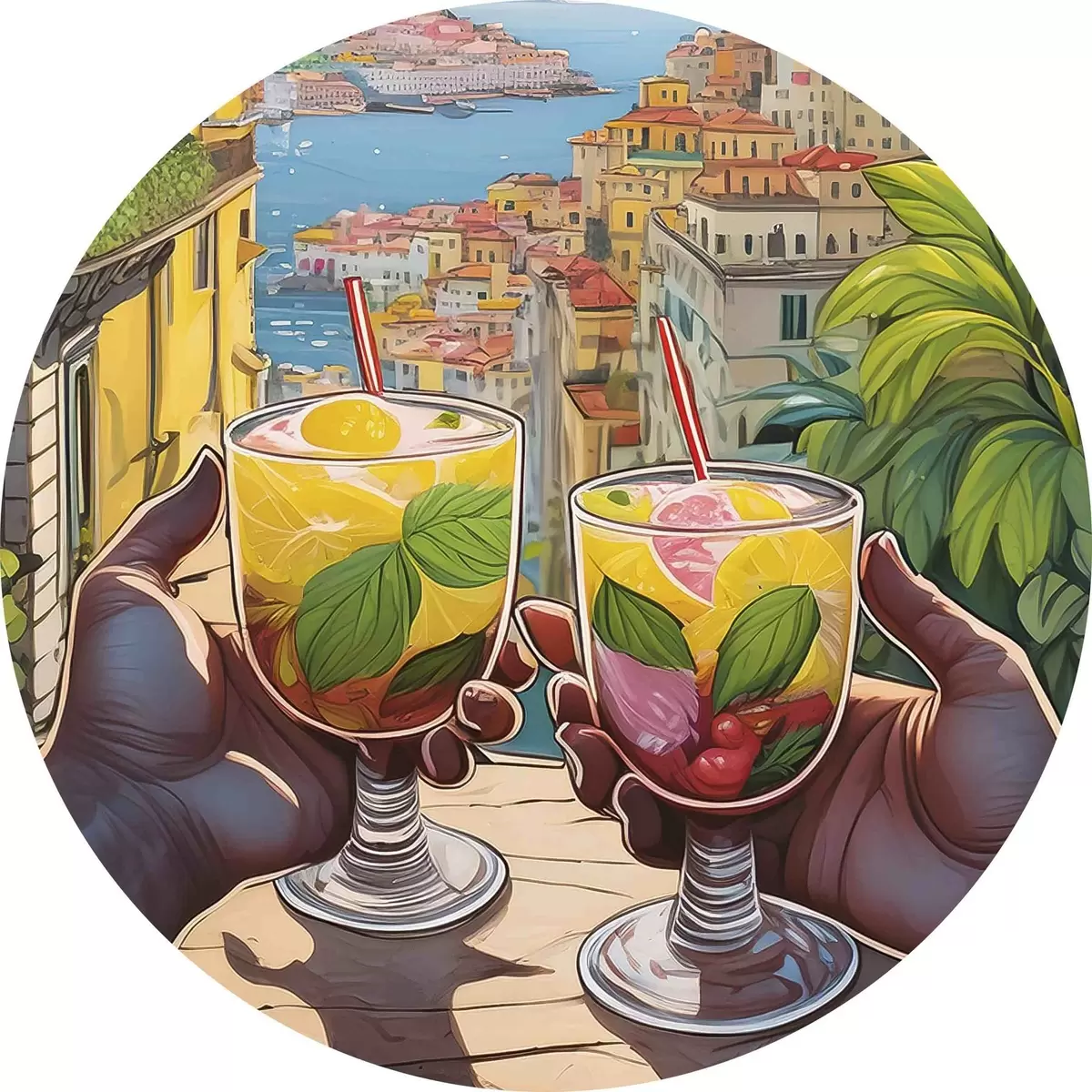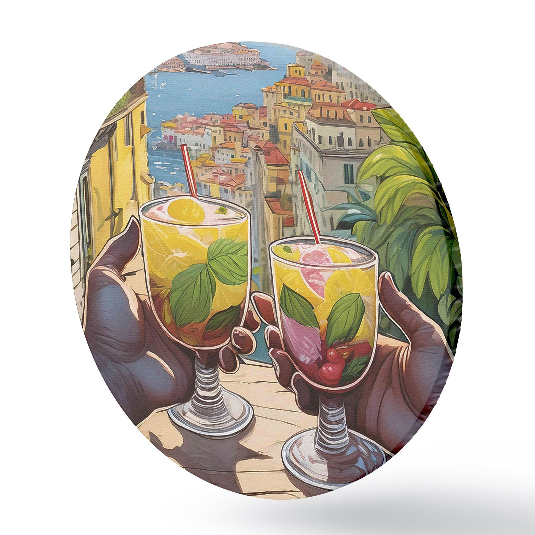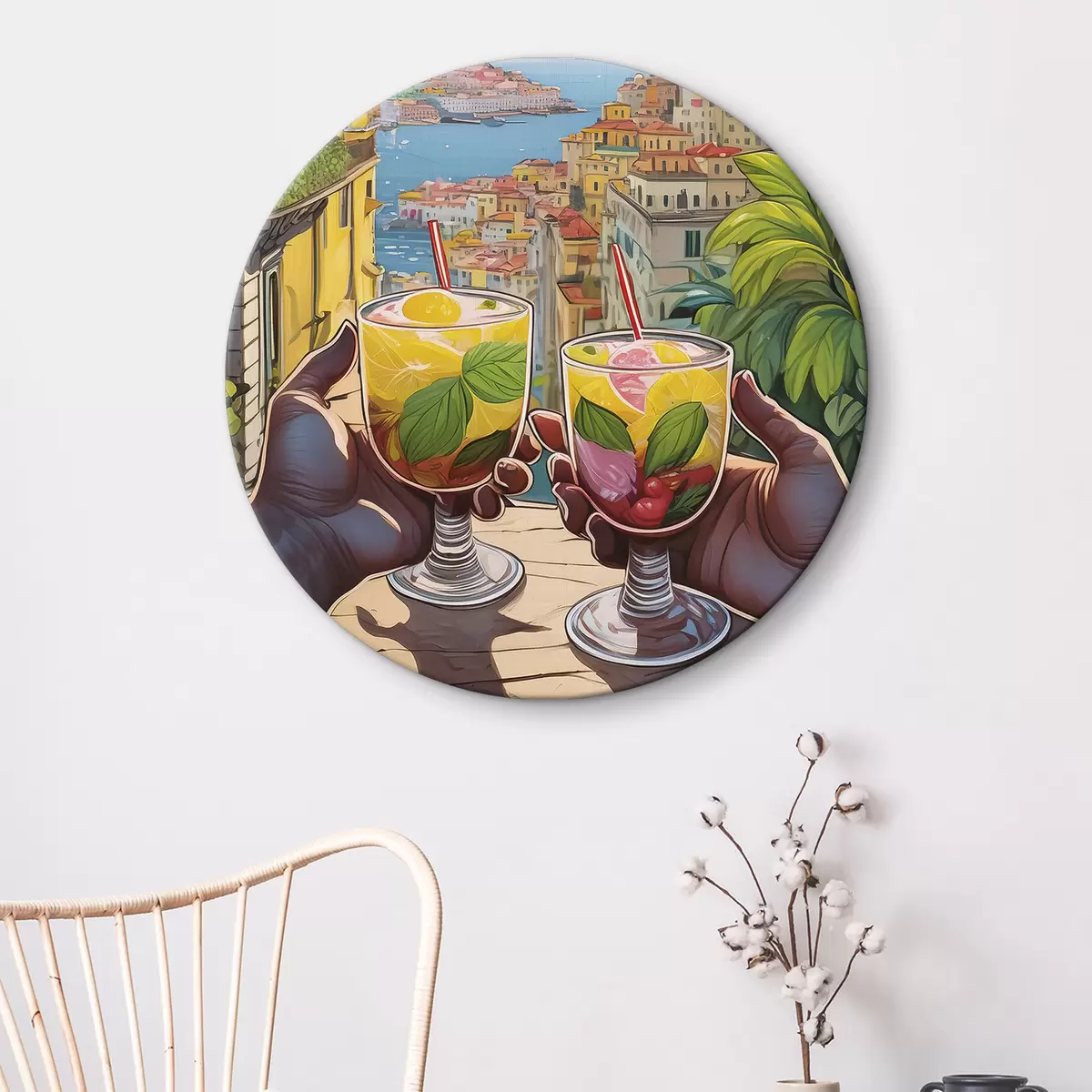 Quadri rotondi Coppia di mani che reggono bicchieri con frutta e foglie r38405