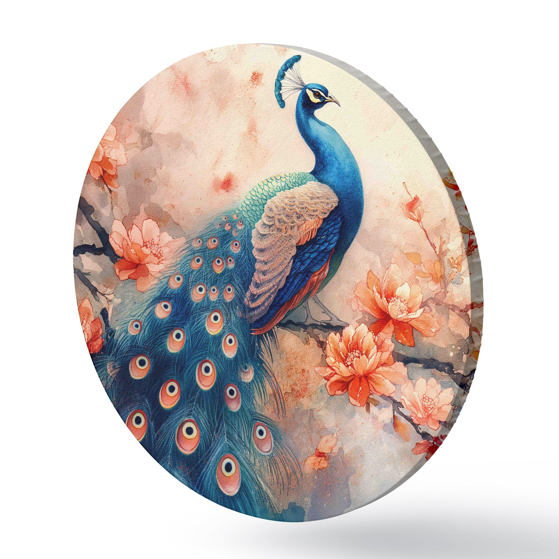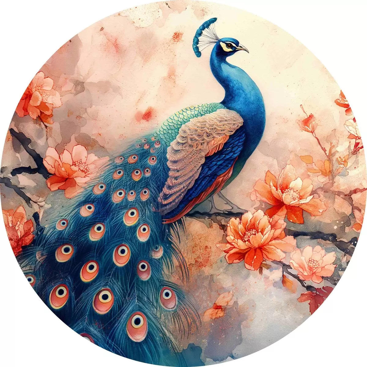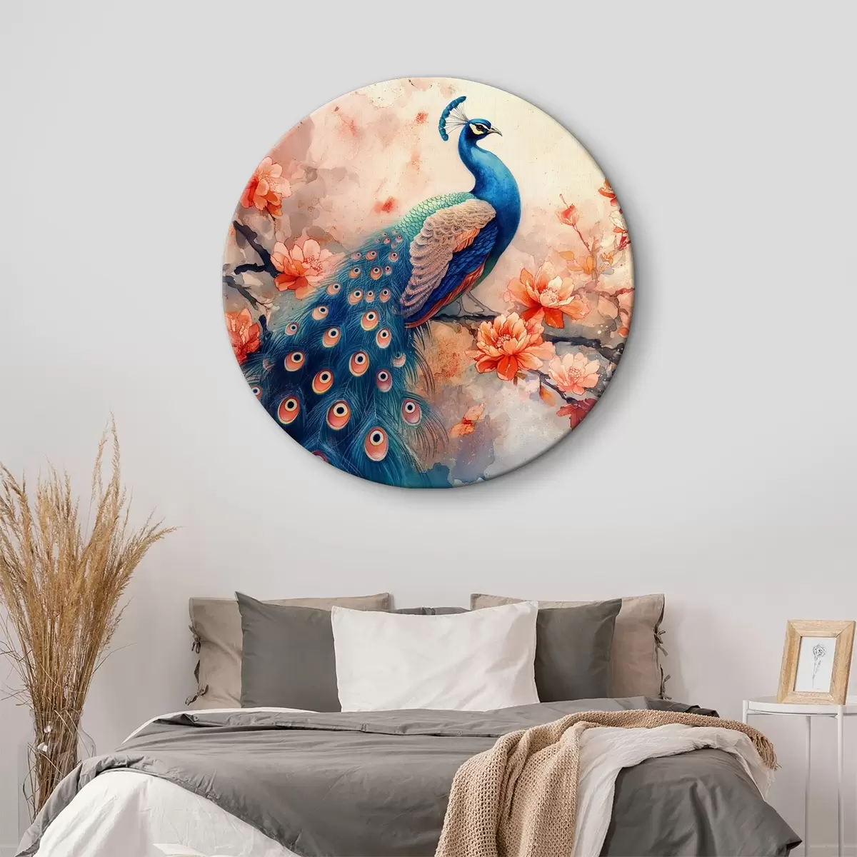 Quadri rotondi Un dipinto raffigurante un pavone su un ramo con fiori r38455