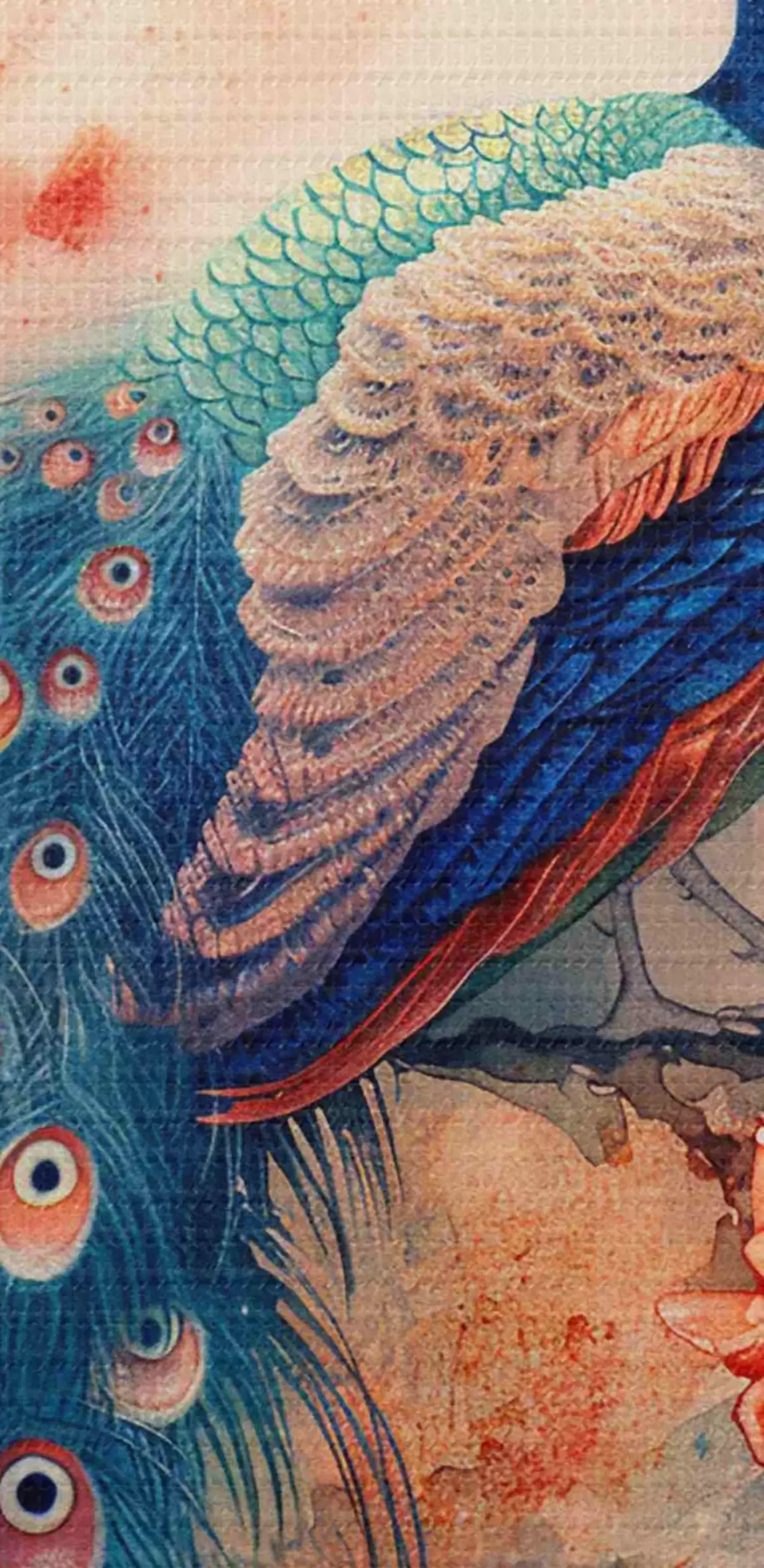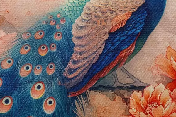 Immagine Un dipinto raffigurante un pavone su un ramo con fiori Nr r38455