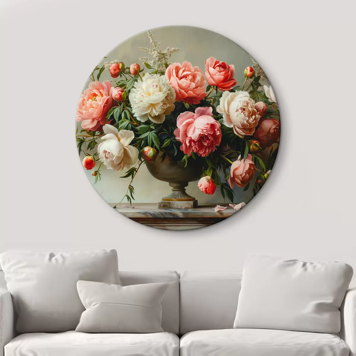 Quadri rotondi Un lussureggiante bouquet di peonie e un vaso nero r38460