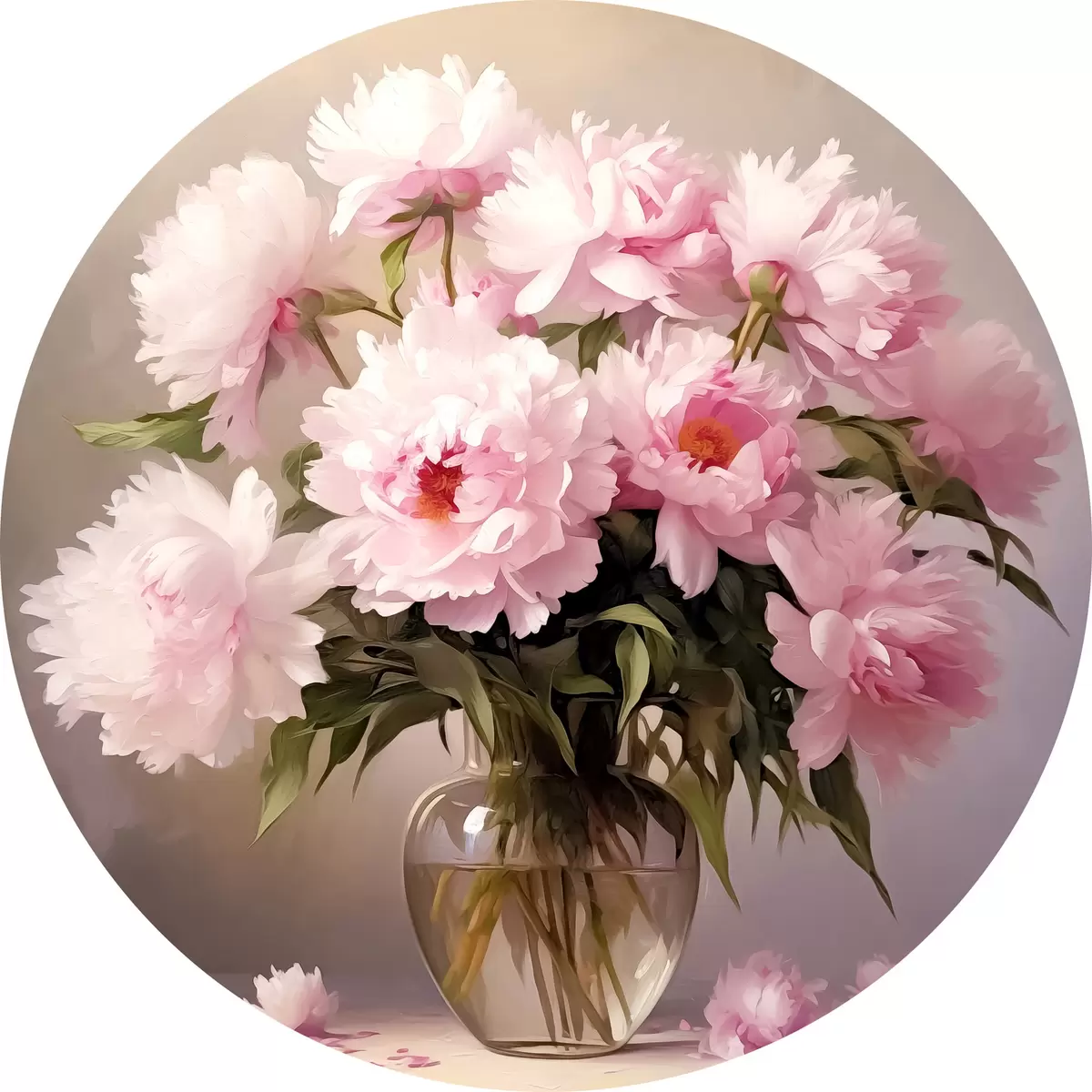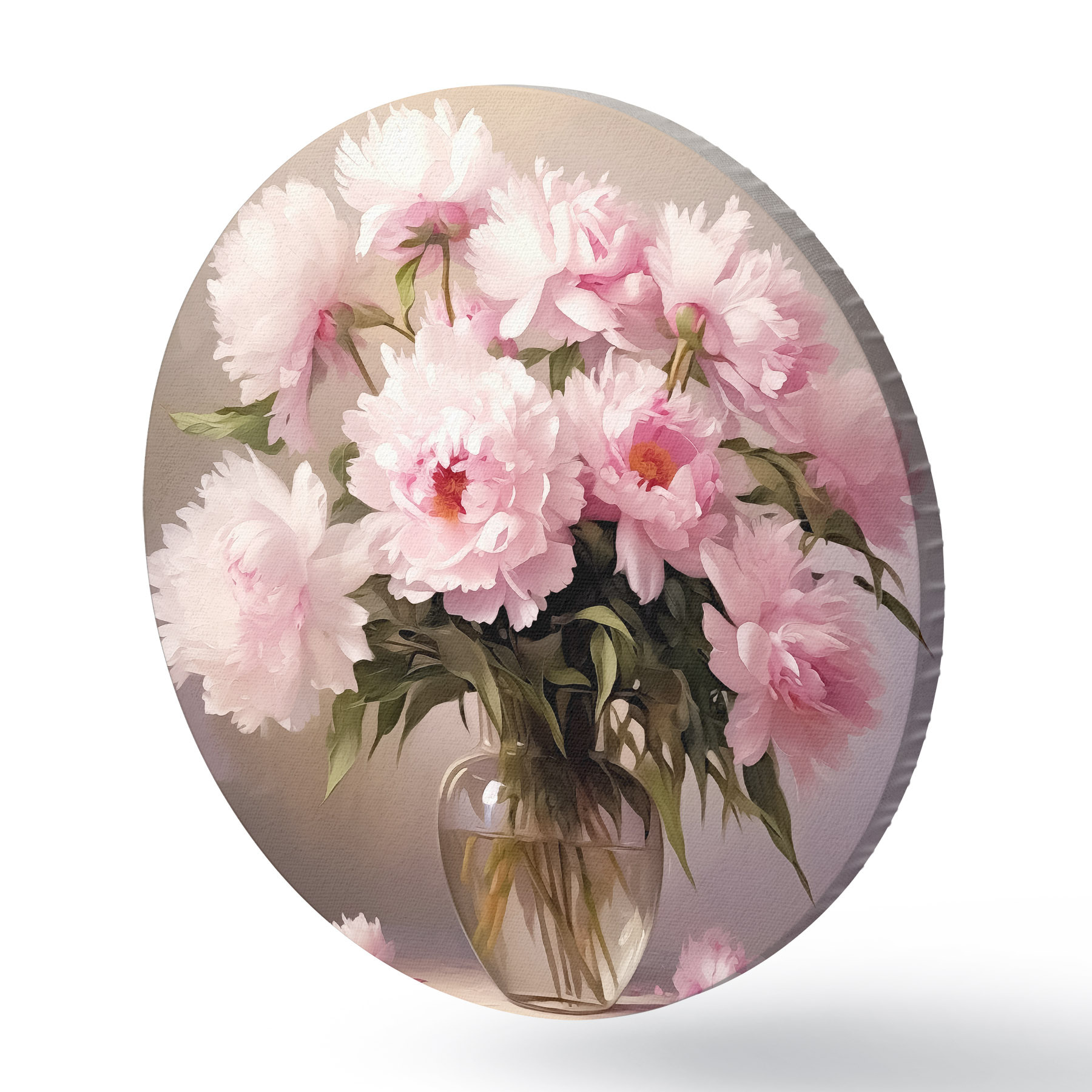 Quadri rotondi Peonie rosa in un vaso di vetro su sfondo nero, pittura a olio imitazione, fiori r38482